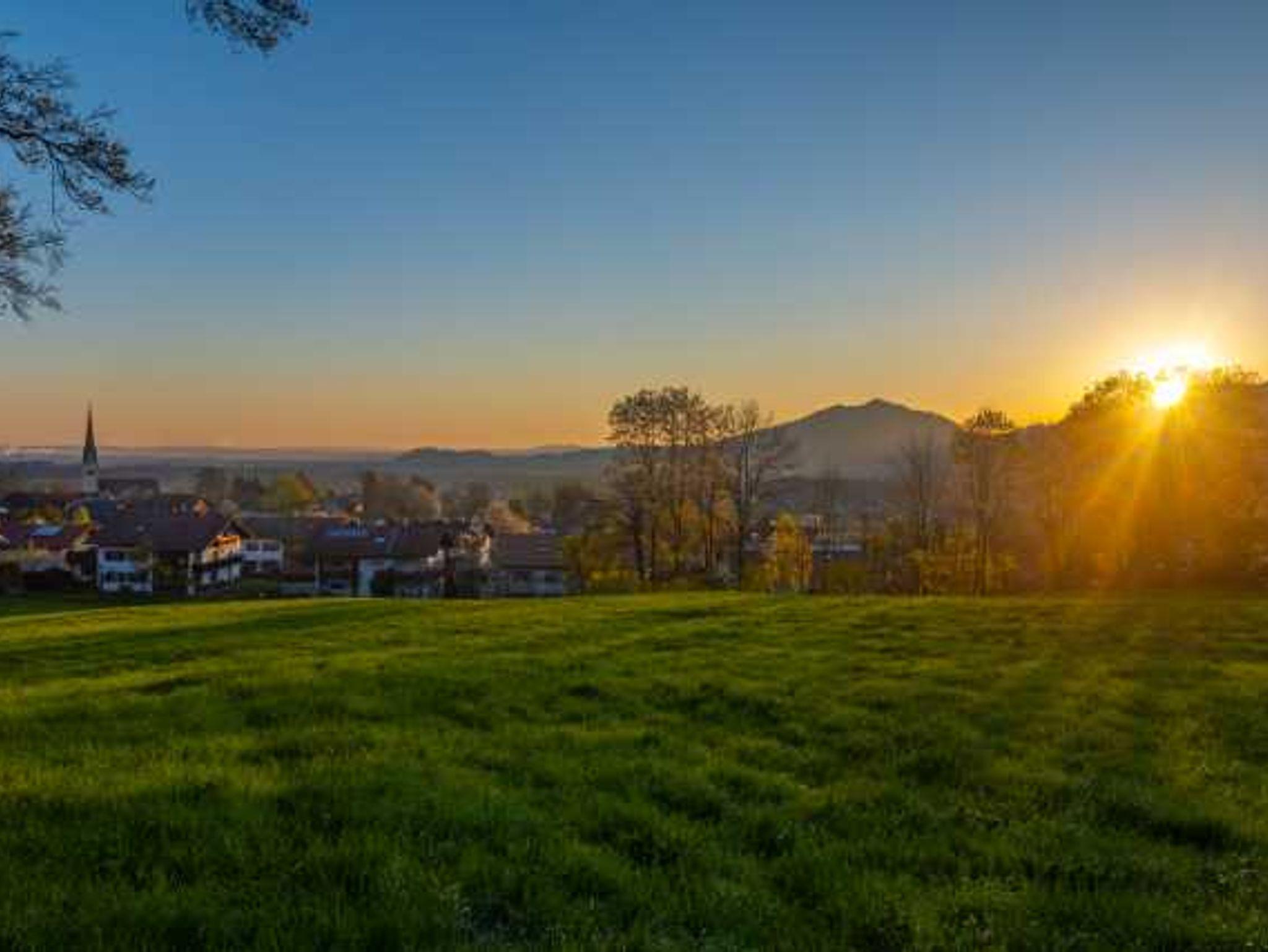 Es gibt eine Essecke im Zimmer und eine auf dem Balkon. Der Balkon liegt auf der Westseite unseres Hauses, mit Blick auf den Sulzberg und das Dorf mit Schloss.