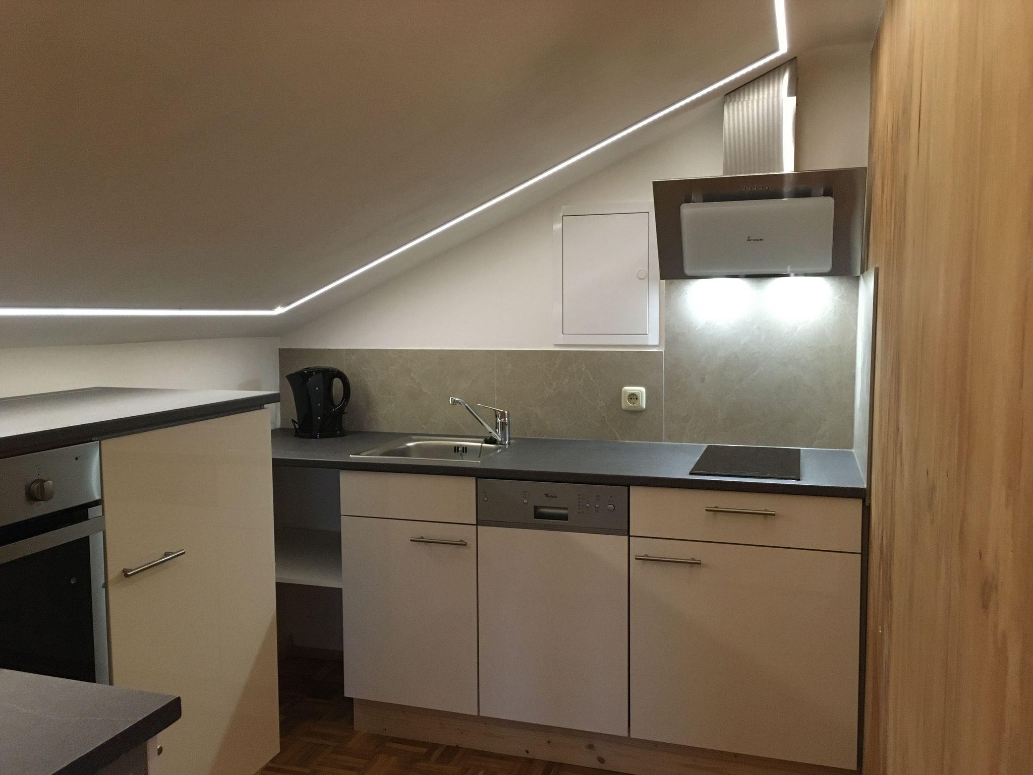 Küche, ausgestattet mit Herd, Kühlschrank, Kaffeemaschine, Spülmaschine etc.