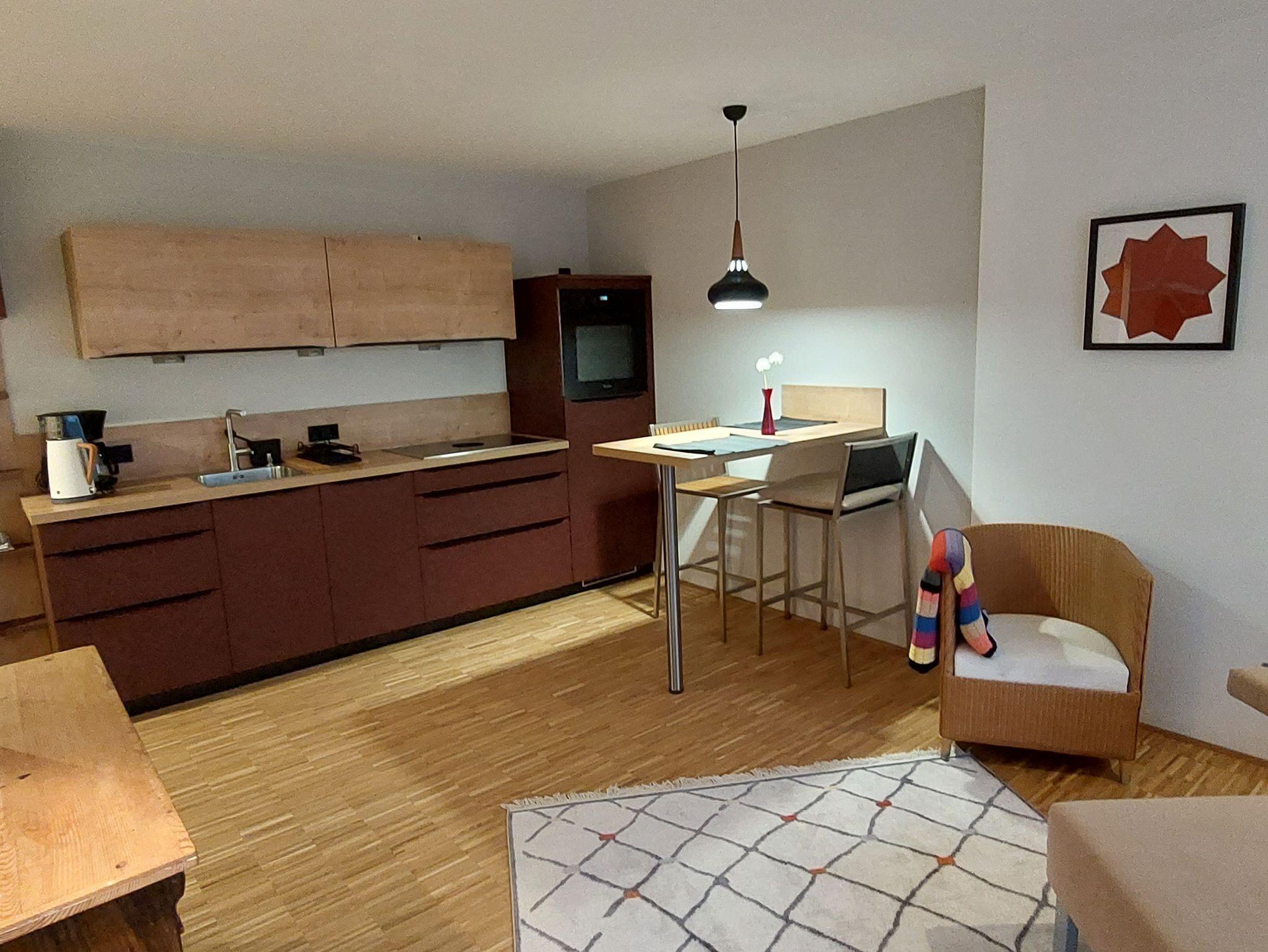 Unser 1 Zimmer-Appartement mit offenem Wohn- und Schlafraum (140 cm Bett) bietet Platz für 1-2 Personen. Die hochwertige Küchenausstattung (u.a. Induktionskochfeld, Geschirrspüler und Bora-Abzug), sowie die Ausstattung des Bades (Spülautomatik-Sensor und Regendusche) lassen keine Wünsche offen. Das Wohnambiente mit Sitztheke und Sofaliege, sowie ein kleiner Terrassenbereich laden zum Verweilen ein. Gerne kann auch unser großzügiger Obstgarten mit Blick auf die umliegenden Berge zum Entspannen genutzt werden.