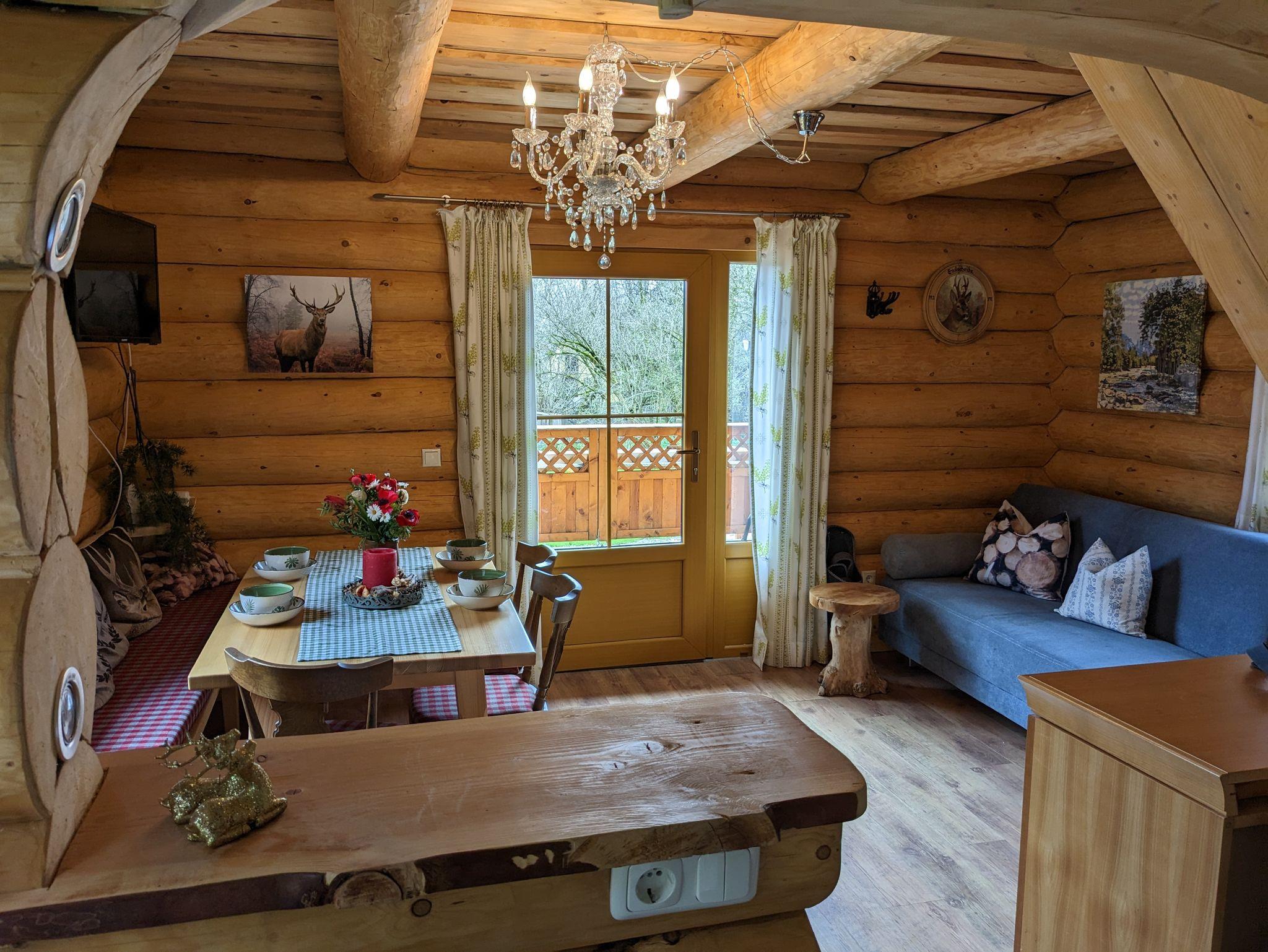 Ferienwohnung Schloßalm: Das Blockhaus ist ein wunderschönes Holzhaus mit Terrasse und Garten. Die liebevolle Einrichtung und die Landhausküchenzeile laden zum Verweilen ein. Für Gruppen bis zu 9 Personen können beide Ferienwohnungen Hirsch und Fuchsbau im Souterrain gebucht werden. Jede FW hat einen separaten Eingang und einen Parkplatz am Haus sowie eine Terrasse zum Garten.