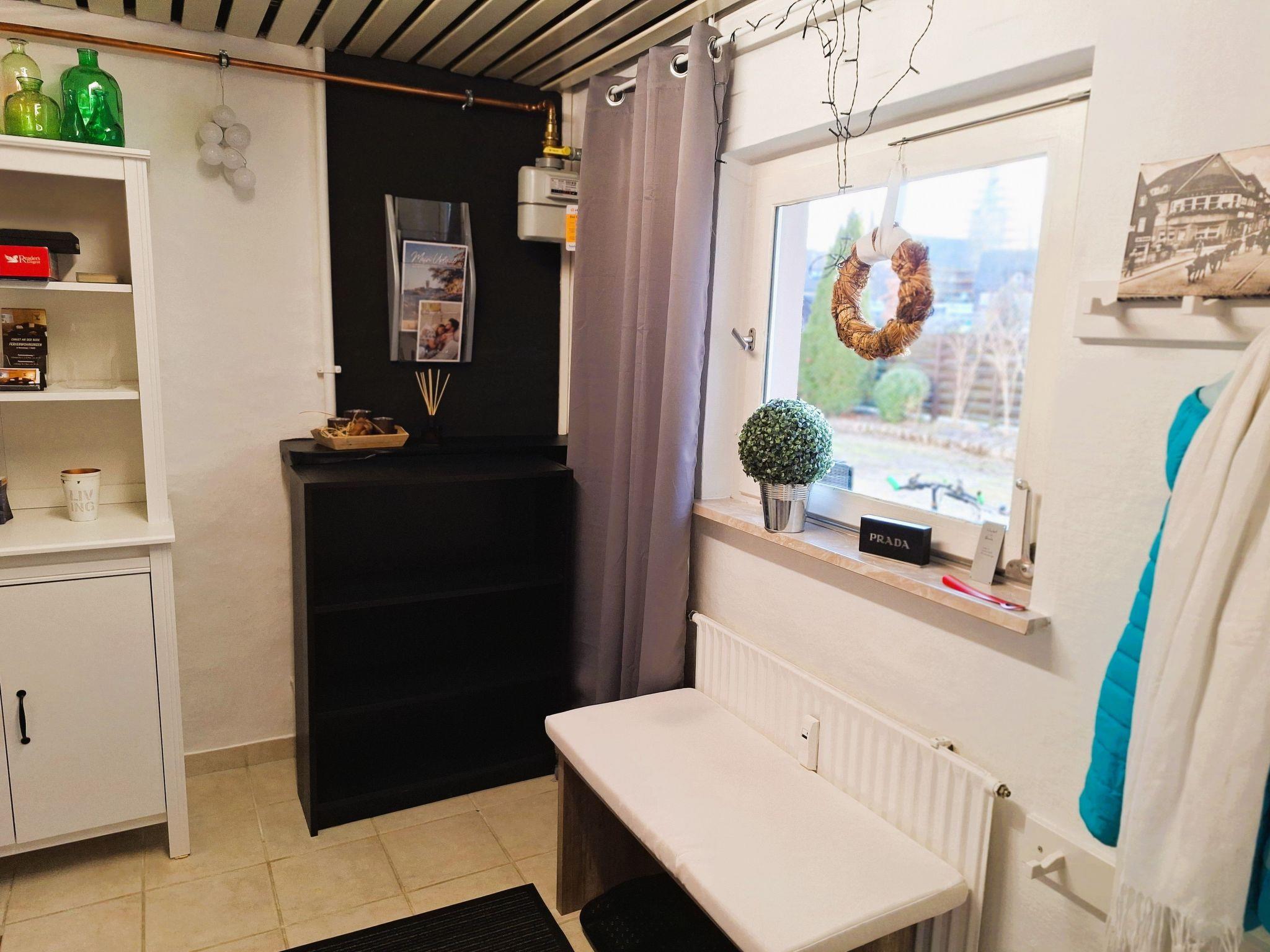 Inside, you will find a lovingly designed living room with a cosy dining area and a practically equipped fitted kitchen with a 2-ring hob, filter coffee machine and kettle. The bedroom with a high-quality box-spring bed promises restful nights after an eventful day in the Harz countryside. With a sensible room layout over 40 square metres, this holiday flat is an ideal retreat.