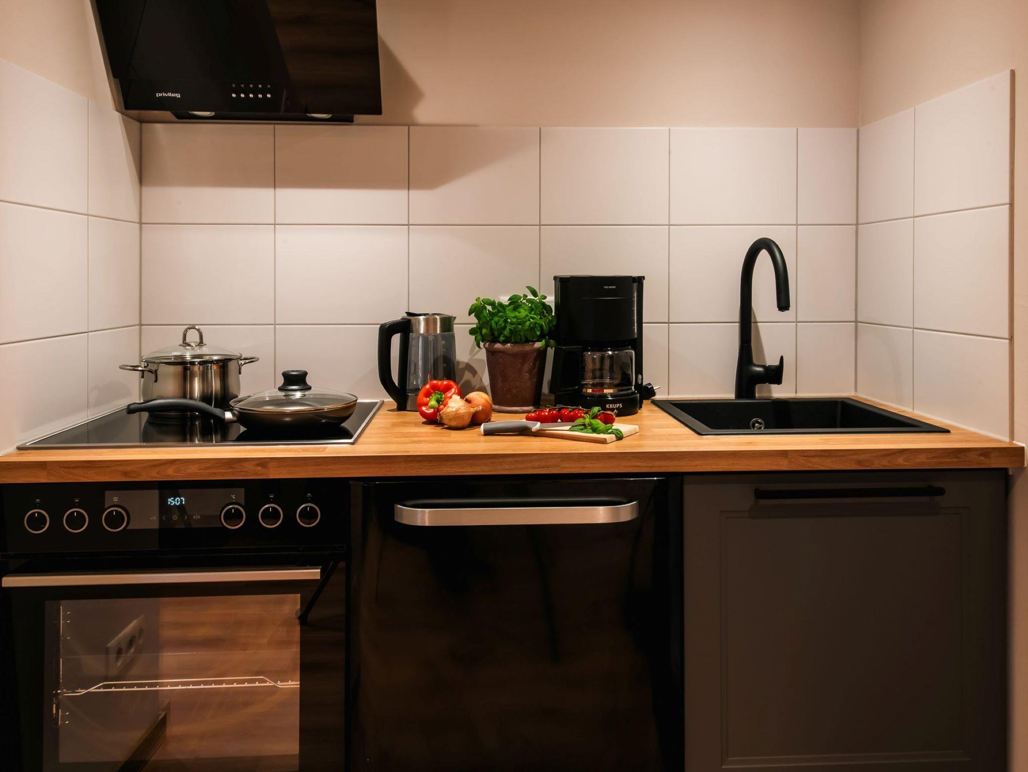 Küchenzeile mit Cerankochfeld, Mikrowelle, Kühlschrank uvm., Essecke,