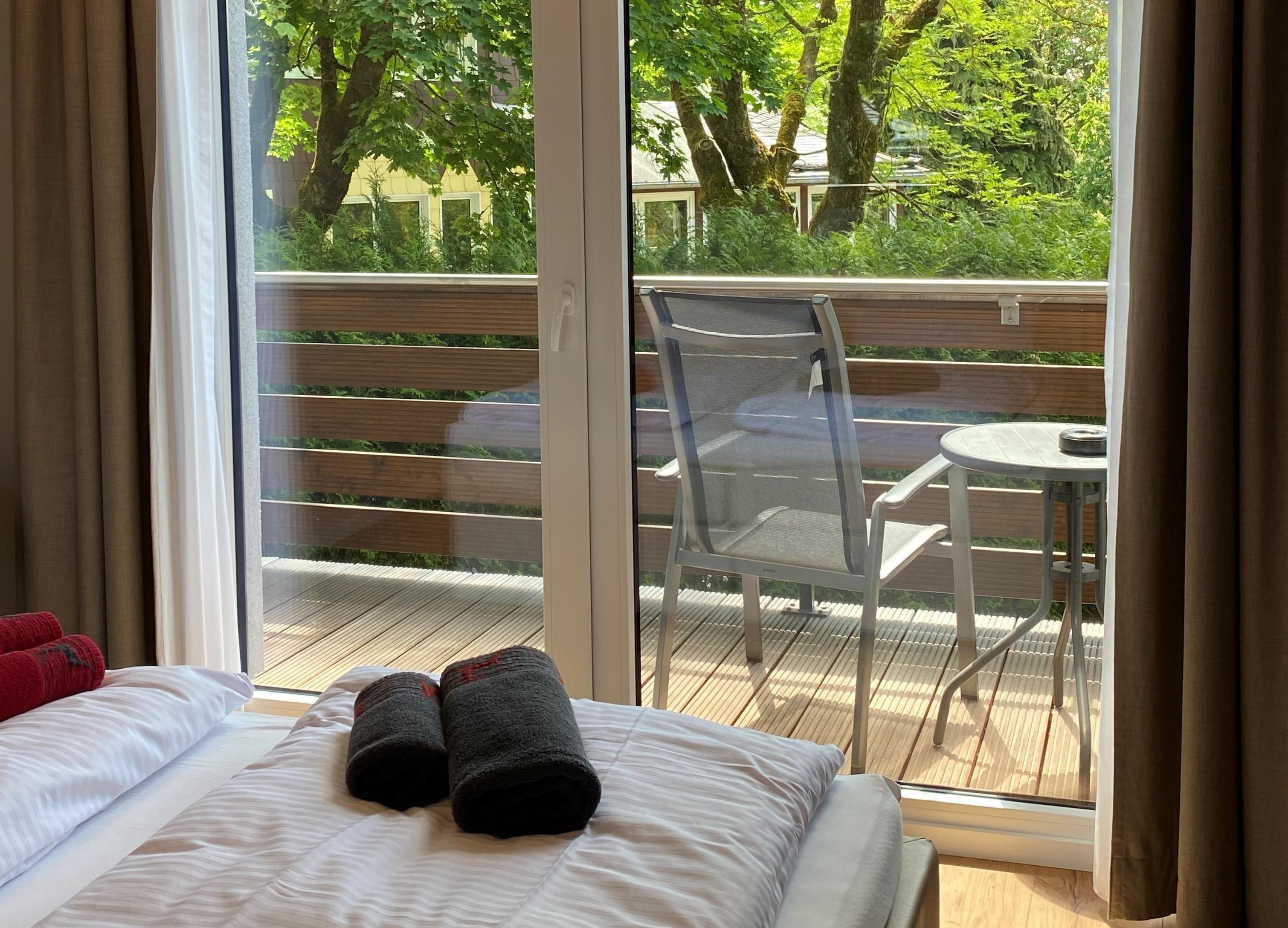 Dieses Doppelzimmer ist nach Süden ausgerichtet, hat einen großen Balkon mit Blick in den Garten und liegt im Erdgeschoss. In diesem Zimmer sind Hunde erlaubt. Das Zimmer ist modern und neu eingerichtet. Es verfügt über eine Regendusche mitten im Zimmer und einen Philips-LED-Fernseher mit Ambilight.