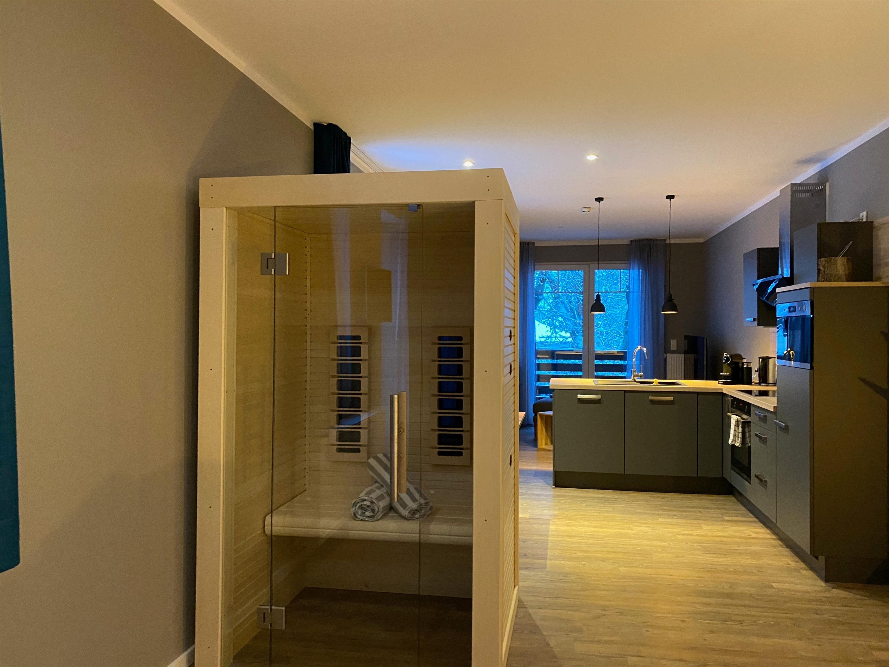 Dieses Luxusloft befindet sich im Erdgeschoss, ist für 2 Personen ausgelegt und ca. 54 qm groß. Es verfügt über einen zusammenhängenden Wohn-Essbereich und Schlafzimmer. Das Loft verfügt über eine Infrarot-Kabine und 1 Bad mit Doppelwaschtisch und Regendusche. Vom Südbalkon haben Sie einen Blick in den Garten. Es ist eine hochwertige Küche mit Geschirrspüler, Backofen und Ceran-Kochfeld verbaut. Die Ausstattung der Küche lässt keine Wünsche offen, u. a. finden Sie eine Auswahl an Gewürzen vor. Das Doppelbett verfügt auf der rechten Seite über eine Matratze mit Härtegrad 3 und auf der linken Seite mit Härtegrad 4.