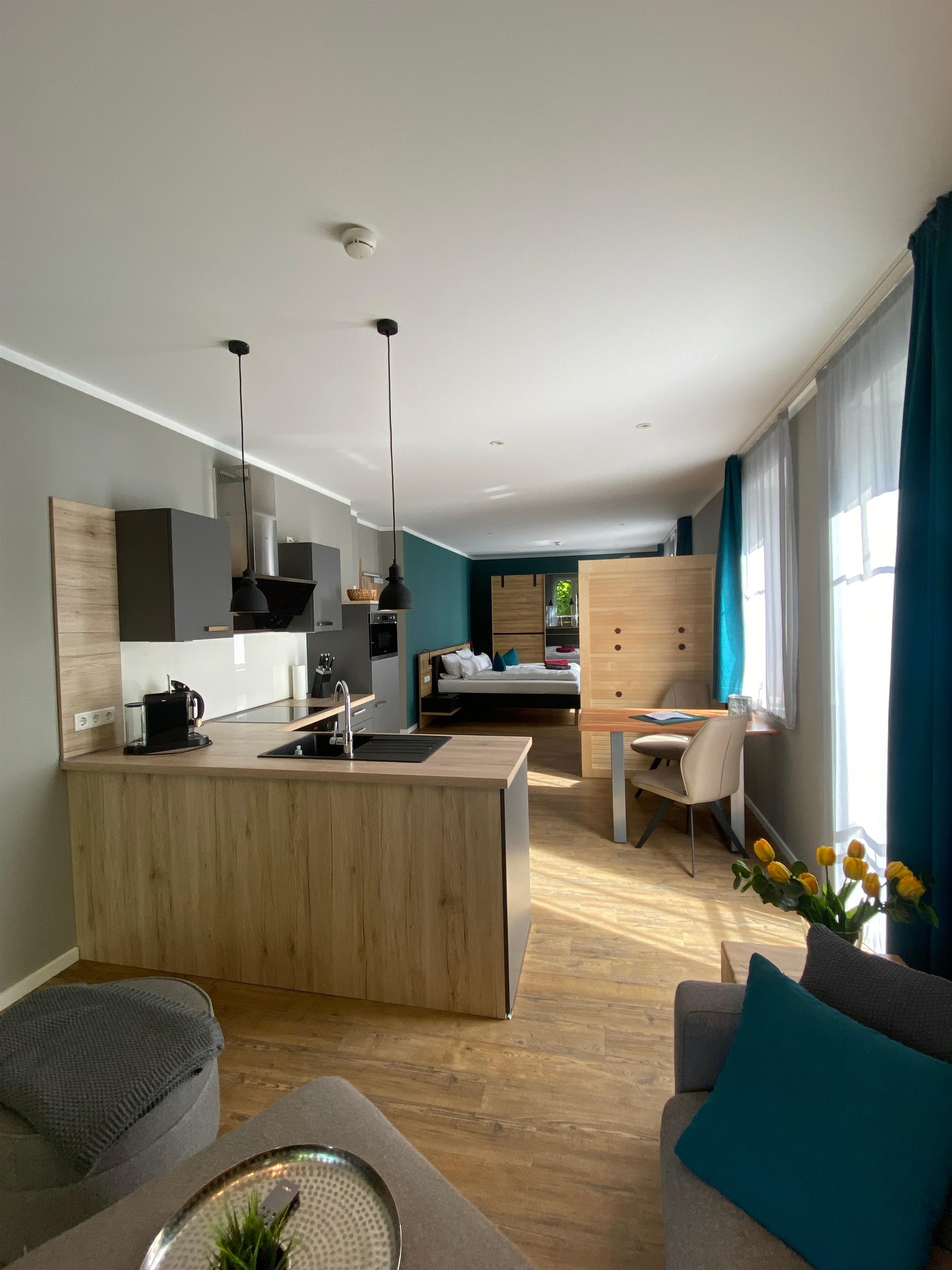 Luxusloft mit Wohn-, Ess- und Schlafbereich in einem Raum, Infrarotkabine, separatem Bad mit Regendusche und einem Balkon