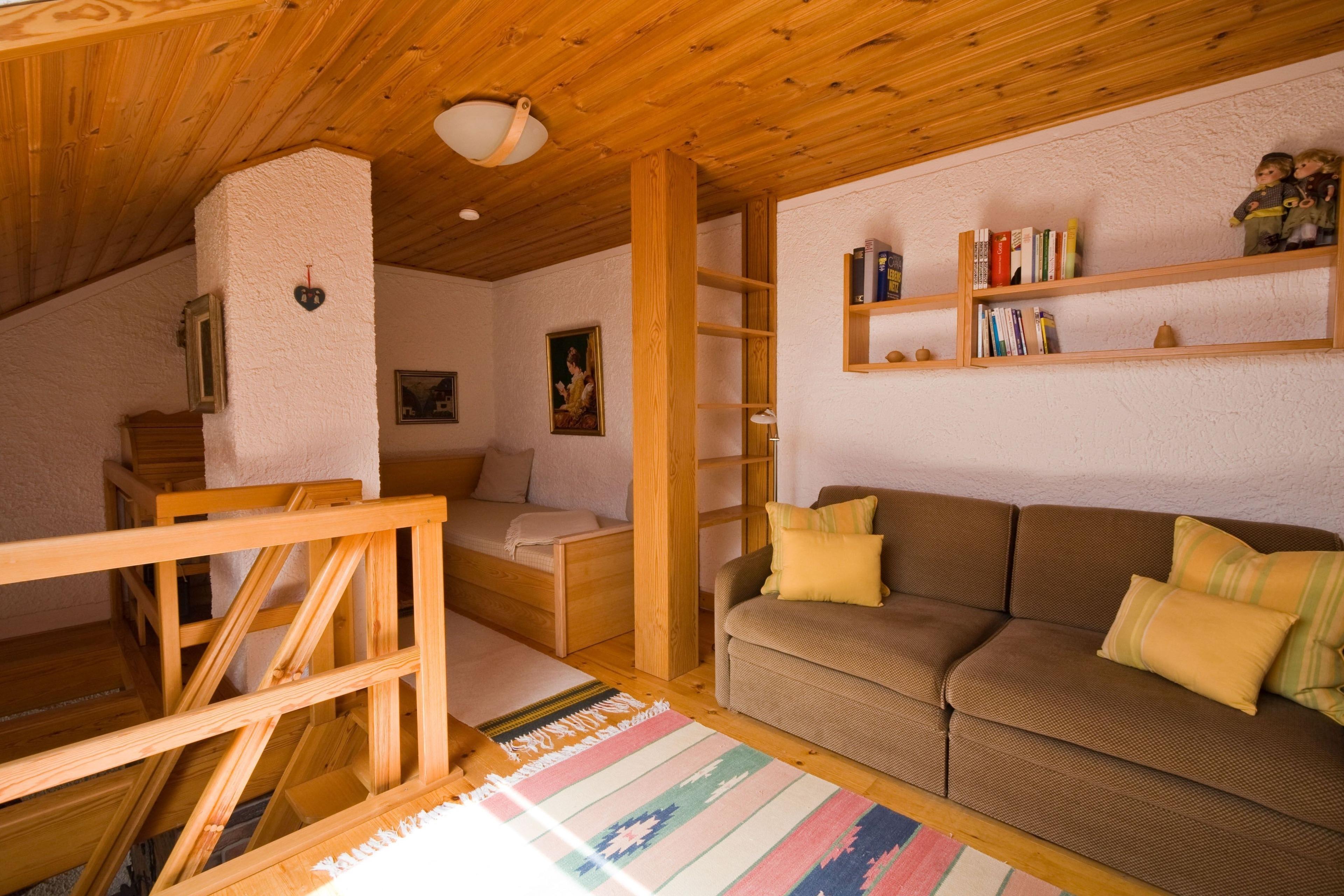 2. Ebene: Vom Wohnzimmer über eine Raumspartreppe erreichbare offene Galerie und ein Kinderschlafzimmer mit zwei Einzelbetten.