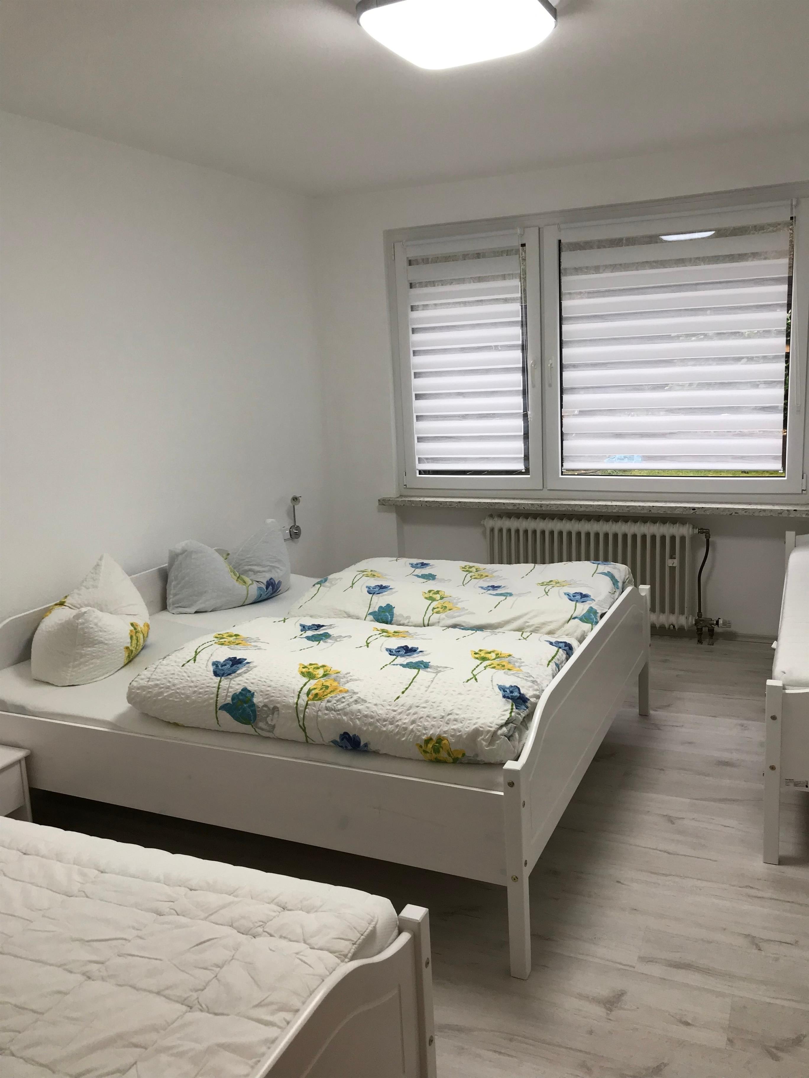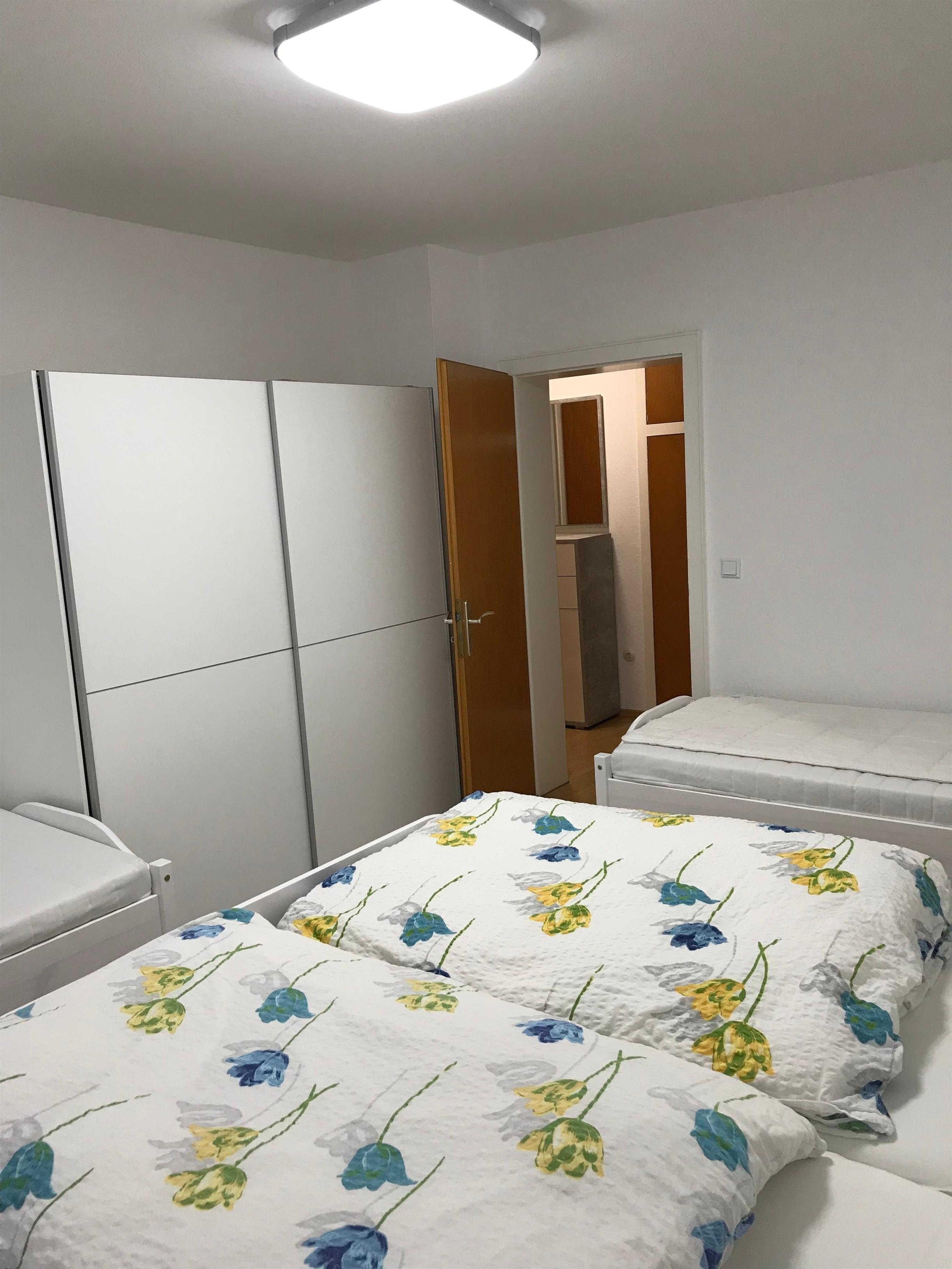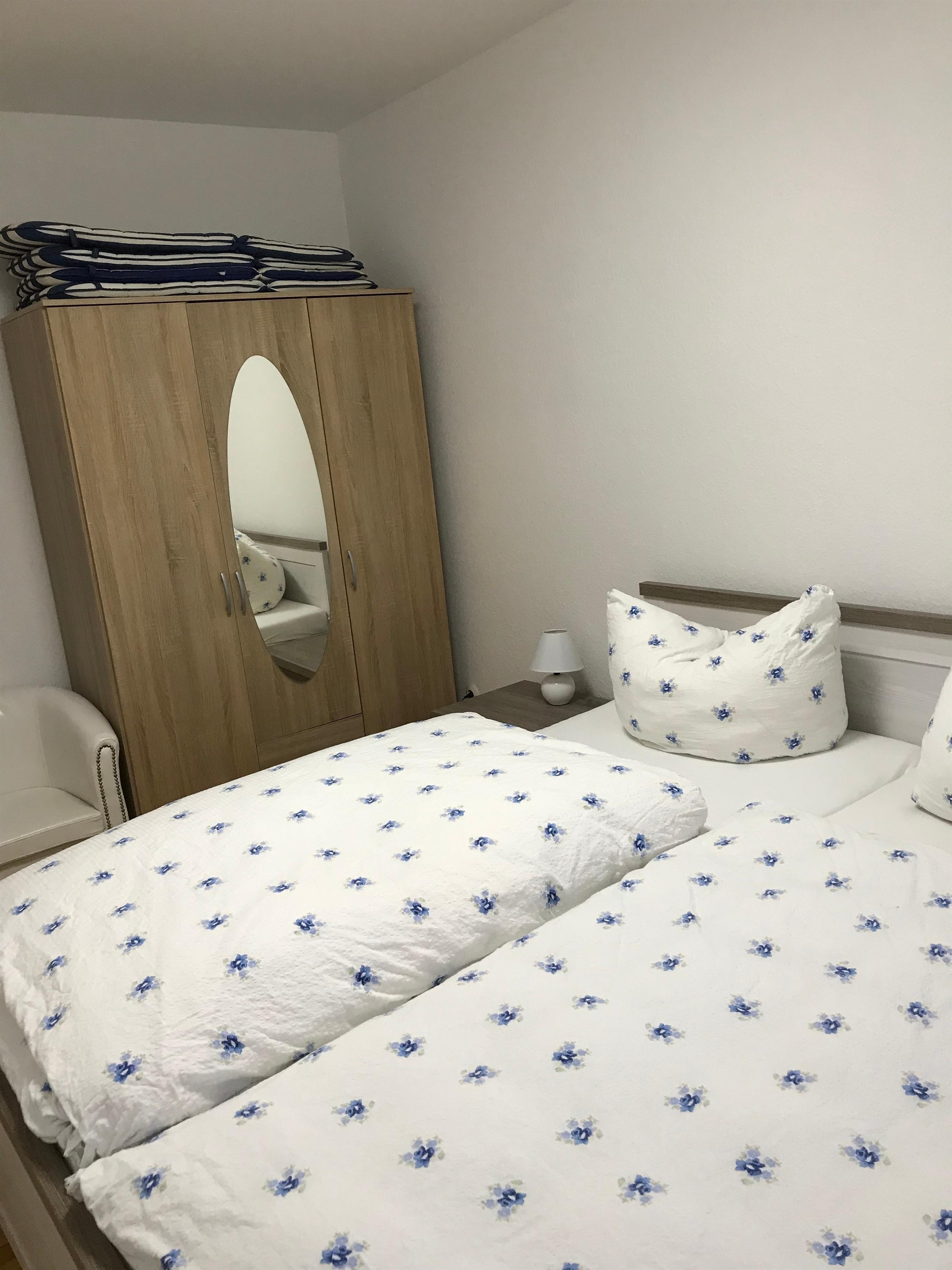 Die Ferienwohnung verfügt über 2 Schlafzimmer. In einem Schlafzimmer befinden sich 2 Einzelbetten und ein Doppelbett. Das andere Schlafzimmer verfügt über ein Doppelbett. Im Wohnzimmer bietet das Sofa Platz für 1 weitere Personen.
