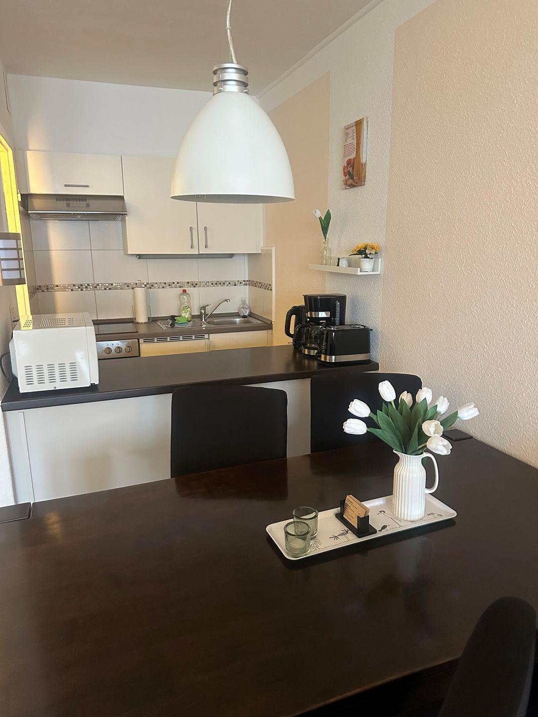 Die voll ausgestattete offene Küche mit 4-Platten-Herd, Backofen, Mikrowelle, Kühlschrank mit Gefrierfach, Kaffeemaschine, Wasserkocher, Toaster und sämtlichem Geschirr lässt keine Wünsche offen – hier finden Sie alles, was Sie für die flexible Selbstversorgung benötigen. Auch Gewürze und Reinigungsmittel stehen zur Verfügung, sodass Sie Ihren Aufenthalt unbeschwert gestalten können. Der angrenzende Essbereich mit Esstisch lädt zum gemeinsamen Speisen und Verweilen ein.