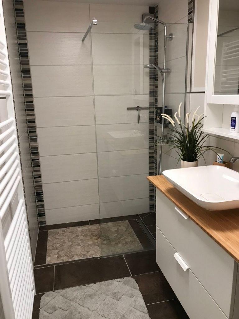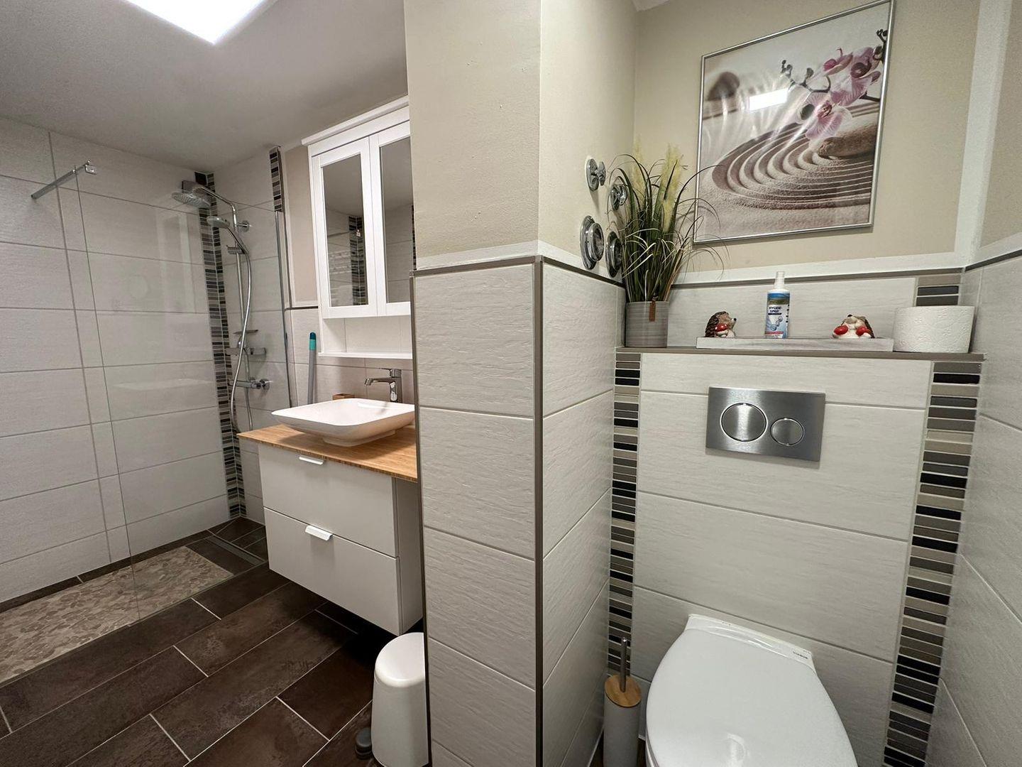Das Badezimmer ist modern und komfortabel ausgestattet mit einer bodengleichen Dusche, Haartrockner und sämtlicher Badausstattung wie Seife und Shampoo. Zusätzlich stehen Ihnen frische Handtücher und Bettwäsche bereit, damit Sie sich ganz auf Ihre Erholung konzentrieren können.