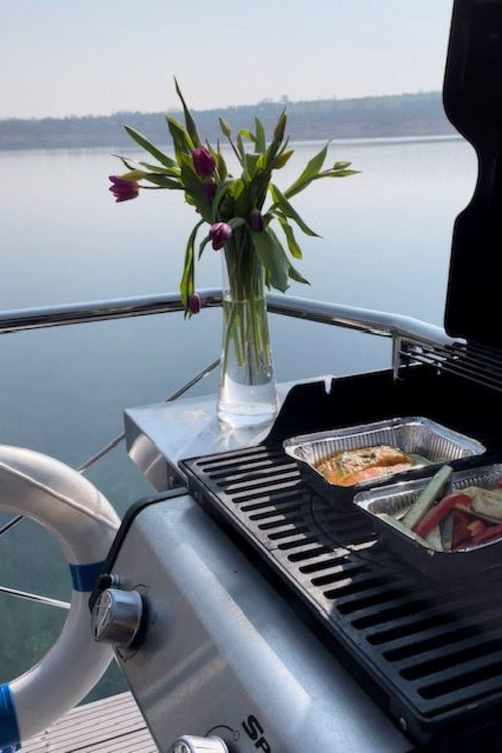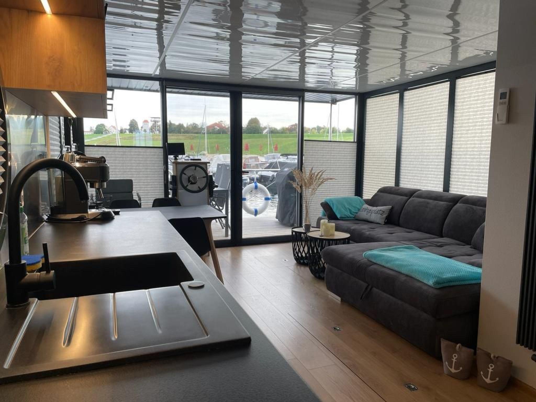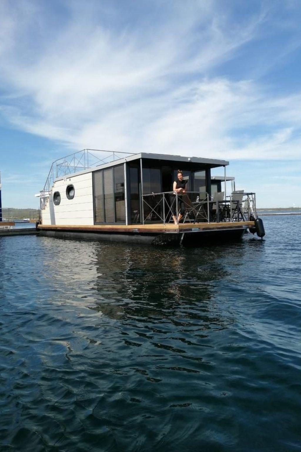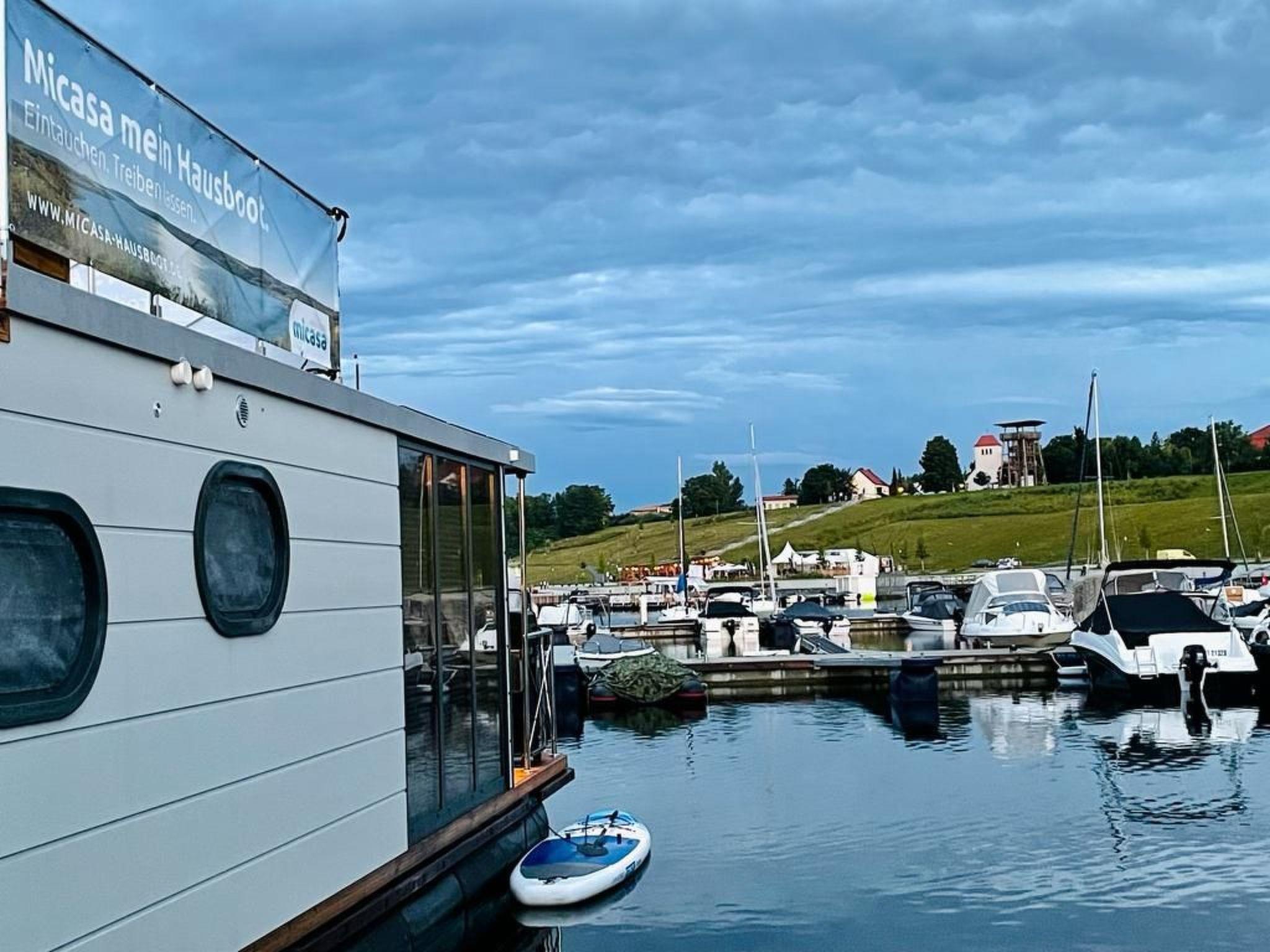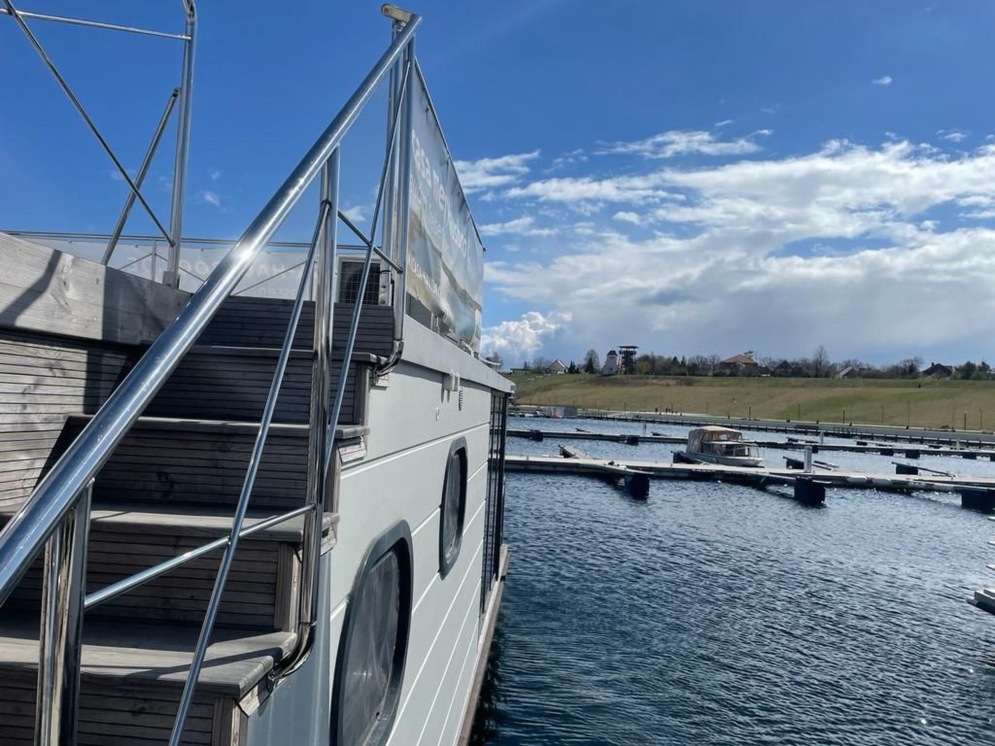 Ahoy and welcome aboard our Micasa houseboat in Braunsbedra Marina. Experience freedom on the water and enjoy a break from everyday life. With 33 square metres of living space, Micasa is the perfect place to relax on the water. We offer space for up to 4 people. There is a bunk with a double bed and a sofa bed in the living area. Our cabin is one of the highlights on board. The floor-to-ceiling panoramic windows give you a wonderful view of the lake and the marina. The living and dining area contains a generously equipped kitchenette. From here you can access our furnished bow terrace with Weber gas barbecue. Our large roof terrace invites you to sunbathe or chill out in our cosy deckchairs. Our Micasa houseboat shines in a new boutique style. Our new centrepiece on board is a Finnish sauna. Do something good for yourself and feel the cosy heat of our sauna heater in our new wellness area. Our comfortable houseboat is anchored in the harbour all year round. To explore the lake from the water, you can hire a motorised boat from the boat hire service in the summer months without a licence.
