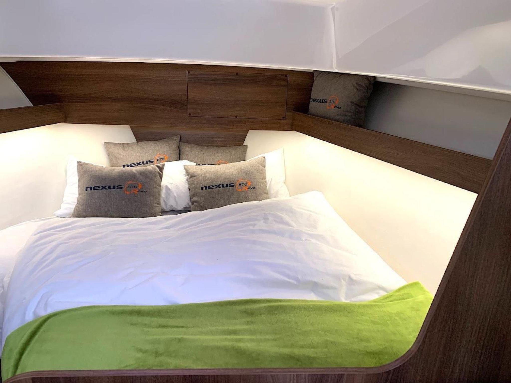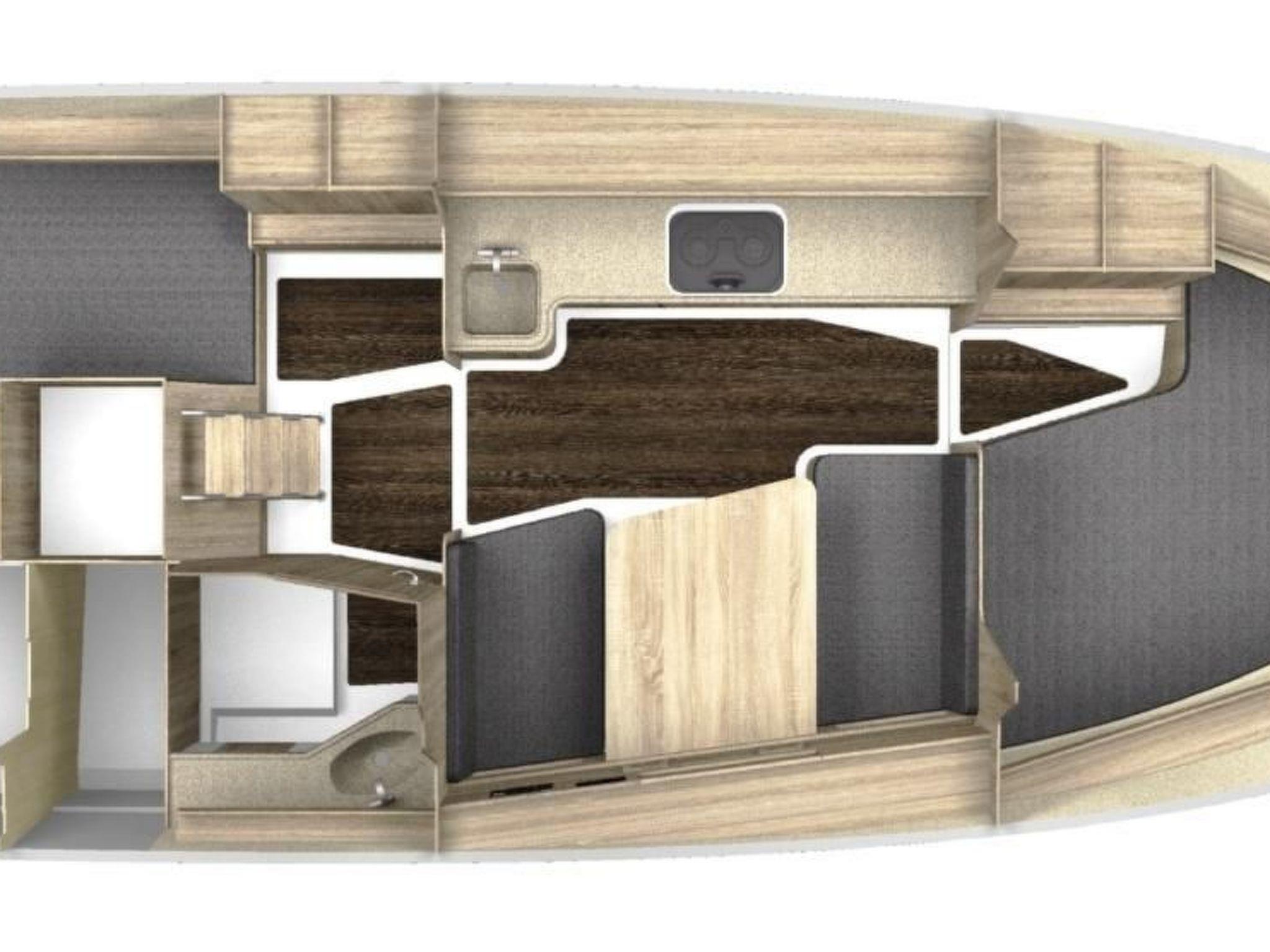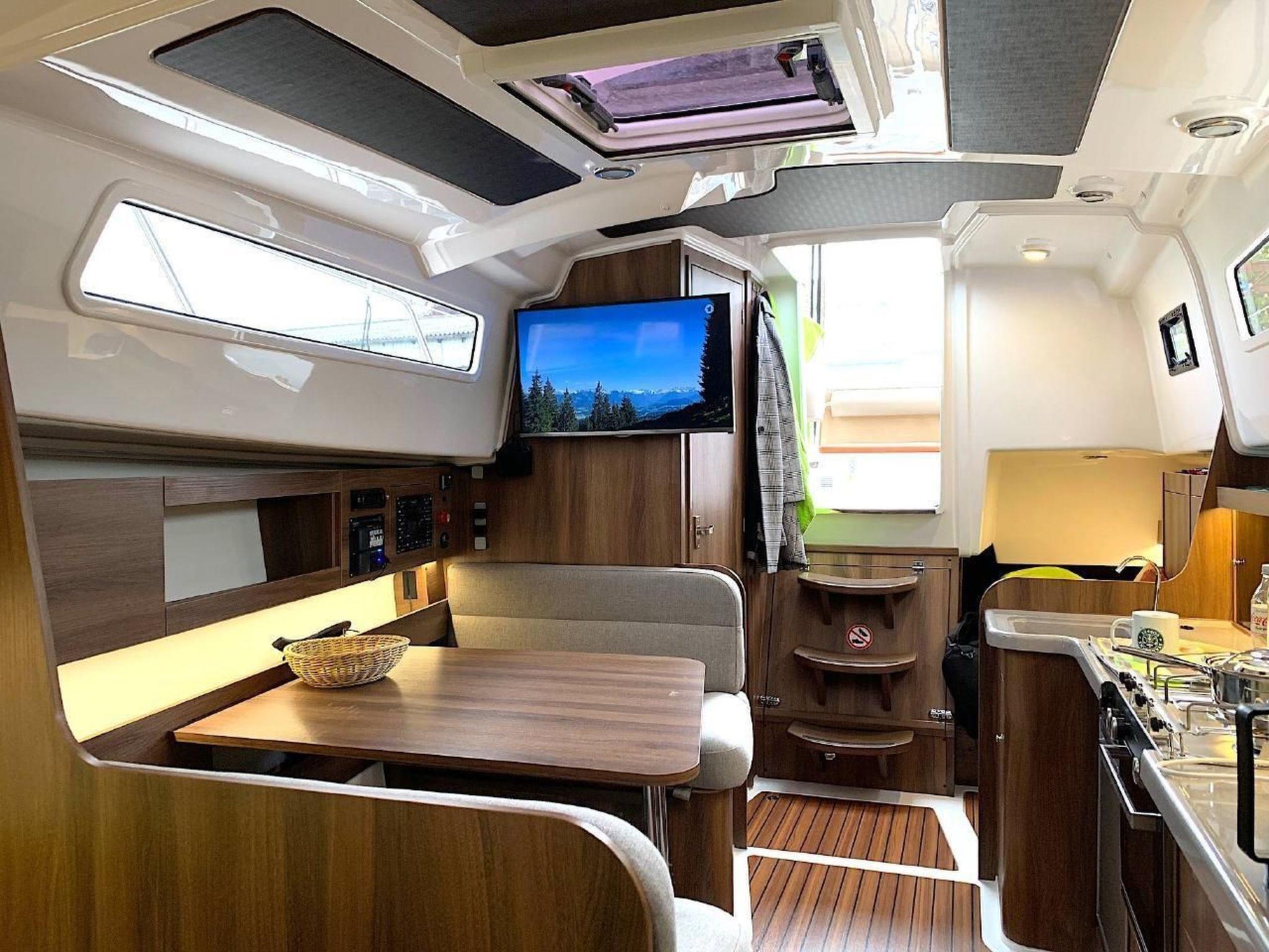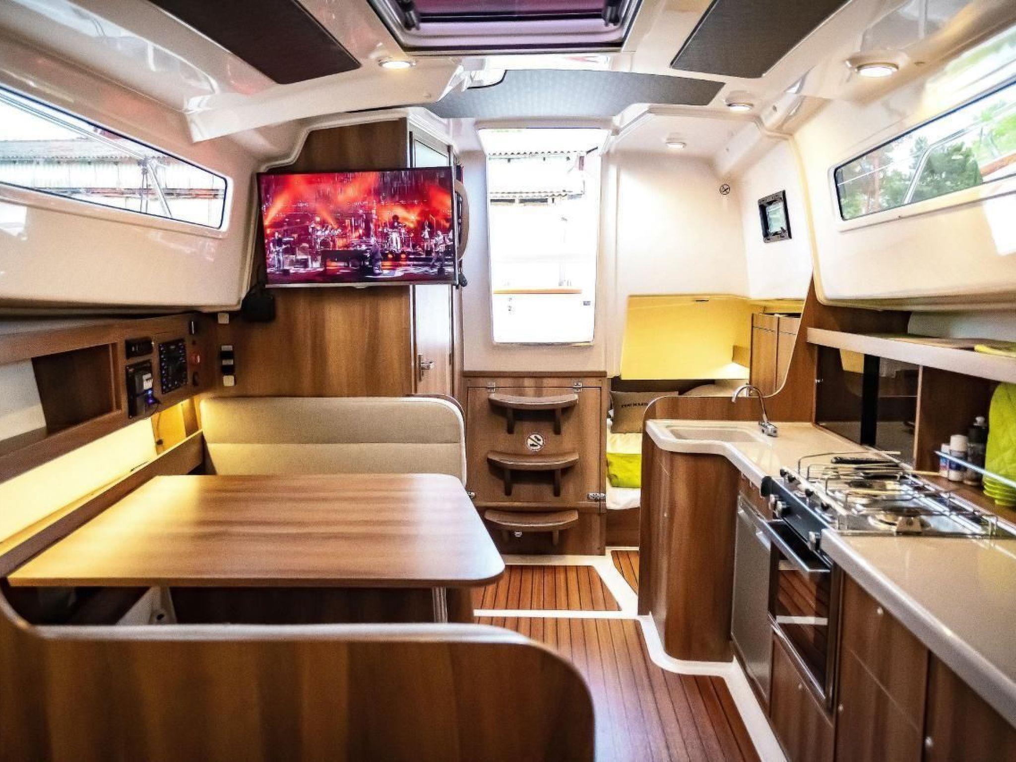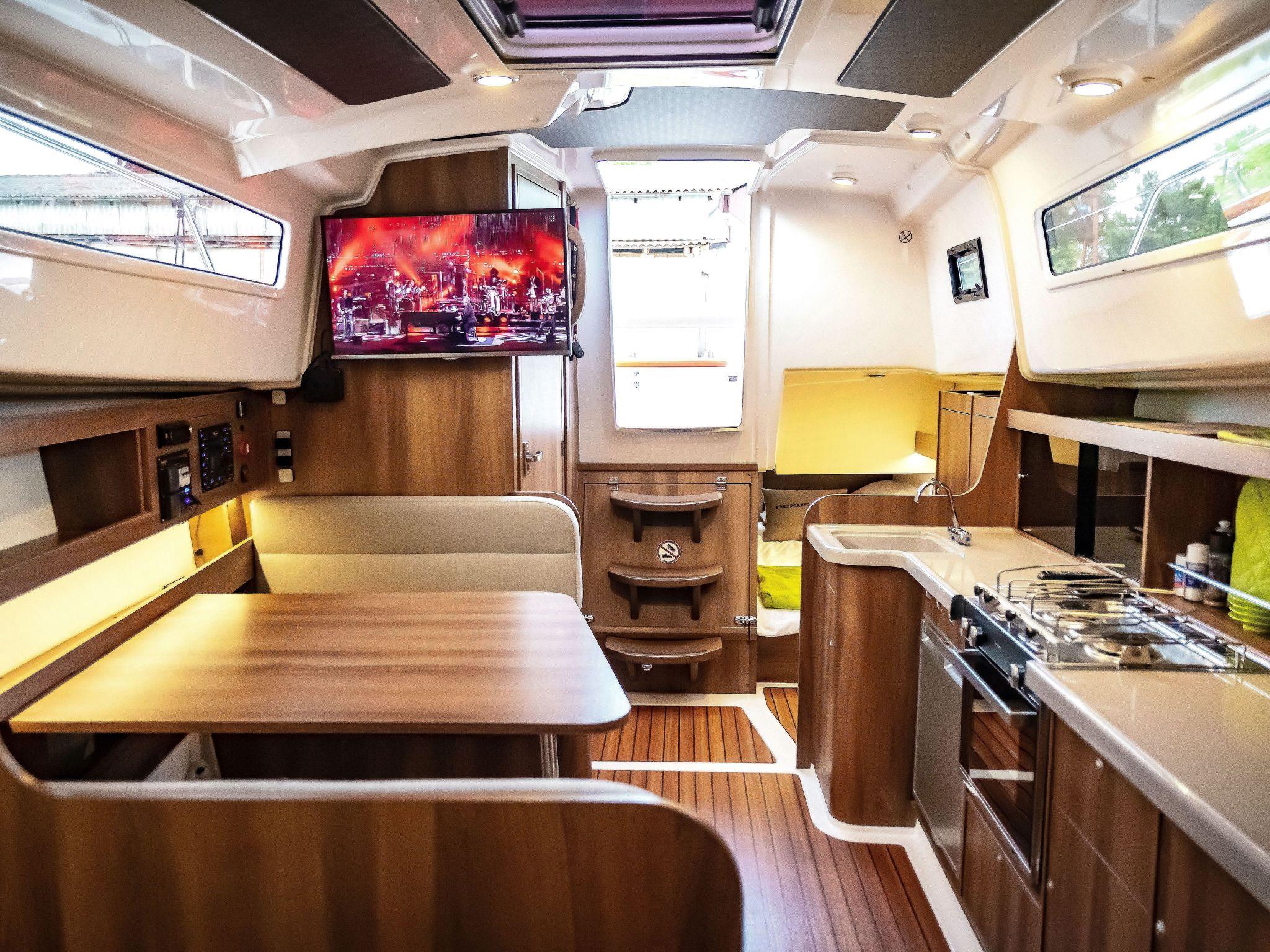 This boat is pleasantly structured and spacious below deck with a fully equipped galley and a wet room including electric WC, washbasin and shower. If you are travelling with up to 2 adults and 2 children, the bunk in the aft offers an additional plus point. This means there is no need to convert the seats into a sleeping area in the evening. The Overtime is very well equipped, including free WiFi, hi-fi audio system with Aux In and USB connection, 32" UHD TV, an AppleTV with free media library (films, programmes, games, music archive, apps). The boat has excellent directional stability and is equipped with a Yanmar inboard engine. You can manoeuvre very easily and comfortably with the powerful bow thruster.
