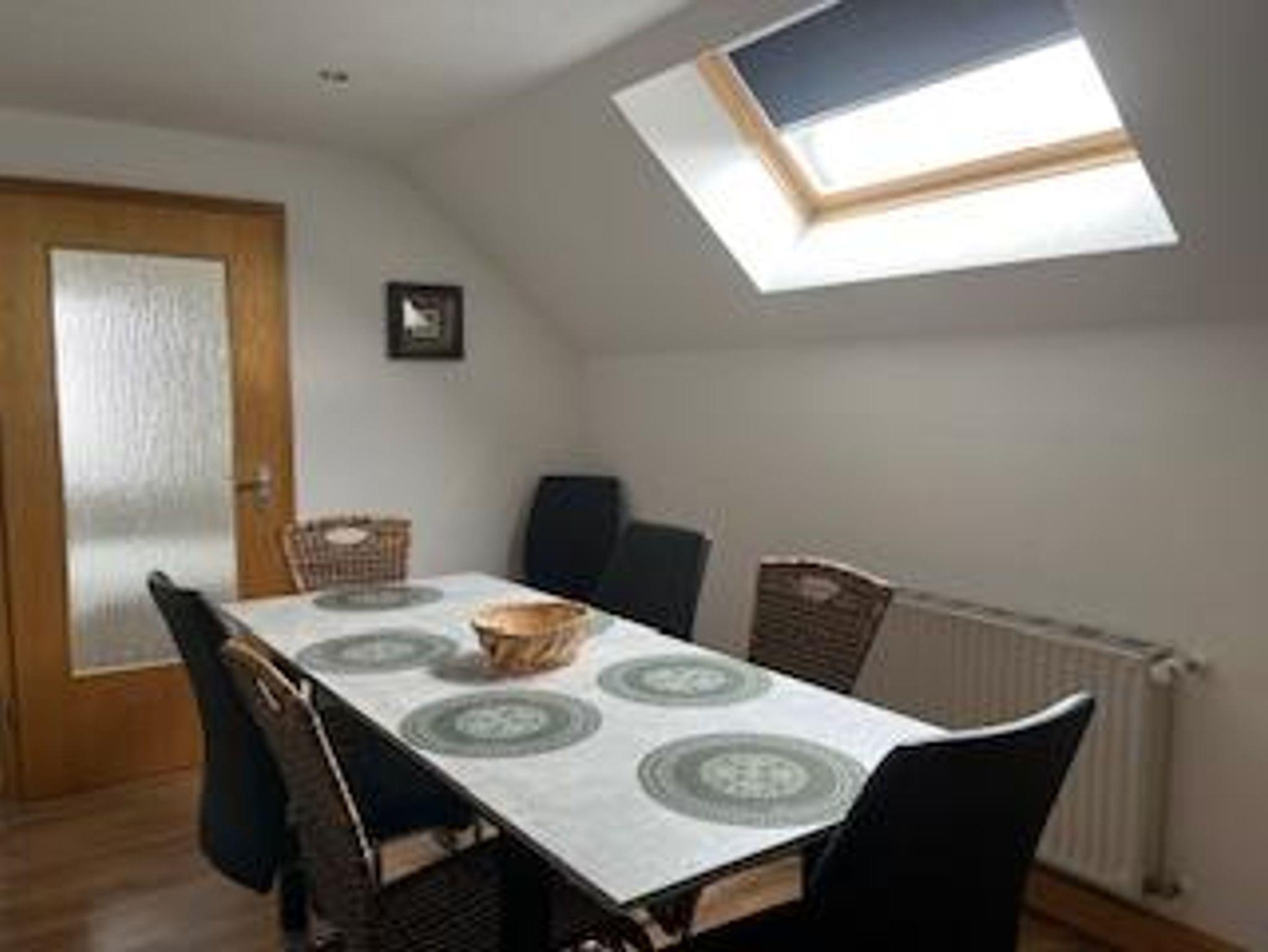 Wohnzimmer: Gemütlich mit Eckcouch und Esstisch mit Stühlen. Flachbildschirm-TV und Musikanlage.