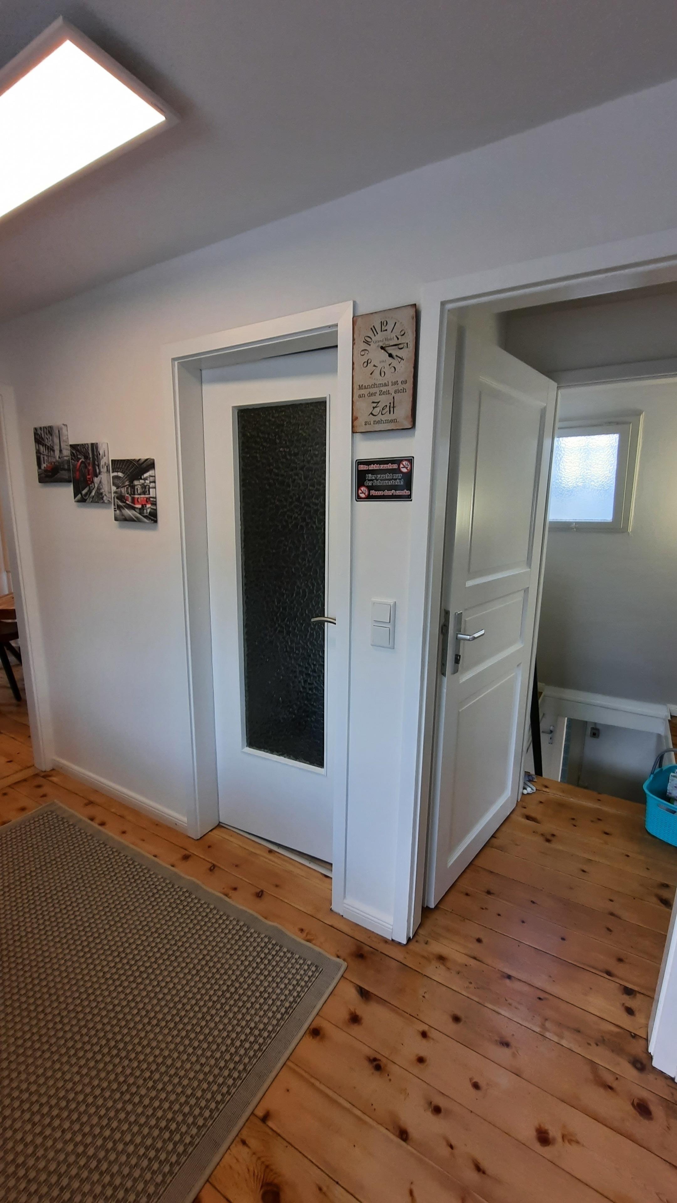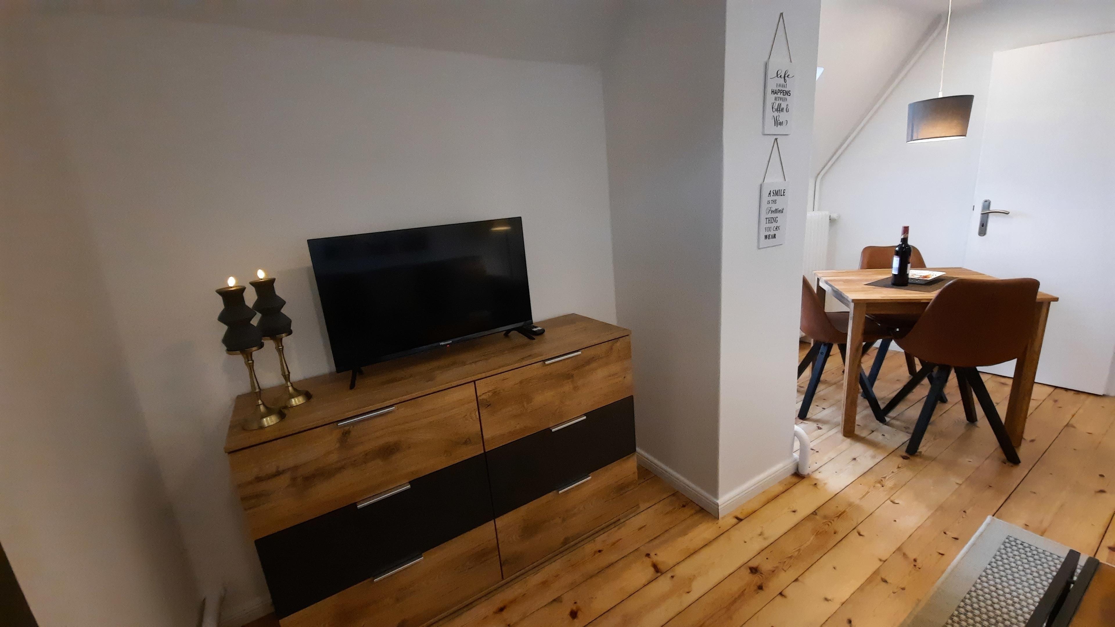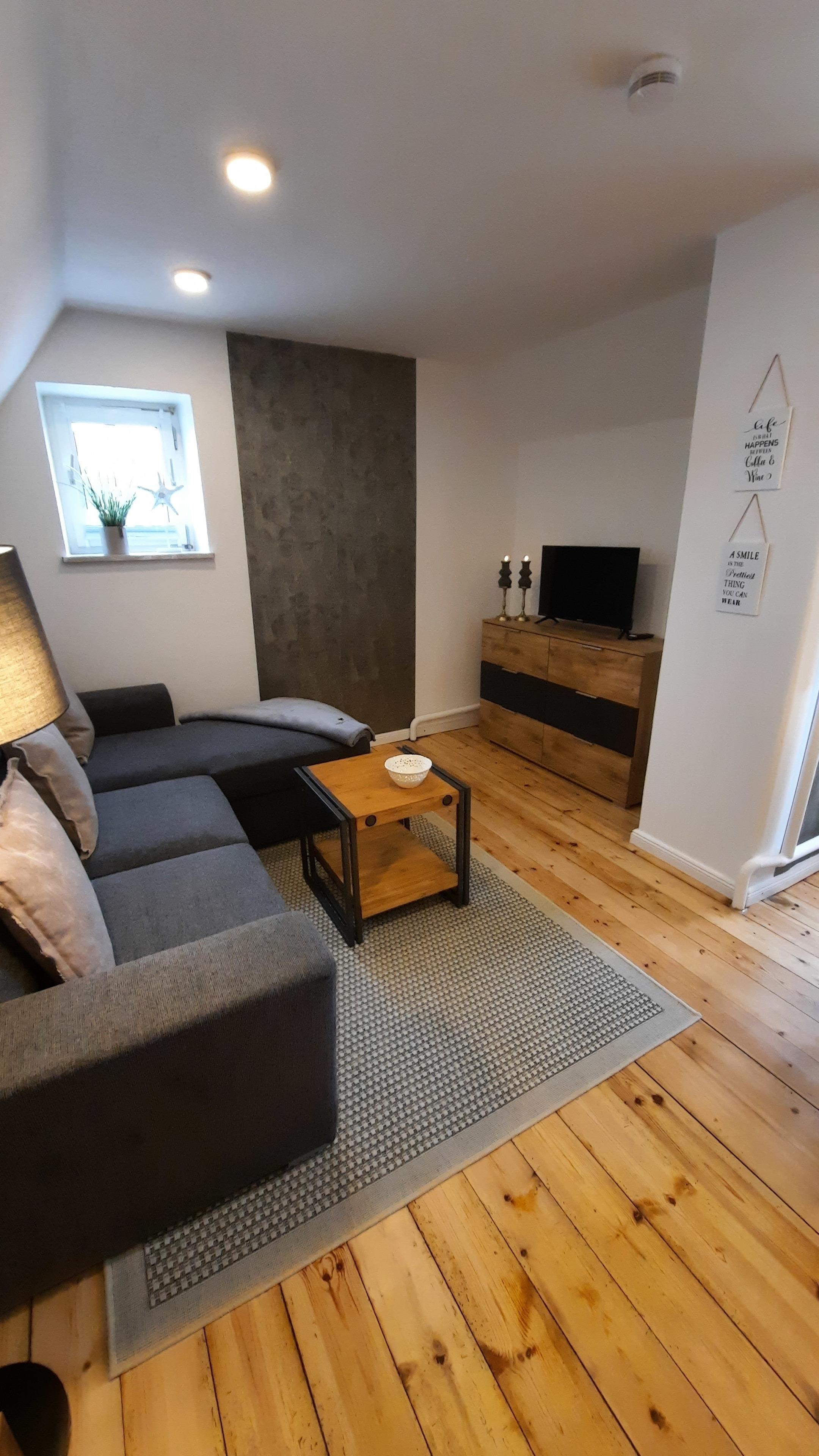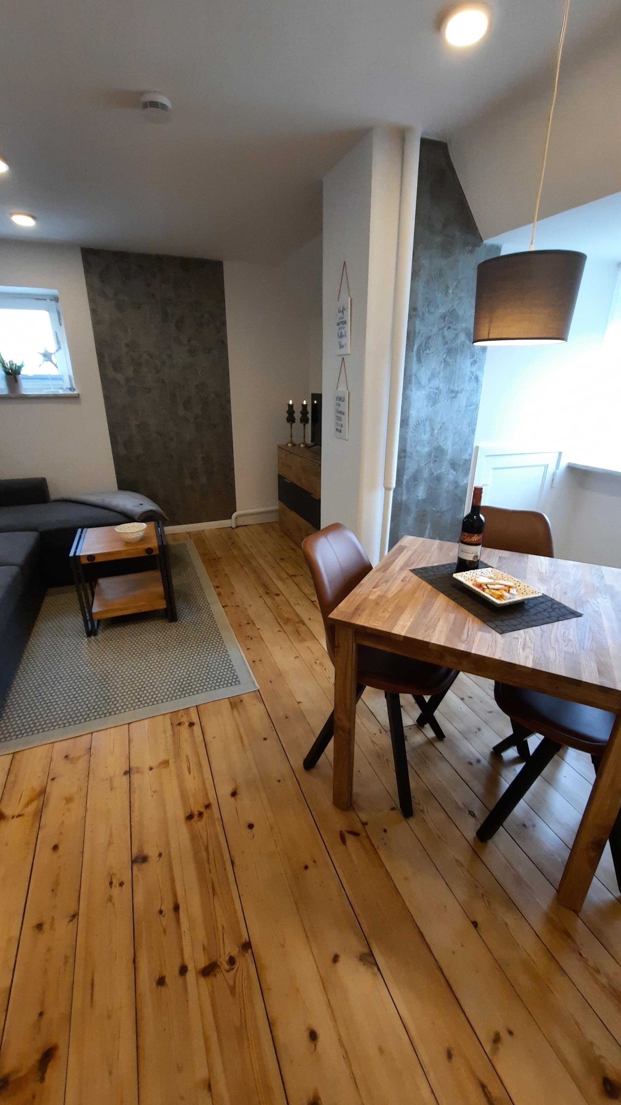 Klein aber fein, liebevoll renoviert und in warmen Tönen eingerichtet empfängt sie unsere Ferienwohnung. Der Eingang zur Wohnung befindet sich in mitten der Werkräume der Heißmangel, mitten im Geschehen. Über eine kleine Treppe gelangen Sie in die separierte Ferienwohnung. Ein kleiner Garten sowie überdachte Sitzecke ist hinter dem Haus vorhanden. PKW Stellplatz an der Ferienwohnung sowie Abstellmöglichkeiten von Fahrrädern oder Motorrädern. Desweiteren bieten wir zwei neue E-Bikes zur tageweisen Vermietung an.