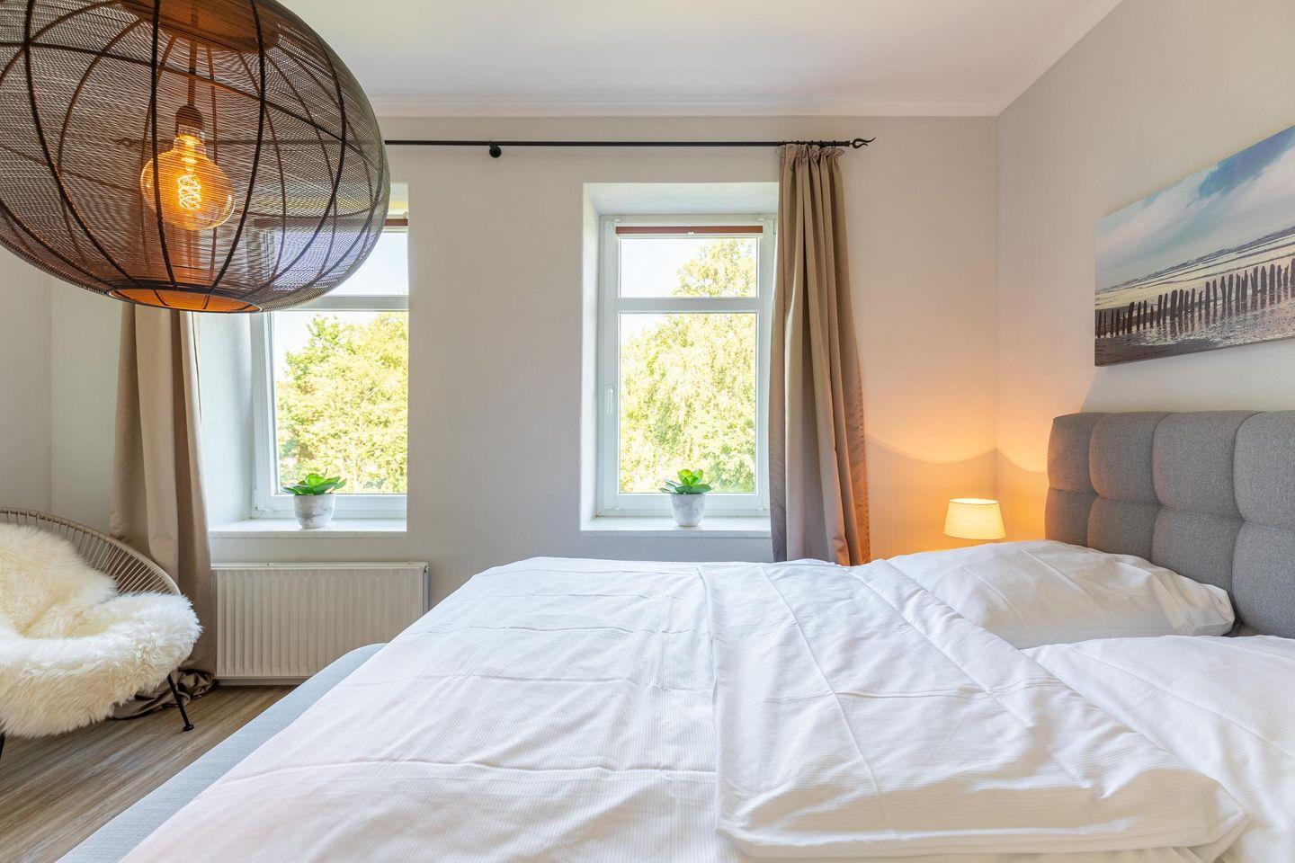 Die stilvoll und modern eingerichtete Ferienwohnung ist 73 qm groß und bietet ein geräumiges Wohnzimmer mit Flachbild-TV (SAT). Ein Highlight ist der kleine Balkon, von wo aus Sie direkten Blick über den schönen Mühlenteich haben.