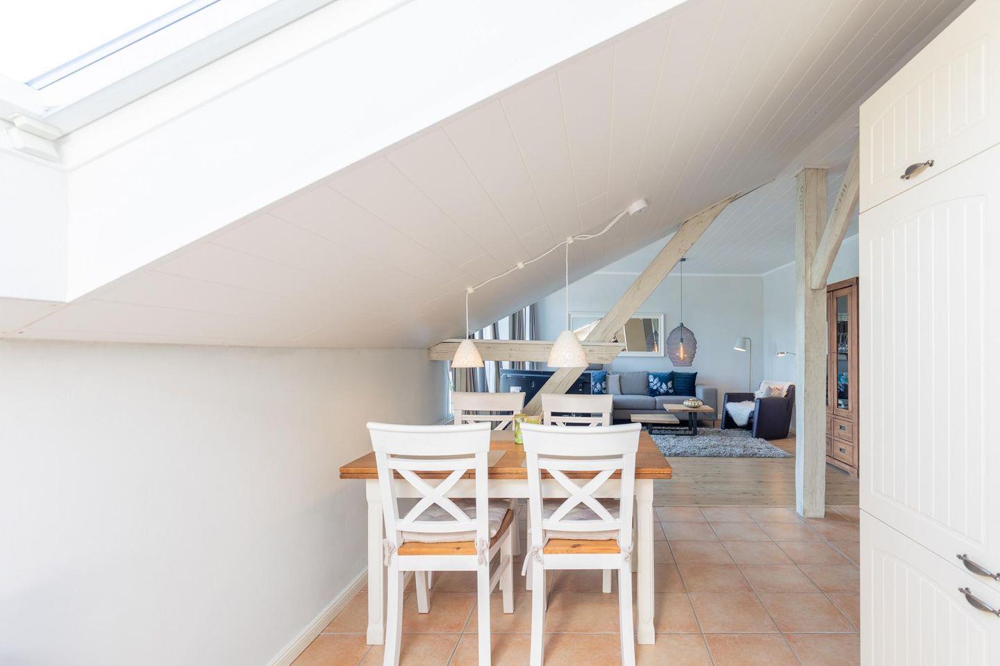 Die Küche mit dem Esstisch ist mit einem Herd (Ceranfeld), Backofen, Mikrowelle, Geschirrspülmaschine und Kühlschrank ausgestattet. Das Apartment bietet Ihnen zwei Schlafzimmer: Boxspringbett (180 × 200) und zwei Einzelbetten. Das moderne Duschbad rundet das Bild ab.