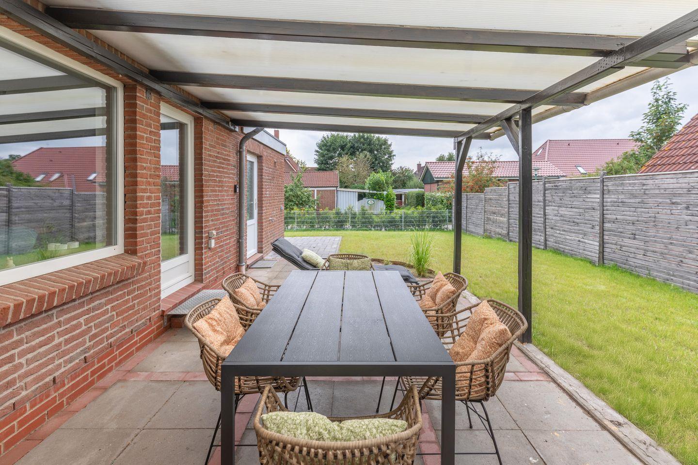 Die direkte Verbindung vom Wohnzimmer zur überdachten Terrasse öffnet den Raum nach draußen.