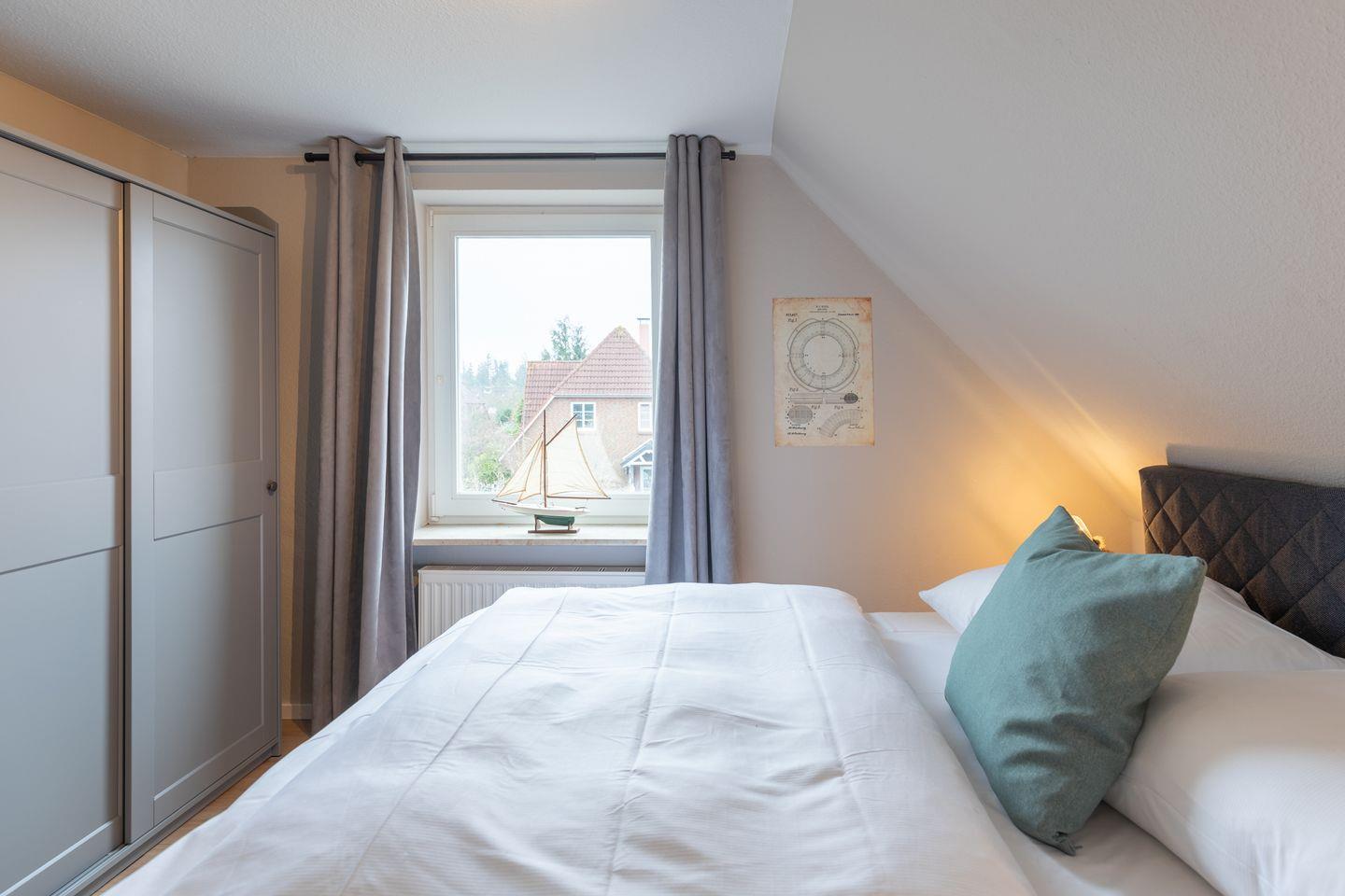 Über eine offene Treppe gelangen Sie ins Obergeschoss, wo sich die Schlafräume befinden. Ein Schlafzimmer verfügt über ein Boxspringbett (180 x 200 cm). Das zweite Schlafzimmer verfügt über ein Doppelbett in der Größe (160 x 200cm). Das dritte Schlafzimmer mit Einzelbett (90x 200cm) bietet zusätzlichen Platz.