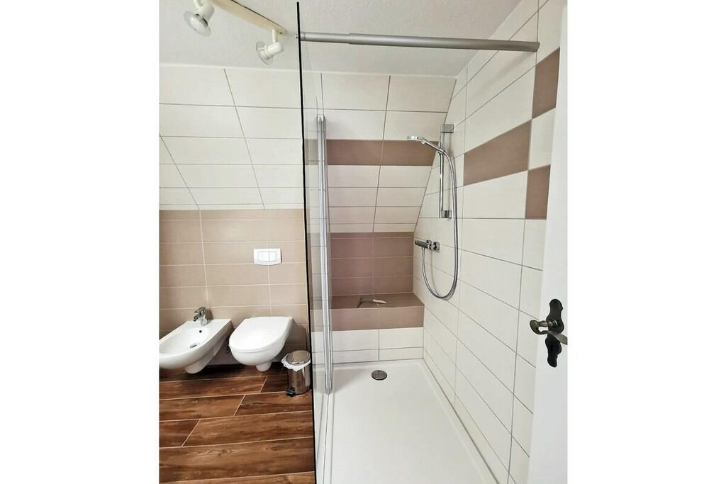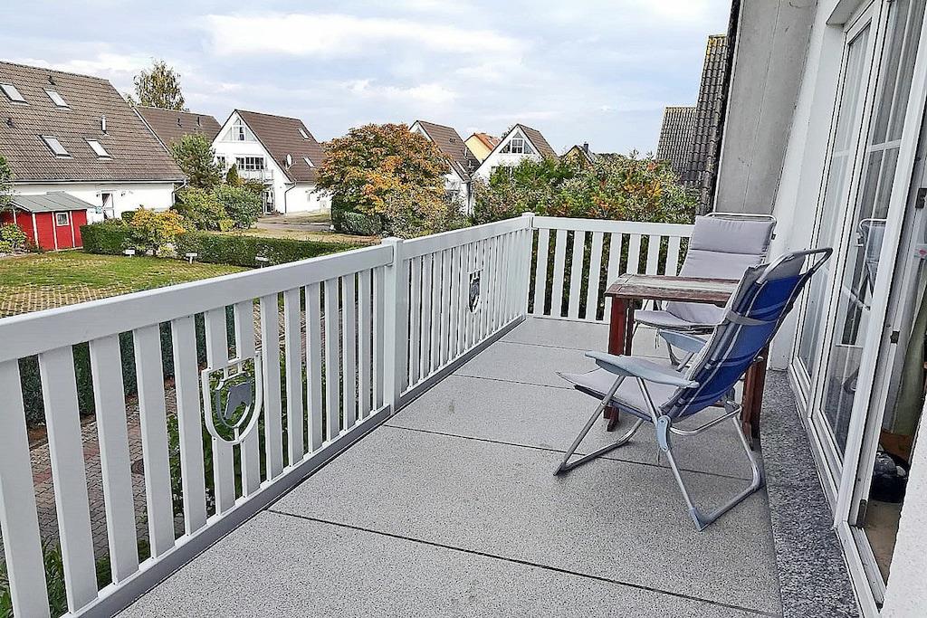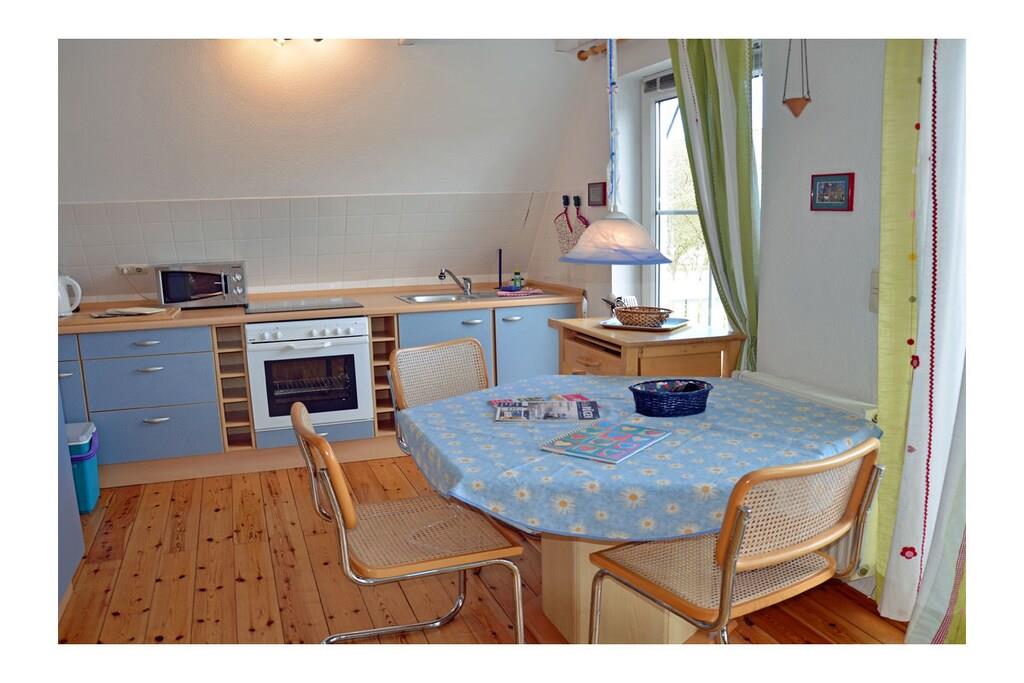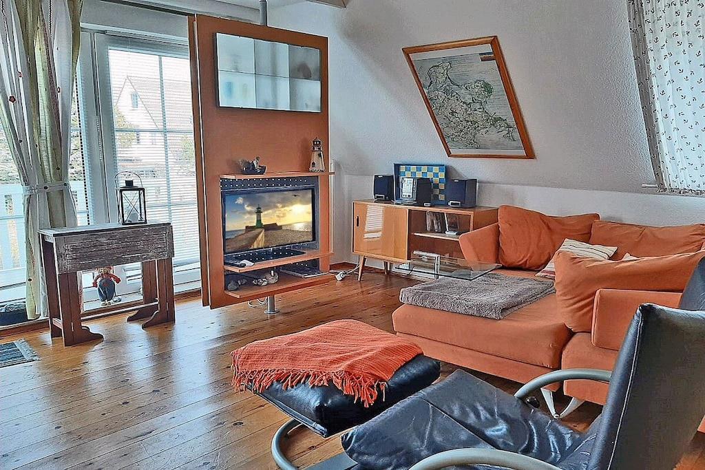 Die ca. 60 m² große Maisonette-Ferienwohnung für 3 Personen, befindet sich im ersten Obergeschoss und besteht aus einem großen Wohn-/ Essraum mit offener, voll ausgestatteter Küche (Kühlschrank mit kleinem Gefrierfach, Geschirrspüler, 4 Platten-Ceranherd, Backofen, Mikrowelle, Esstisch für 4 Personen), TV/ Sat (Flatscreen), Stereoanlage mit CD, großen Fensterfront mit Zugang zum gemütlichen Holzbalkon mit Sitzmöbeln. Abstellraum mit Waschmaschine, Wäscheständer und Bügeleisen. Bad mit Badewanne, WC und Waschbecken. Das separate Schlafzimmer im Dachgeschoss ist über eine Holztreppe erreichbar und hat ein Doppelbett mit 180 cm x 200 cm (offenes Fußende), sowie ein Schlafsofa mit einer Liegebreite von 140 cm und einen Kleiderschrank. Die Ferienwohnung ist sehr großzügig, hell und mit einem Holzfußboden und einem drehbaren Bar-Fernsehcenter ausgestattet.