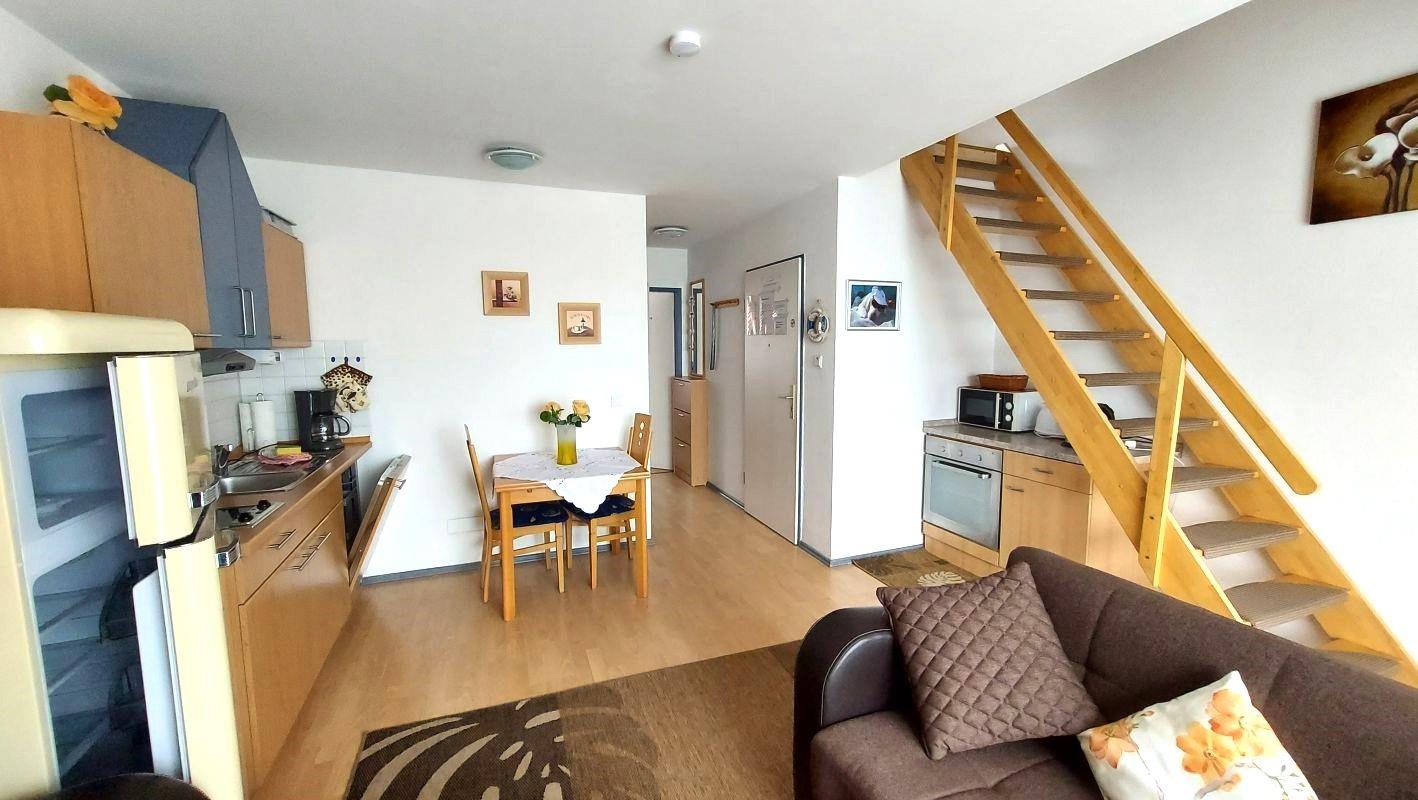 In der ersten Ebene befindet sich ein großzügiger Wohn- und Essbereich, hier ist ein offener Küchenbereich integriert.