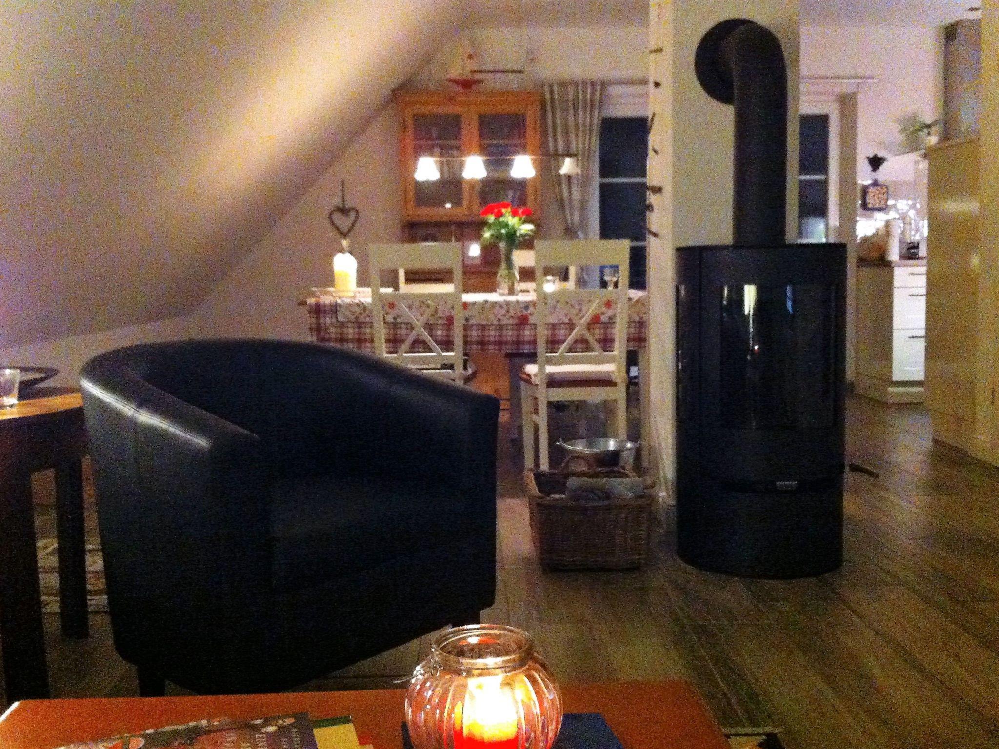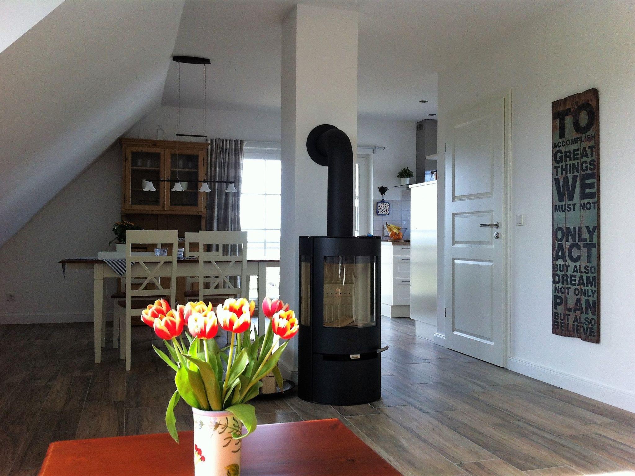 The upper floor flat, approx. 85 square metres, consists of a spacious living/dining area with wood-burning stove, sofa corner, flatscreen TV, fully equipped kitchen with ceramic hob, fridge/freezer, dishwasher, 2 separate bedrooms each with a double bed (180cm), a bathroom with walk-in shower.