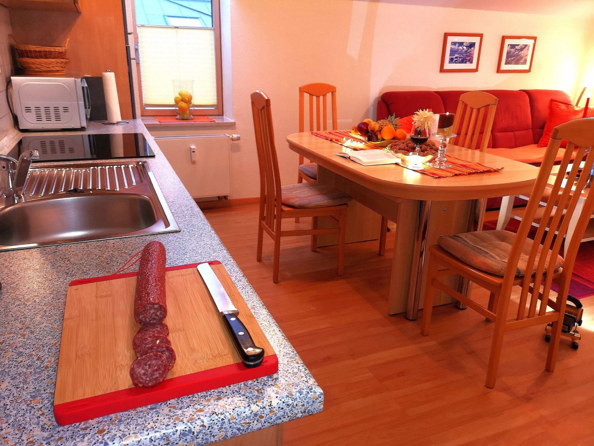 Inside, you can expect a spacious living ambience that leaves nothing to be desired. Settle into the comfortable sofa area or the cosy wing chair with footstool and enjoy your favourite show on the Smart HD flat screen. A well-equipped kitchen corner with coffee machine, kettle, ceramic hob, oven and fridge invites you to conjure up culinary highlights, while the adjoining dining area invites you to linger together. The elegant bedroom with its cosy double bed, practical bedside cabinets and a spacious wardrobe offers ideal conditions for restful nights. The bathroom is comfortably equipped with a shower, bathtub, WC and bidet. For our youngest guests we have a travel cot and a high chair available.