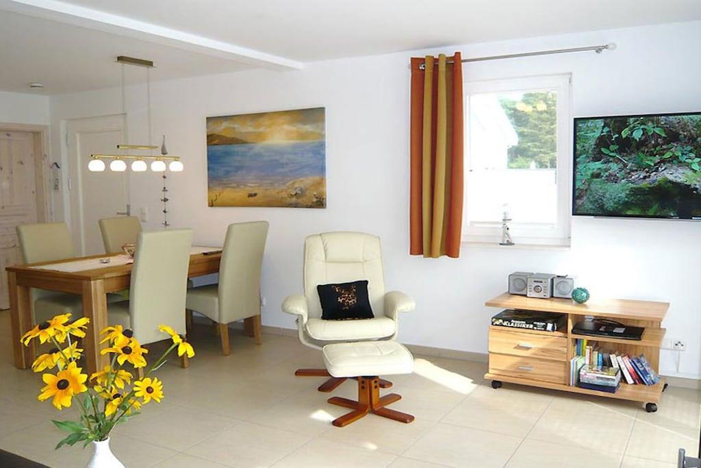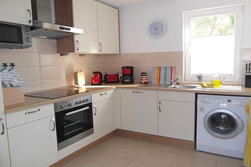 Erdgeschoss: großzügiger Wohn- Essbereich mit Fußbodenheizung und Kamin, gemütliche Couchlandschaft mit Schlaffunktion, TV/ Sat (Flatscreen), DVD-Player, komplett ausgestattete Einbauküche mit Waschmaschine, 4-Plattenherd (Ceranfeld), Backofen, Kühlschrank mit kleinem Gefrierfach, Mikrowelle, Geschirrspüler und diversen Elektrogeräten, 1. Bad mit Infrarotsauna, Dusche und WC. Obergeschoss: 1. Schlafzimmer mit Doppelbett, Kleiderschrank und TV (Flatscreen), 2. Schlafzimmer mit Doppelbett, Kleiderschrank und TV (Flatscreen), Badezimmer mit Badewanne und WC, Terrasse mit Gartenmöbeln, Strandkorb und Sonnenschirm Infrarotsauna ohne Gebühr, Waschmaschine ohne Gebühr, Nichtraucher, alle Fenster sind mit Fliegengaze versehen, Blick vom Strand bis nach Kap Arkona, Einkaufsmöglichkeiten in Altenkirchen sind ca. 2 km entfernt, Restaurants in unmittelbarer Nähe, vom ca. 900 m entfernten Hafen sind Ausflugsmöglichkeiten per Schiff zur Insel Hiddensee, Boddenfahrten, Kranichfahrten und zu den Störtebeker-Festspielen möglich, Segelschule, optimale Rad- und Wandermöglichkeiten um die schöne Insel zu erkunden, 1 PKW- Stellplatz am Haus, ein Haustier nach Absprache (Gebühr 15 Euro pro Woche)
