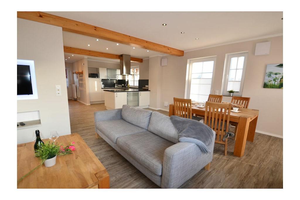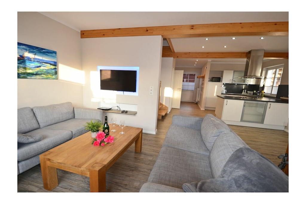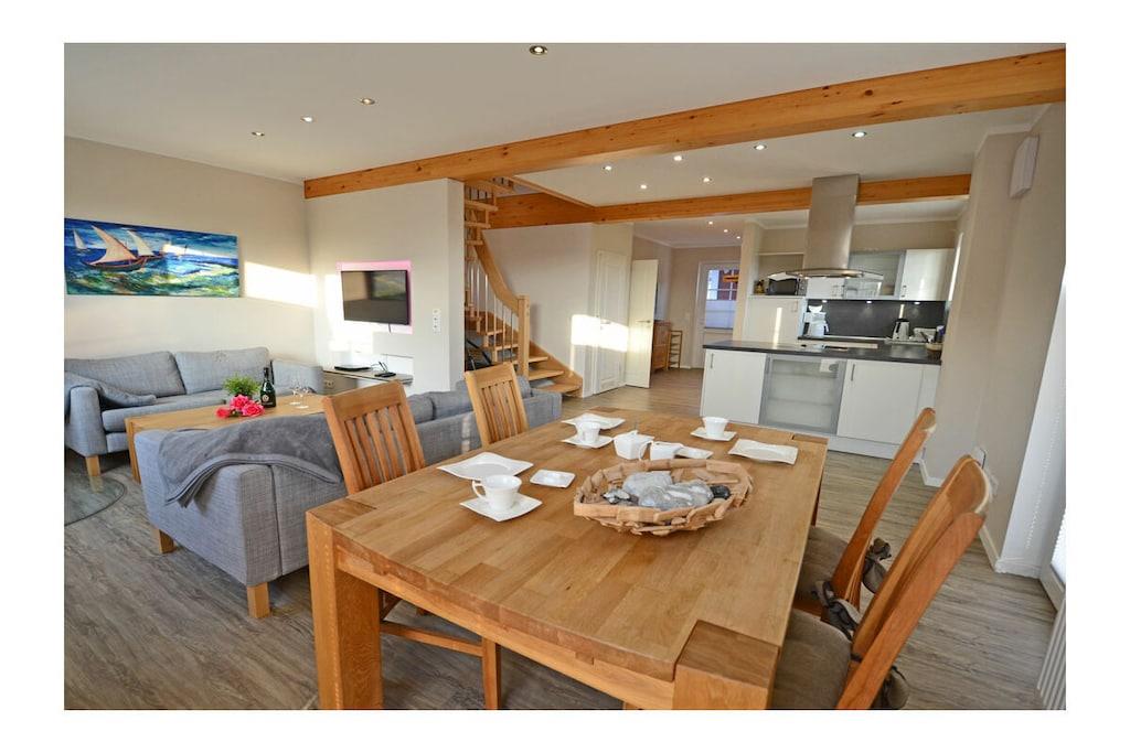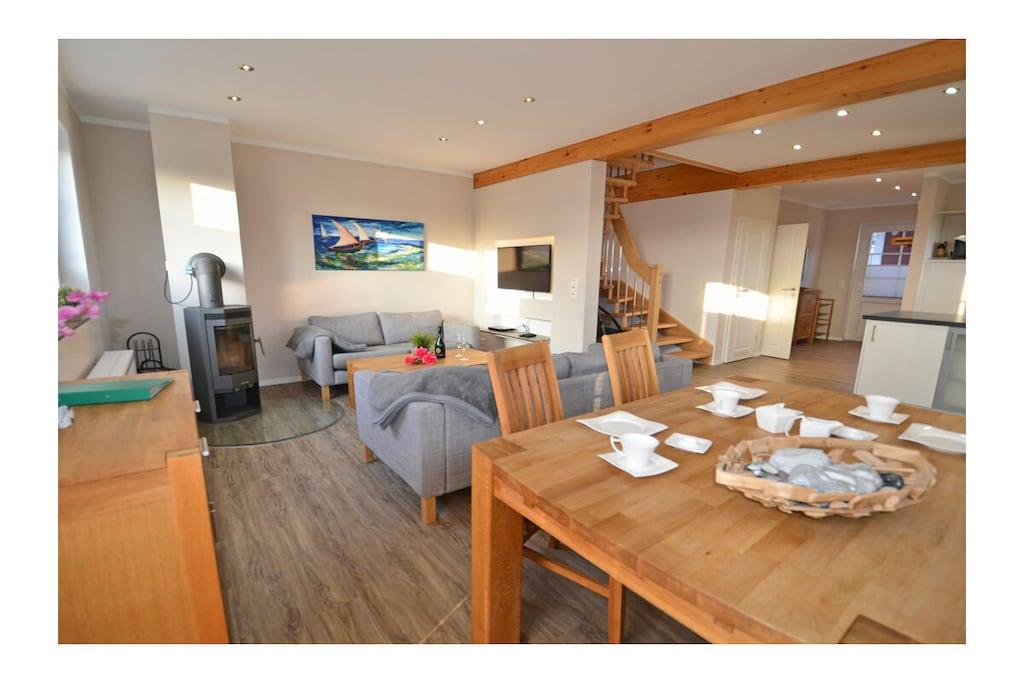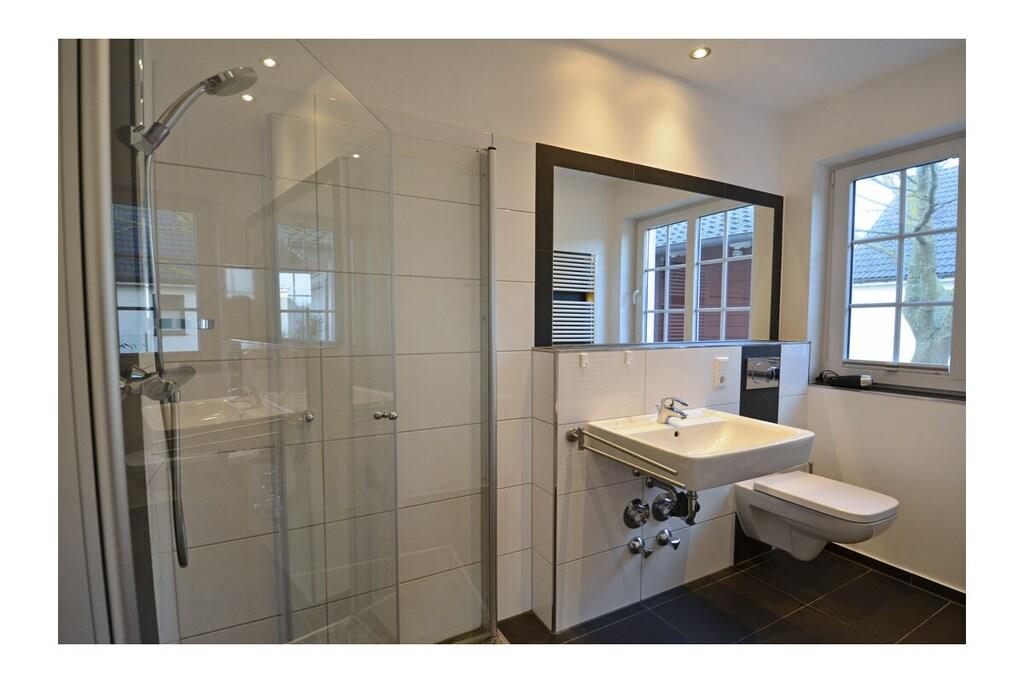 Erdgeschoss: großzügiger Wohn- Essbereich mit Kamin und gemütlicher Couchlandschaft, TV-Sat (Flatscreen) mit HDMI-Anschluss, Radio/CD-Player und Blu-ray Player, Gesellschaftsspiele und Bücher für gemütliche Abende, offene komplett ausgestattete Einbauküche mit 4-Plattenherd (Ceran) und großem Esstisch, Backofen, Kühlschrank mit kleinem Gefrierfach, Geschirrspüler und diversen Elektrogeräten (Mikrowelle, Kaffeeautomat etc.), großes Bad mit Dusche und WC, Föhn und Kosmetikspiegel, Gästebad mit WC Flur mit Garderobe und großem Spiegel, separater Wirtschaftsraum mit Waschmaschine und Trockner Obergeschoss: 1. Schlafzimmer mit einem Doppelbett (getrennte Matratzen je 90×200) und Kleiderschrank, 2. Schlafzimmer mit 2 Einzelbetten (je 90×200) und Kleiderschrank Außenbereich: große Terrasse zum Grillen und Entspannen mit gemütlichen Gartenmöbeln (4 Gartenstühle und 2 Liegestühle) und großem Sonnenschirm, Grillmöglichkeit besteht (Grill vorhanden) „Pameebo“ – Park-Meer-Bodden – das schwedenrote Ferienhaus großes Grundstück ca. 609 m² (Rasenfläche für Gartenspiele), Internet (WLAN) vorhanden und kostenfrei nutzbar, Kinderhochstuhl vorhanden, Nichtraucher, Waschmaschine und Trockner ohne Gebühr, Bollerwagen und Abstellmöglichkeit für Fahrräder in der Garage (abschließbar), 1 PKW-Stellplätze direkt am Haus Eine Bäckerei befindet sich nur wenige Gehminuten vom Ferienhaus entfernt. Wer die Gegend vom Land aus erkunden möchte, kann den 400 Meter weiter entfernten Fahrradverleih aufsuchen. Zahlreiche Rad- und Wanderwege schaffen für Naturgenießer viele Möglichkeiten zur Erkundung der Schaabe, der Halbinsel Wittow, Kap Arkona und dem Fischerort Vitt. Ein Spielplatz, Einkaufsmöglichkeiten (real-Inselmarkt), Bäcker und Restaurants (mit Frühstück) sind in unmittelbarer Nähe. Der ca. 900 m entfernte Breeger Hafen bietet Ausflugsmöglichkeiten per Schiff zur Insel Hiddensee, Boddenfahrten, Kranichfahrten und zu den Störtebeker-Festspielen. Eine Segelschule befindet sich ebenfalls im Seebad. Haustiere nach Absprache (Gebühr Euro 5,- pro Haustier pro Tag, maximal sind 2 Hunde erlaubt)