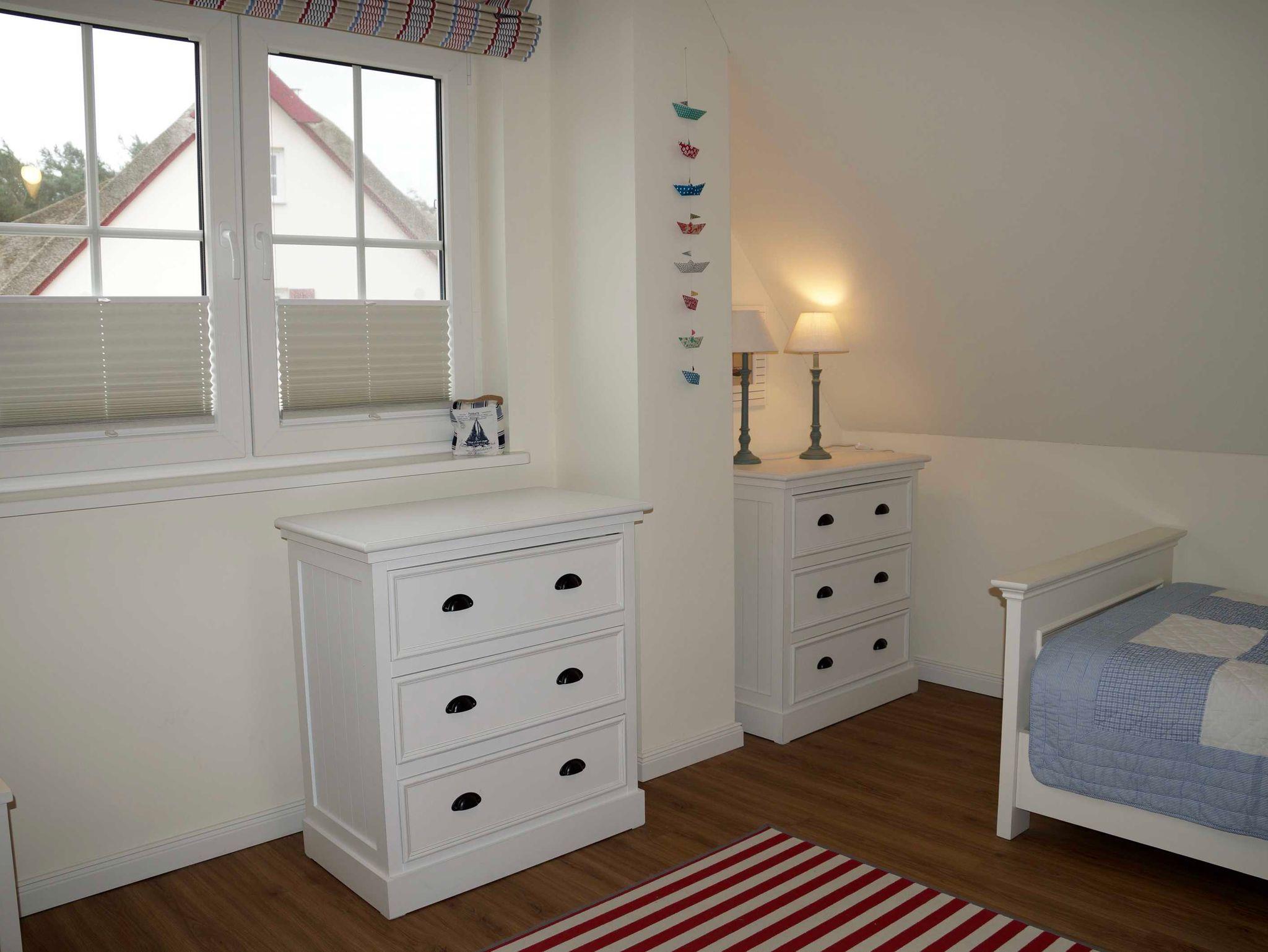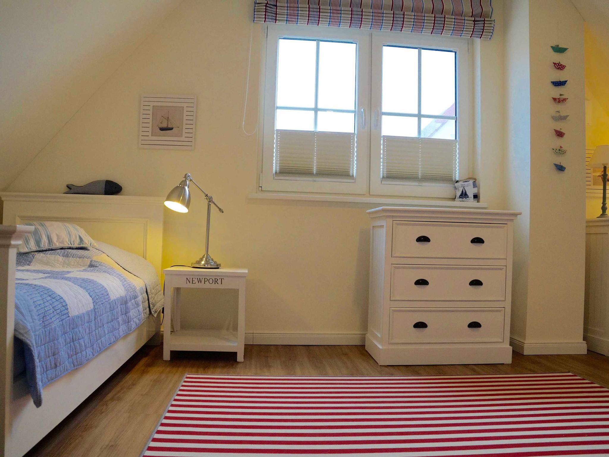 Das zweite Schlafzimmer, maritim in Rot und Blau gestaltet, verfügt über zwei Einzelbetten 90 x 200 cm, 2 Kommoden und einen Kleiderschrank.