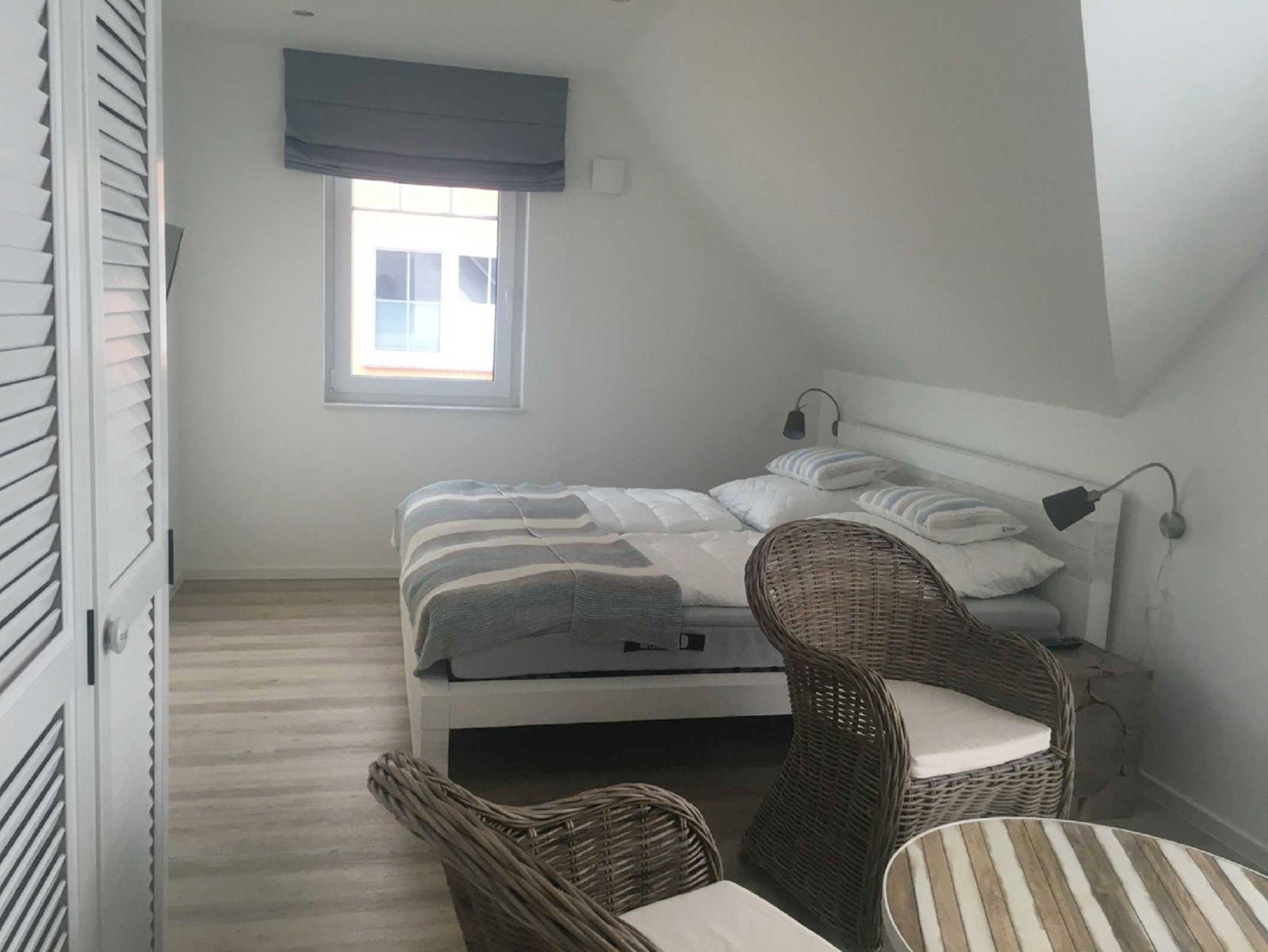 Im EG befindet sich ein kleines Schlafzimmer mit einem Doppelbett (140x190) mit TV-Gerät.