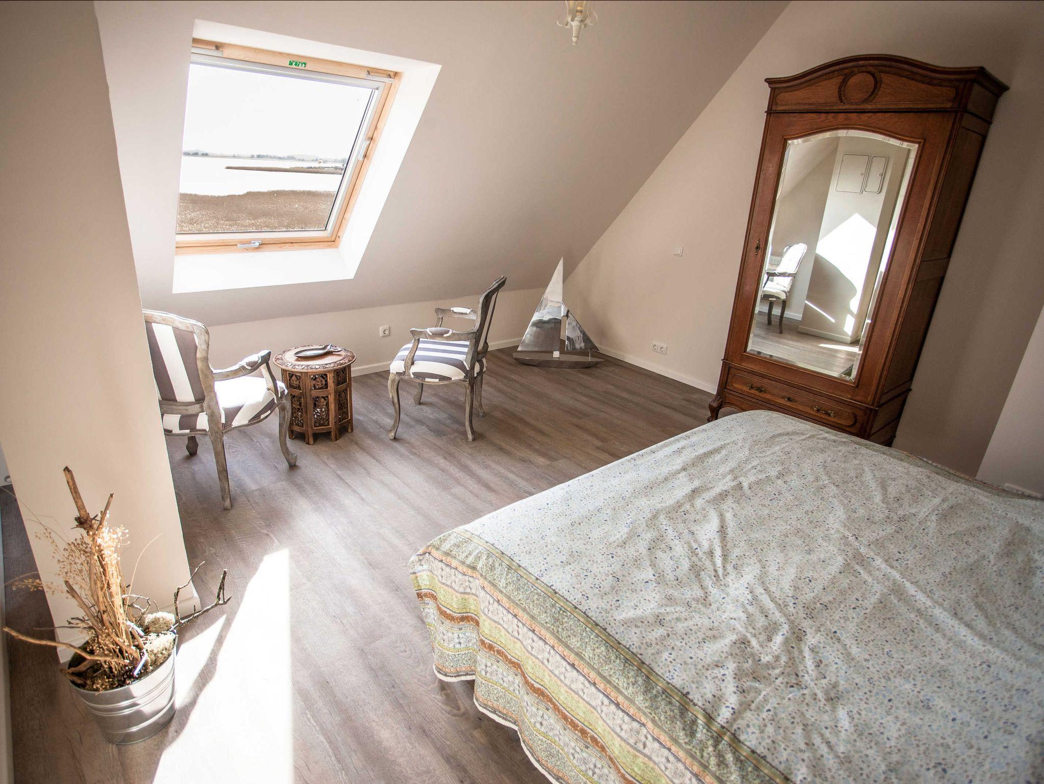 Das Obergeschoss verfügt über ein Schlafzimmer mit Doppelbett und ein Kinderschlafzimmer mit zwei Einzelbetten. Hinzu kommt im Dachgeschoss ein weiteres Schlafzimmer mit Doppelbett. Ein Kinder-/ Babybett kann zugestellt werden.