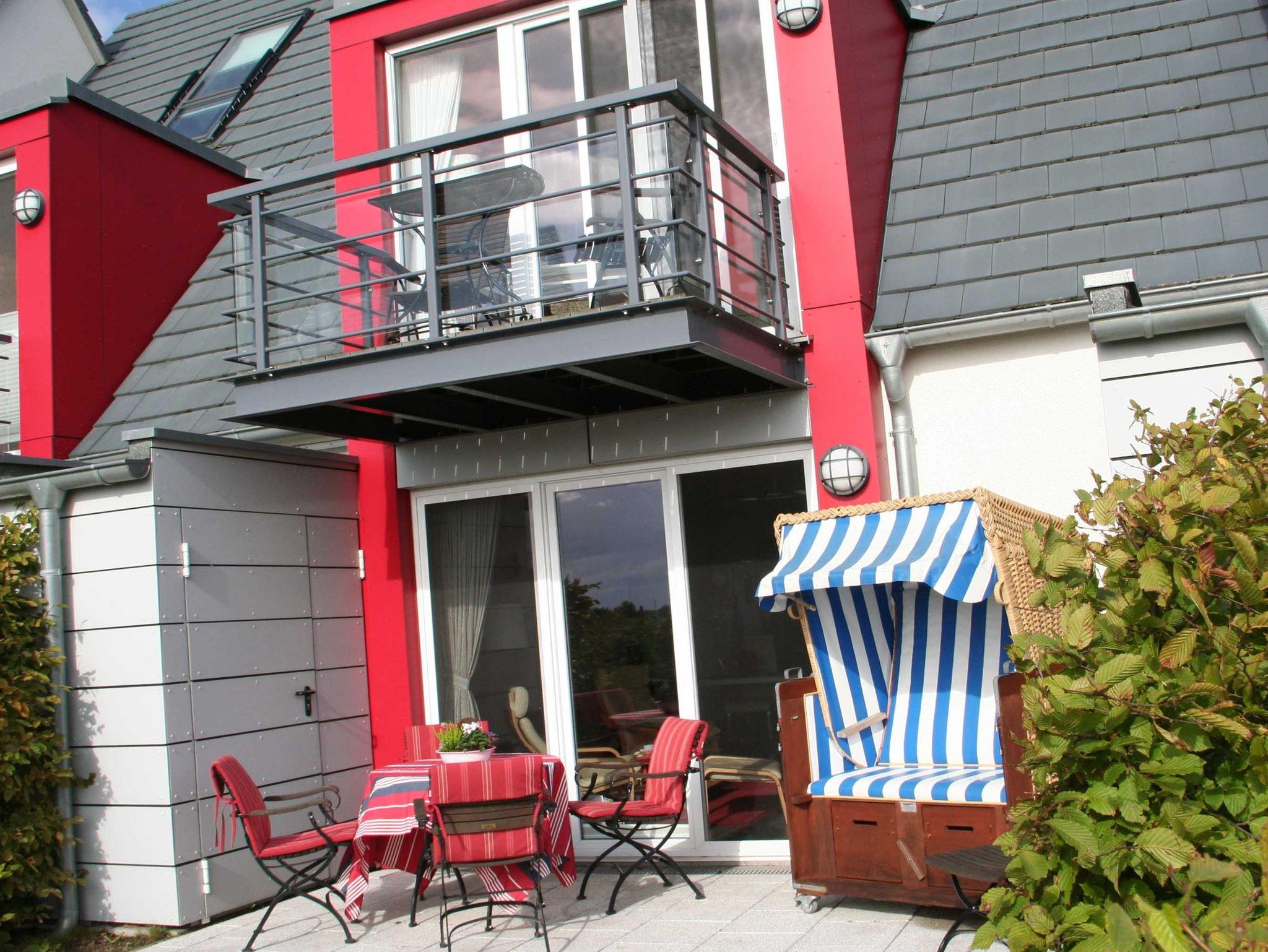Sonnenterrasse/ Balkon mit Gartenmöbeln und Strandkorb