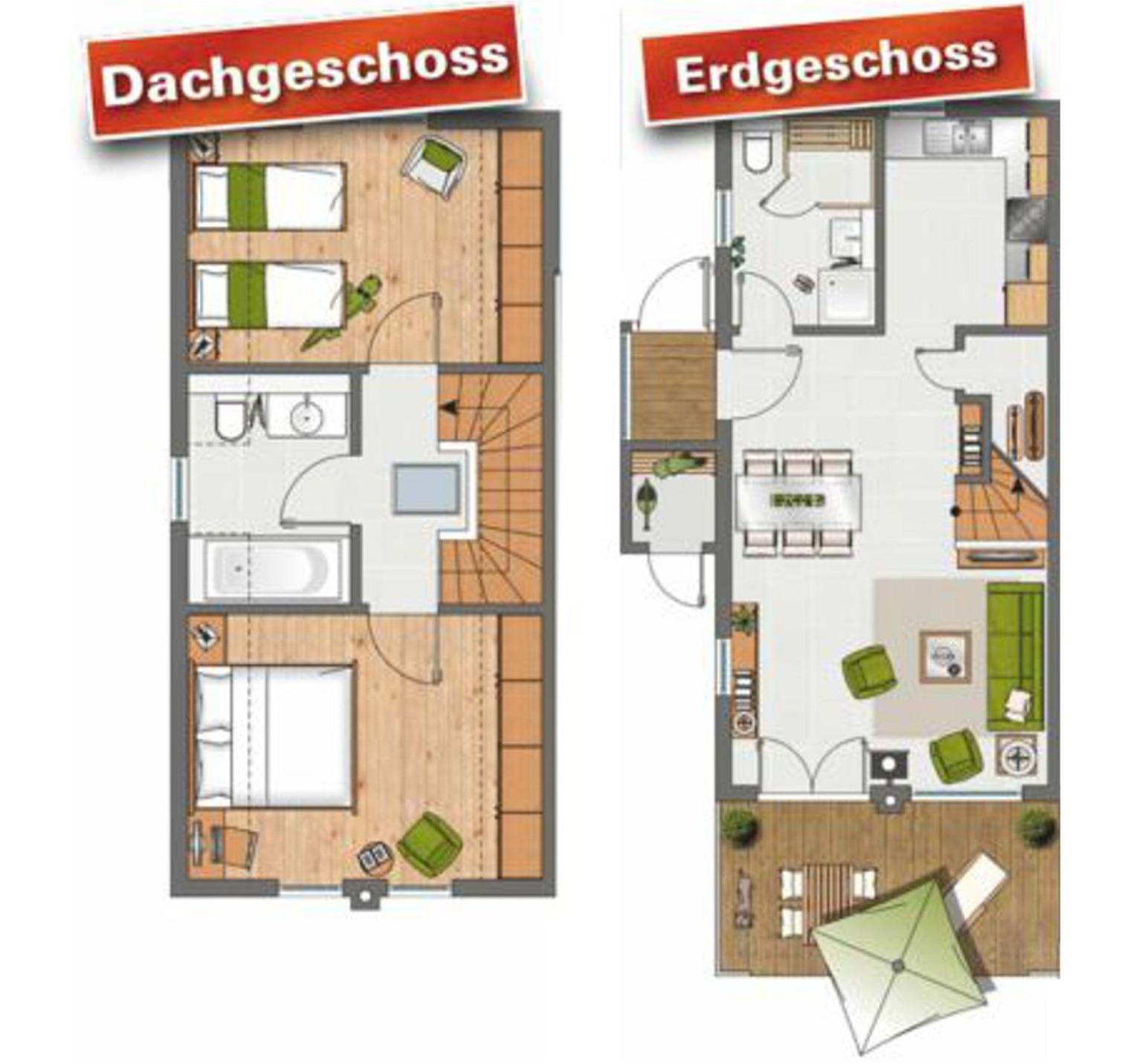 Sie erreichen die Schlafräume und das zweite Badezimmer über eine formschöne Holztreppe. Genießen Sie die ersten Minuten am Morgen oder den Ausklang des Abends im Badezimmer mit einem Ausblick "ins Grüne". Erleben Sie die Sonne und die Breegener Natur pur auf der eigenen großzügigen Terrasse. Eine Abstellmöglichkeit bietet der geschlossene Raum unter der Treppe. Wir bieten Ihnen das ideale Haus für einen perfekten Urlaub.