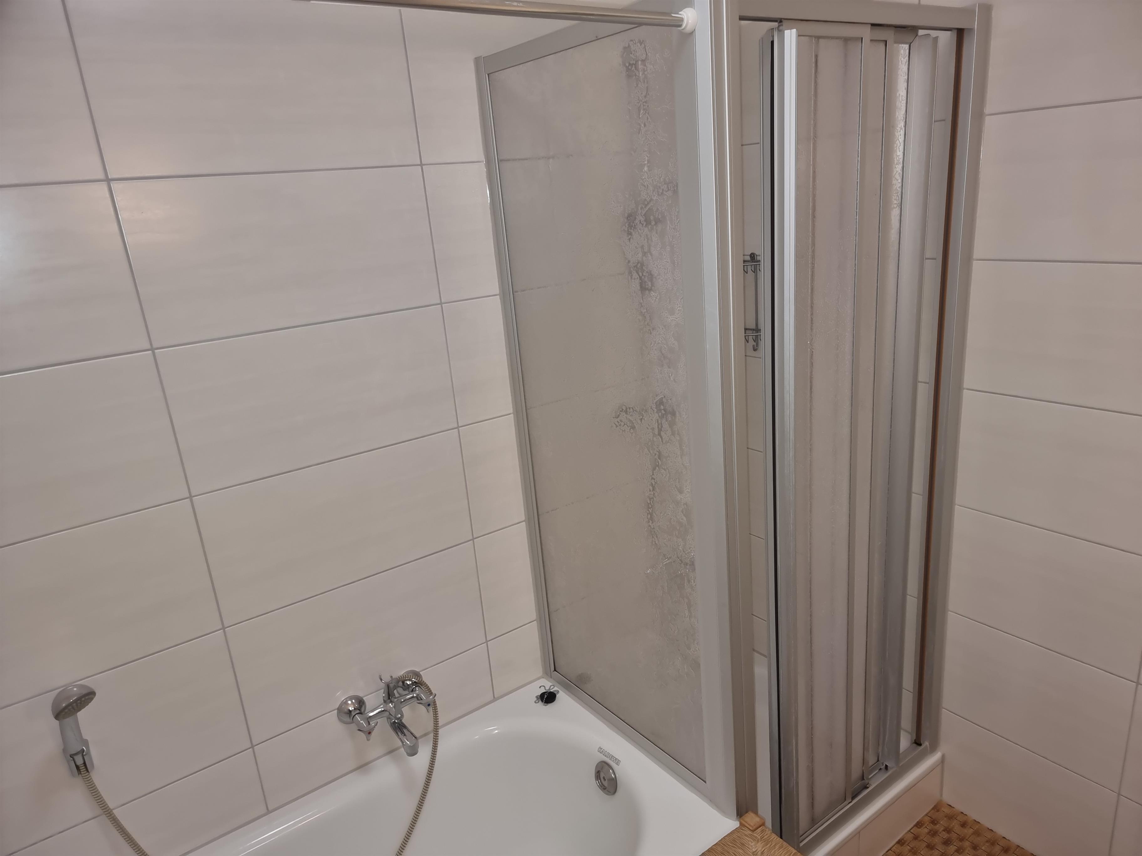 Das BADEZIMMER Ihrer Ferienwohnung verfügt über eine Wanne, Dusche, Waschbecken, Spiegel, Haartrockner und WC. Für Stauraum sorgt ein Badezimmerschrank.
