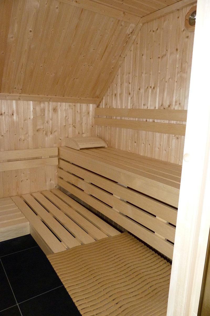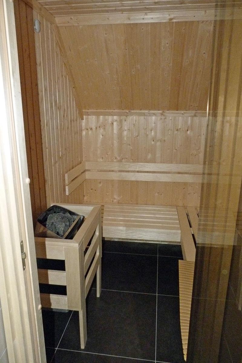 Im Obergeschoss befinden sich zwei Schlafzimmer mit je einem Boxspringbett (1 Matratze 180×200), großem Kleiderschrank und TV. Für Ihren Mini ist ein feststehendes Kinderbett vorhanden. Ein Balkon mit Aussicht auf den Bodden vervollständigt Ihre Urlaubsidylle. An das Bad mit Dusche im OG schließt eine Sauna für max. 3-4 Personen an. Ein Mückennetz in allen Räumen verschont Sie von lästigen Insekten.