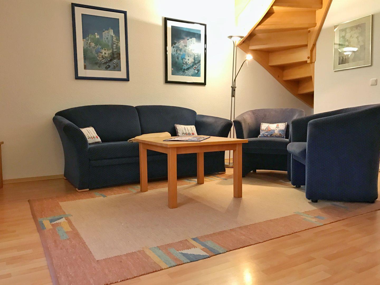 Die Maisonette-Wohnung "Ankerplatz" befindet sich im 2. Obergeschoss des vorderen Hauses der Anlage. Die gemütlich eingerichtete Ferienwohnung mit 68qm Wohnfläche bietet Platz für maximal 6 Personen. Sie verfügt über einen großen, überdachten Süd-Balkon, der einen herrlichen Blick auf den großen Jasmunder Bodden bietet und über Beleuchtung und ausreichend Sitzplätze verfügt. In der unteren Ebene der Wohnung finden Sie das gemütliche Wohnzimmer mit Zugang zum Balkon, die komplett ausgestattete Küche mit kleinem Abstellraum sowie das Gäste WC. Große, bodentiefe Fenster und Glastüren sorgen für eine helle Atmosphäre des Wohnbereiches. Über eine Treppe gelangen Sie in die Schlafebene des charmanten Ferienappartements. Hier finden Sie das Elternschlafzimmer mit Doppelbett, das Kinderzimmer mit 2 Einzelbetten und das Badezimmer mit Dusche und WC. Es steht ein schnelles und unbegrenztes Internet und Smart TV mit Netflix/Prime zur Verfügung, ein Blue-Ray- und ein DVD-Player sowie eine Musikanlage mit CD. Weitere Annehmlichkeiten wie Bücher, CD´s, DVD´s, Kinderbücher und Kinderspiele finden Sie ebenfalls in der Wohnung. Die Küche bietet einen Kühlschrank mit Gefriermöglichkeit, Filterkaffee-Maschine, Toaster, Wasserkocher und Mikrowelle. Im Bad gibt es einen Fön und einen Handtuchheizkörper. Im Hauswirtschaftsraum finden Sie einen Staubsauger und Reinigungsmittel. Zur Wohnung gehört ein kostenfreier KfZ-Abstellplatz in der Tiefgarage.