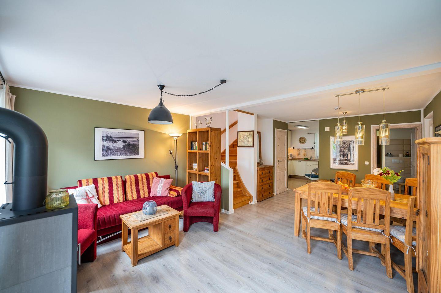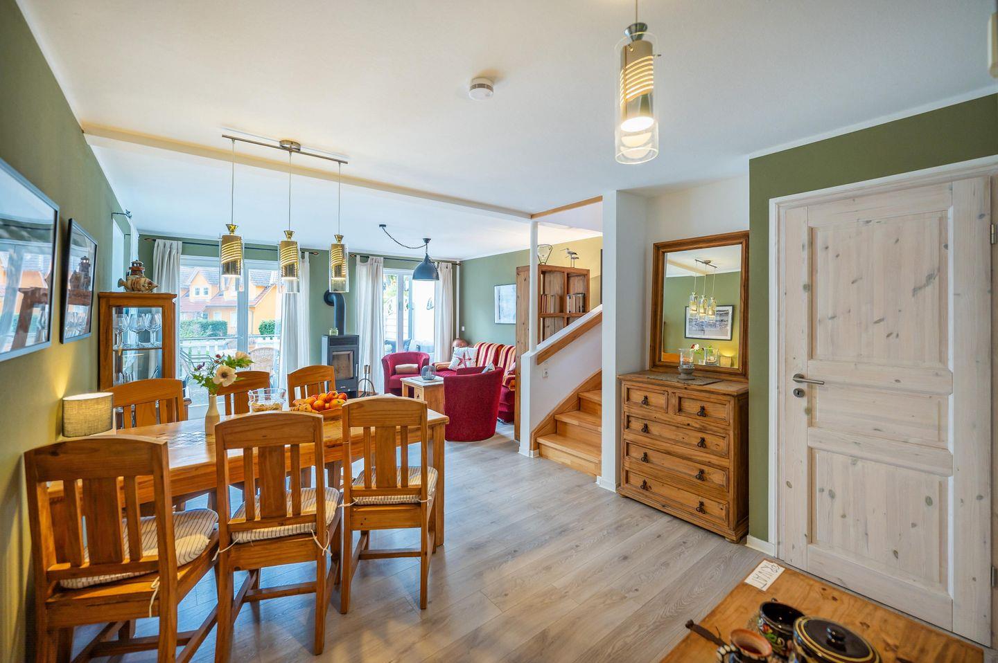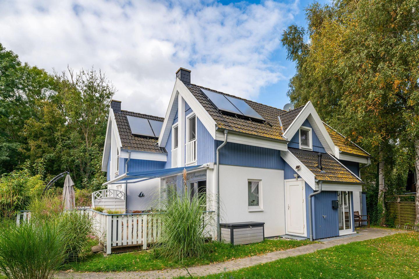 Das Ferienhaus "Wassermann" bietet Platz für bis zu 4 Erwachsene und ein Kleinkind. Der einladende Wohnbereich mit Kaminofen und die offene, voll ausgestattete Küche laden zum gemeinsamen Kochen ein, während zwei helle Schlafzimmer und zwei moderne Bäder samt finnischer Sauna für Komfort sorgen. Entspannen Sie auf der großzügigen Holzterrasse oder entdecken Sie die nahegelegenen Strände und Sehenswürdigkeiten wie das Kap Arkona oder die Insel Hiddensee.
