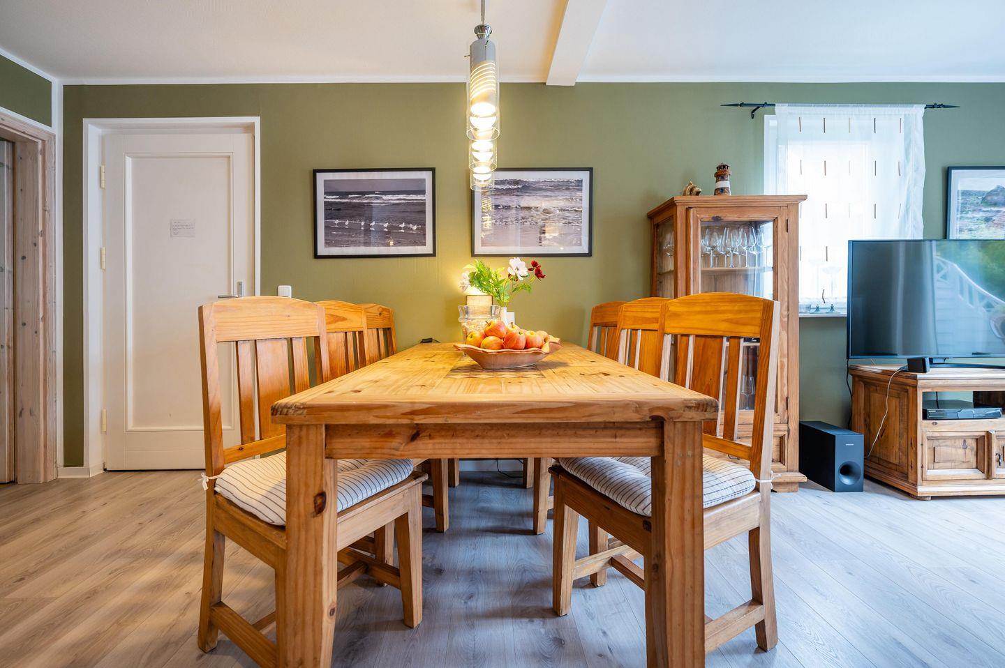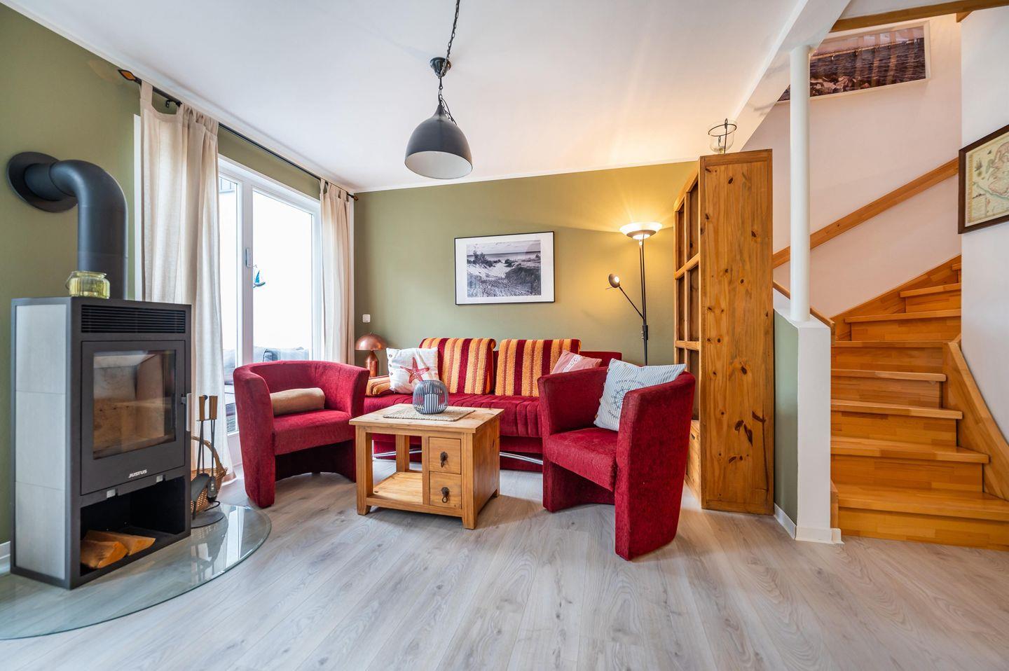 Willkommen im Ferienhaus “Wassermann”, das auf großzügigen 80 m² Platz für bis zu 4 Erwachsene und ein Kleinkind bietet. Ein wunderbarer Ort für entspannte Urlaubstage zu jeder Jahreszeit! Der gemütliche Wohnbereich mit bequemer Schlafcouch, Sessel und einem drehbaren Kaminofen schafft eine einladende, wohlige Atmosphäre. Die voll ausgestattete, zum Wohnzimmer offene Küche lädt zum gemeinsamen Kochen ein. Im Obergeschoss warten zwei Schlafzimmer mit bodentiefen Fenstern, die viel Licht und Komfort bieten. Dank Insektenschutz ist auch in lauen Sommernächten Erholung garantiert. Das Haus verfügt über ein modernes Bad mit Dusche und finnischer Sauna im Erdgeschoss, deren Nutzung Sie auf Wunsch gegen eine geringe Gebühr für die Dauer Ihres Aufenthalts hinzubuchen können, sowie ein weiteres mit Badewanne im Obergeschoss. Die großzügige, möblierte Holzterrasse bietet alle Voraussetzungen, um im Freien zu entspannen und die Sonne zu genießen. Auf Wunsch spendet Ihnen eine hochwertige, elektrische Markise Schatten. Nutzen Sie gern die Sonnenliegen, um auch im kleinen Gartenbereich hinter dem Haus die Seele baumeln zu lassen. Ein Pkw-Stellplatz befindet sich direkt am Haus.