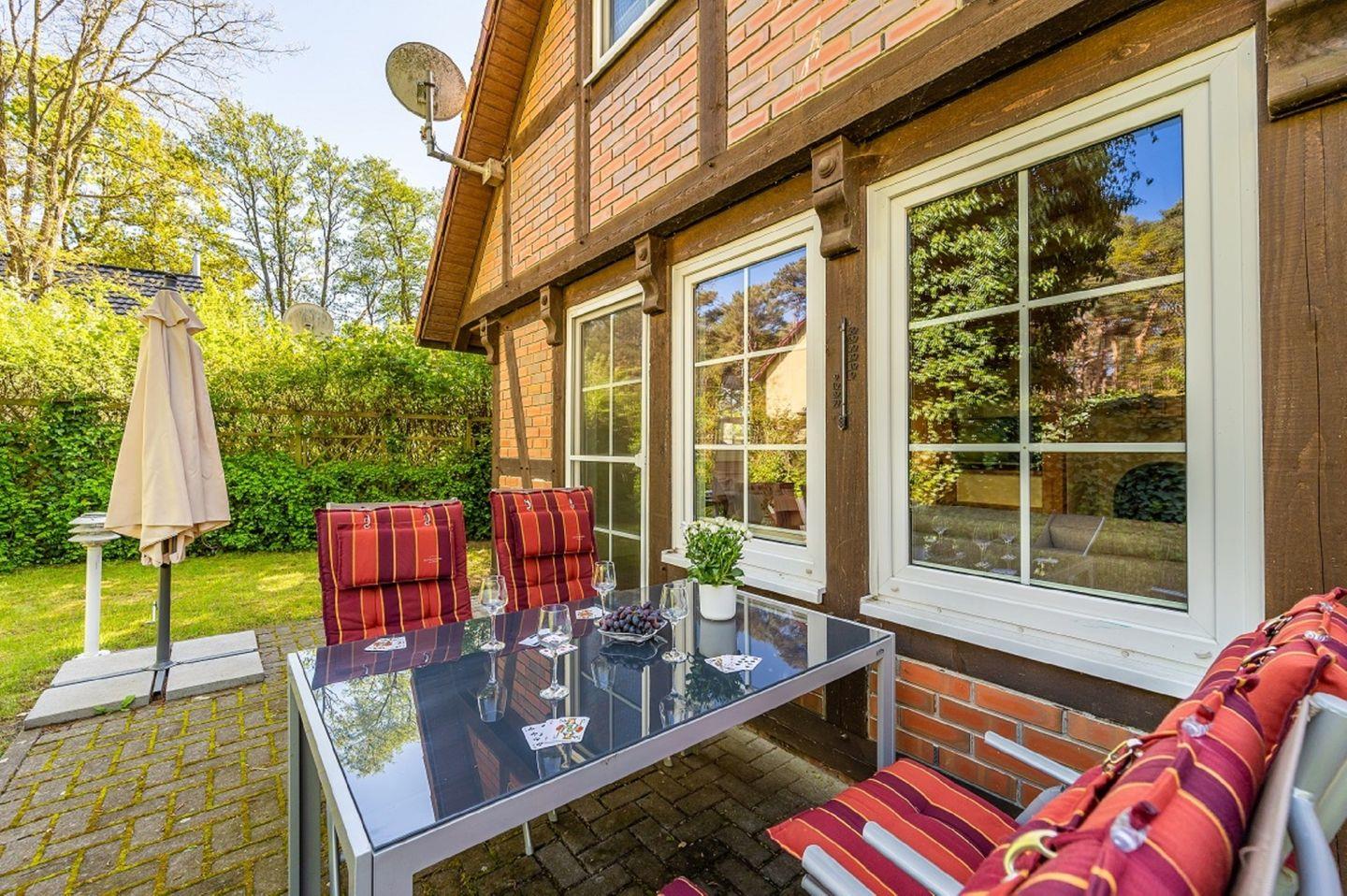 Im Mai 2020 liebevoll neu eingerichtet, wartet das Ferienhäuschen “Dünenwald” darauf, bis zu vier Personen und einem Kleinkind eine heimelige Unterkunft zu sein. Das komplett eingezäunte Grundstück von 200 m² sorgt für Privatsphäre und ist ideal für einen entspannten Urlaub mit Ihrem Hund. Der Wohnbereich mit Kaminofen schafft eine gemütliche Atmosphäre voller warmer Farben, während die komplett eingerichtete Küche zum gemeinsamen Kochen einlädt. Das Ferienhaus verfügt über zwei Schlafzimmer, eines mit Doppelbett und eines mit zwei Einzelbetten. Ein zusätzliches Kinderreisebett mit Matratze (ohne Kopfkissen und Decke) sowie ein Hochstühlchen stehen zusätzlich zur Verfügung. Die möblierte Terrasse, ausgestattet mit einem klappbaren Tisch und vier Stühlen sowie zwei Sonnenliegen, ist perfekt für entspannte Stunden im Freien. Ein abschließbare Gartenhaus bietet zusätzlichen Stauraum für Ihre Fahrräder.