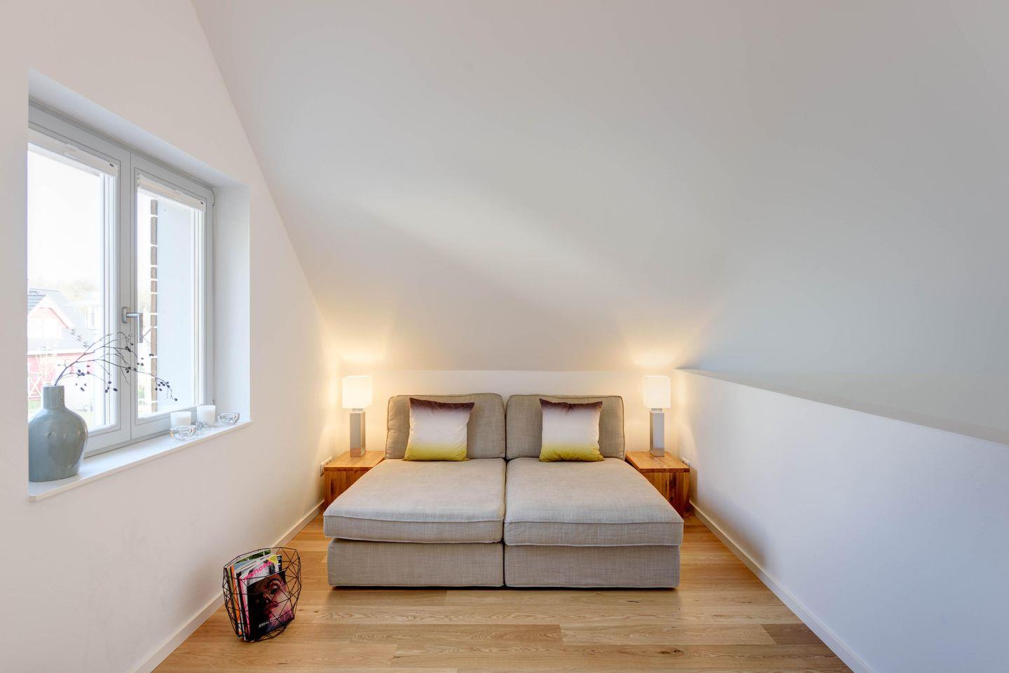 Das Obergeschoss bietet eine offene Galerie mit Ruhebereich. Machen Sie es sich auf den Recamieren mit Ihrer Lieblingsmusik gemütlich oder stöbern Sie in der kleinen Bibliothek. Zwei Schlafzimmer – eines mit Doppelbett, eines mit zwei Einzelbetten – sowie ein zweites Bad mit Espenholz-Sauna, Ruhebank und exklusiver Ausstattung runden den Komfort im Obergeschoss ab.
