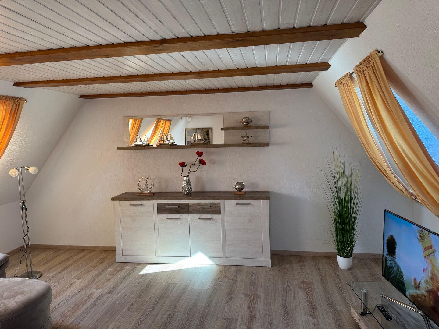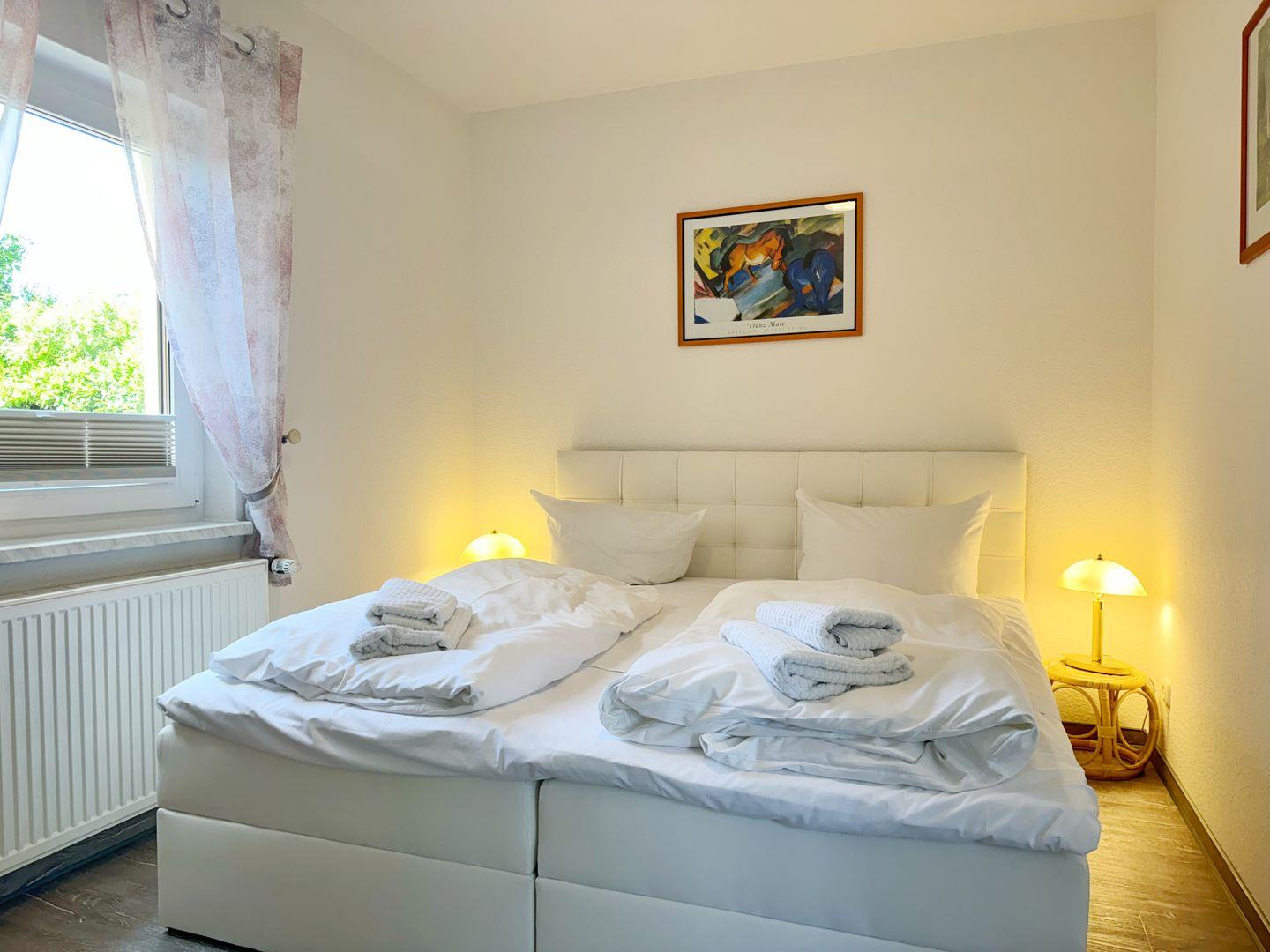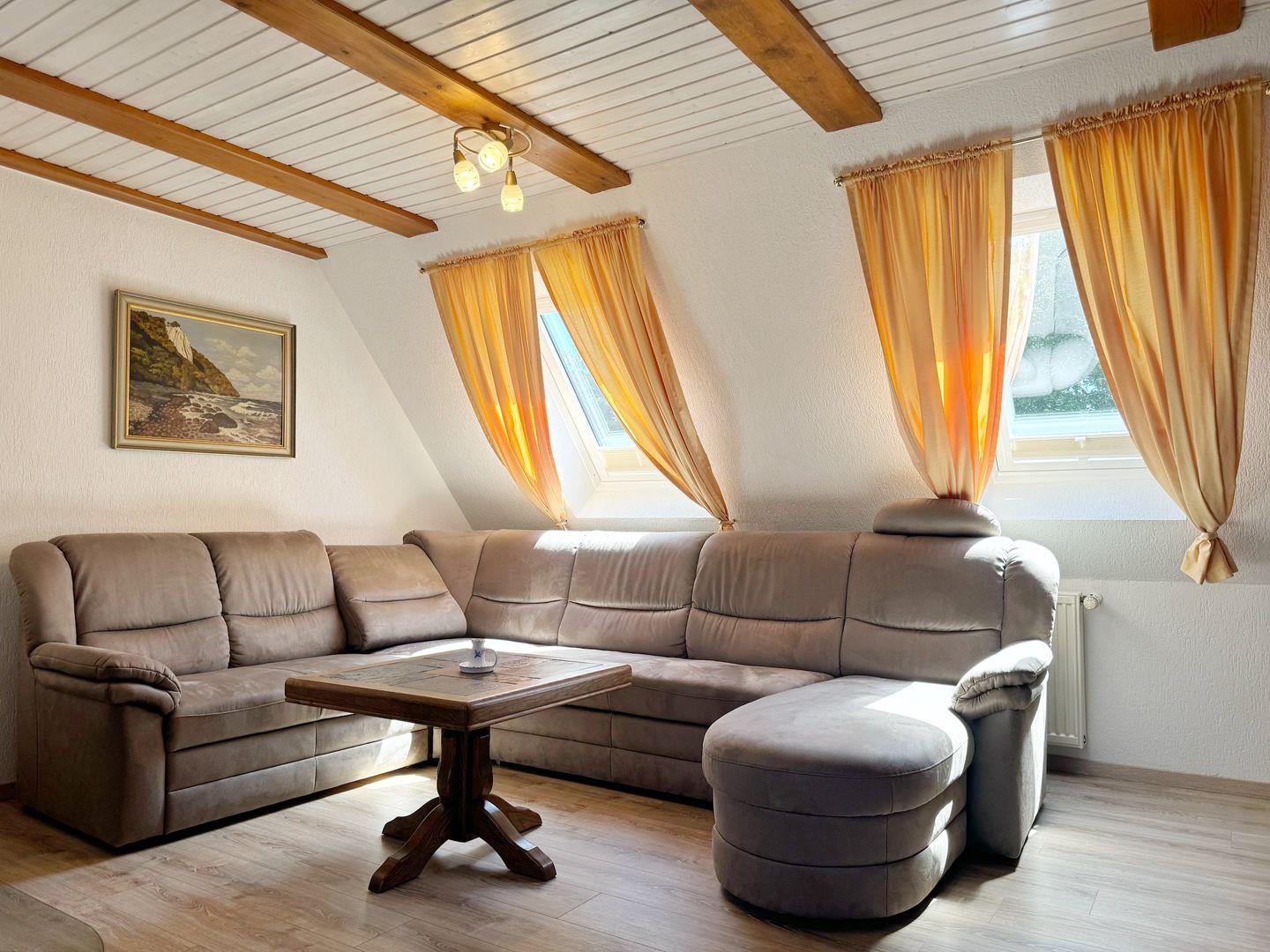 Im 1. Obergeschoß gibt es ein zweites Schlafzimmer mit Doppelbett sowie ein Wohnzimmer mit gemütlicher Couchecke, die Couch kann für einen fünften Schlafplatz ausgezogen werden. Sowohl im Esszimmer als auch im Wohnzimmer gibt es einen Flachbild-TV.