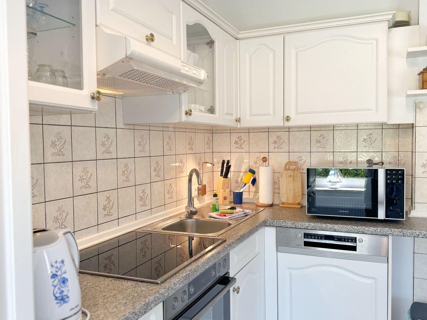 Das Ferienhaus hat eine Wohnfläche von 103qm auf 2 Etagen. Im Erdgeschoß gibt es neben einer Diele ein Schlafzimmer mit Doppelbett, ein großes, helles Wohn-Esszimmer mit integrierter, offener Küche. Die Landhausküche bietet allen Komfort wie Ceranherd, Backofen, Geschirrspüler, Mikrowelle, Kaffeemaschine, Wasserkocher und Toaster.