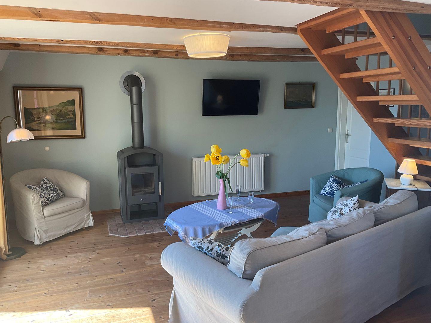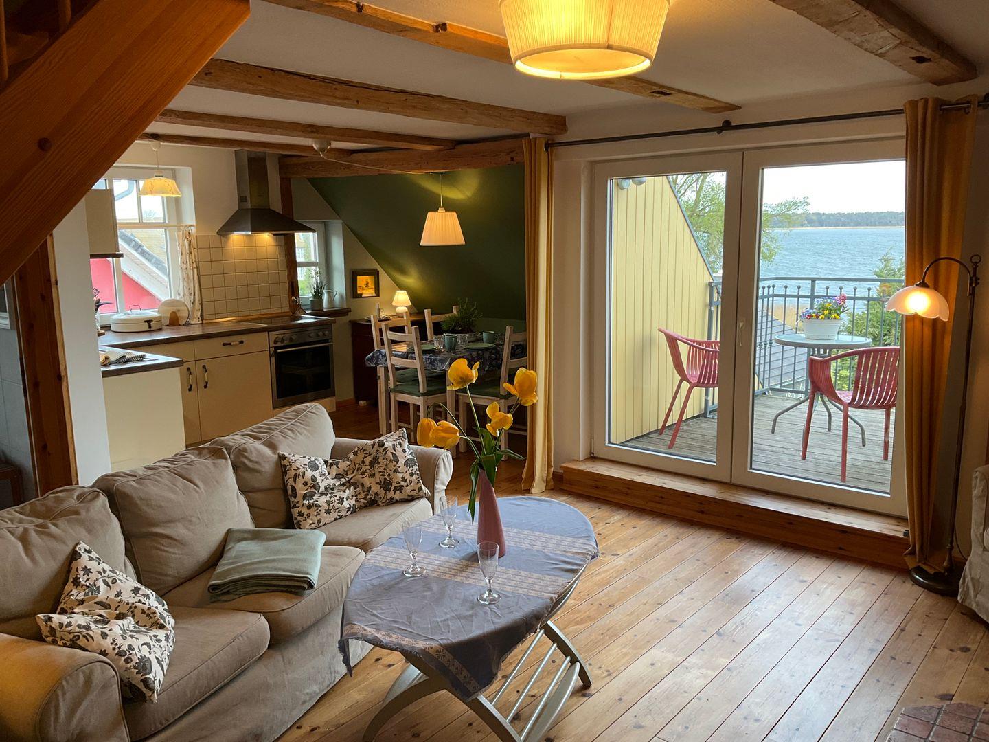 In einem authentischen Kapitänshaus unmittelbar am Breeger Hafen erwartet Sie die bezaubernde Ferienwohnung "Hafen". Modern und gemütlich ist die Wohnung im skandinavischen Stil mit viel Echtholz eingerichtet. Genießen Sie den atemberaubenden Blick über den Bodden und lassen Sie sich von der Ruhe der Umgebung verzaubern. Mit drei Schlafzimmern (die Betten sind frisch bezogen, wenn Sie ankommen) bietet diese Wohnung ausreichend Platz für Familien und Freunde. Ein Kinderbett und ein Hochstuhl stehen außerdem zur Verfügung. Die voll ausgestattete Küche lädt dazu ein, gemeinsam zu kochen, während der Kaminofen für wohlige Stunden bei kuscheliger Atmosphäre sorgt. Zwei Terrassen – eine mit umwerfendem Wasserblick, eine zum Hof – bieten Raum und Luft, um die Seele baumeln zu lassen.