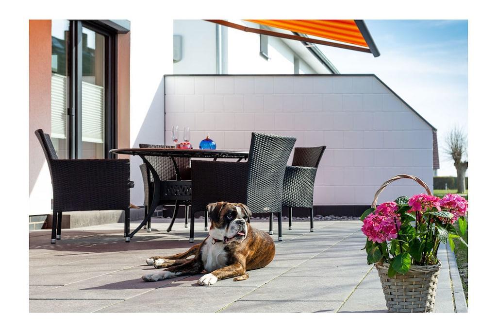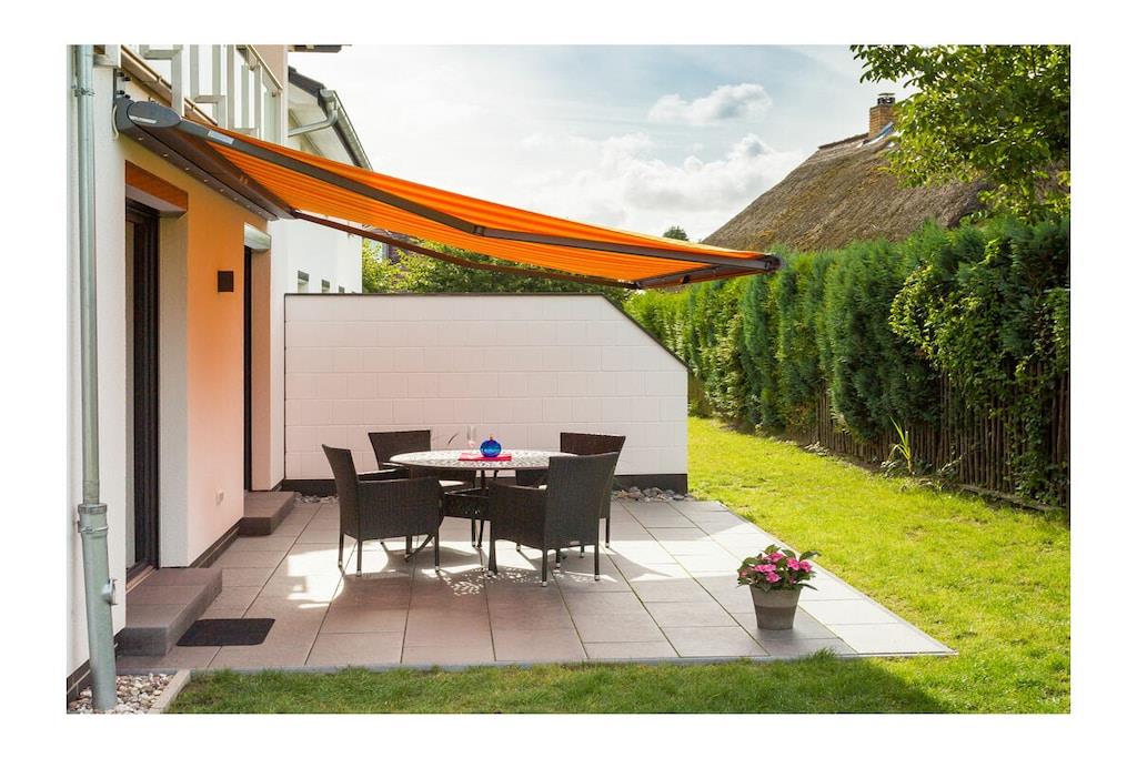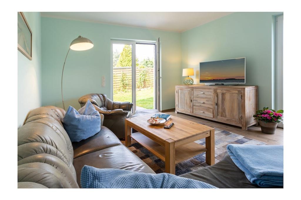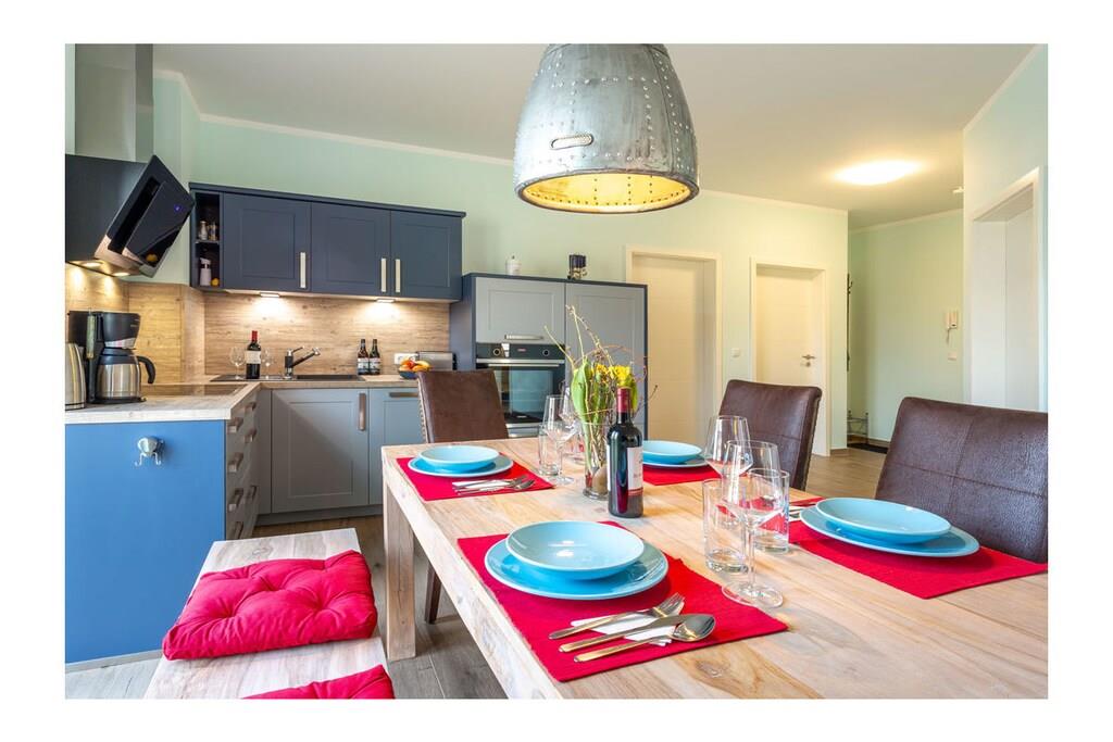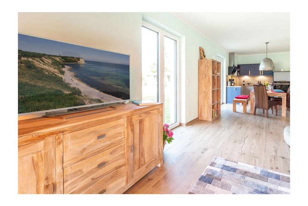 Parterre: großzügiger Wohn- & Essbereich mit gemütlicher Wohnlandschaft zum Ausziehen, TV/Sat (Flatscreen), kostenloses WLAN, Radio/CD, DVD-Player, Gesellschaftsspiele für gemütliche Abende vorhanden, voll eingerichtete Einbauküche mit 4-Plattenherd (Ceran), Backofen, Kühlschrank mit kleinem Gefrierfach, Geschirrspüler und diversen Elektrogeräten (z.B. Kaffeemaschine, Wasserkocher, Toaster), Badezimmer mit WC und Regendusche, Wäscheständer und Föhn, 1. Schlafzimmer mit Doppelbett (getrennte Matratzen je 90 x 200) und geräumigen Kleiderschrank, 2. Schlafzimmer mit zwei komfortablen Einzelbetten (je 90cm x 200cm), Kleiderschrank, Schreibtisch und Schaukelstuhl, Flur mit Garderobe Außenbereich: 25m² große Terrasse mit Gartenmöbel für 4 Personen und elektrische Sonnenmarkise Besonderes: Erstvermietung Mai 2019 – Urlaub im Dreimasterhaus im schönen Seebad Breege/ Juliusruh! Die Wohnung ist eine Nichtraucherwohnung und ist nach Süden und Westen ausgerichtet. Internet/ WLAN steht kostenfrei zur Verfügung. Alle Räume sind mit Fußbodenheizung ausgestattet. Die Fenster sind mit elektrisch bedienbaren Rollläden abdunkelbar. Die Remise ist abschließbar und kann für das Abstellen von Fahrrädern genutzt werden. 1 PKW- Stellplatz am Haus steht zur Verfügung. Auf der Terrasse haben Sie die Möglichkeit zu grillen. Ein Grill ist vorhanden. Haustiere nach Absprache (Gebühr 5 Euro pro Nacht/ pro Haustier)