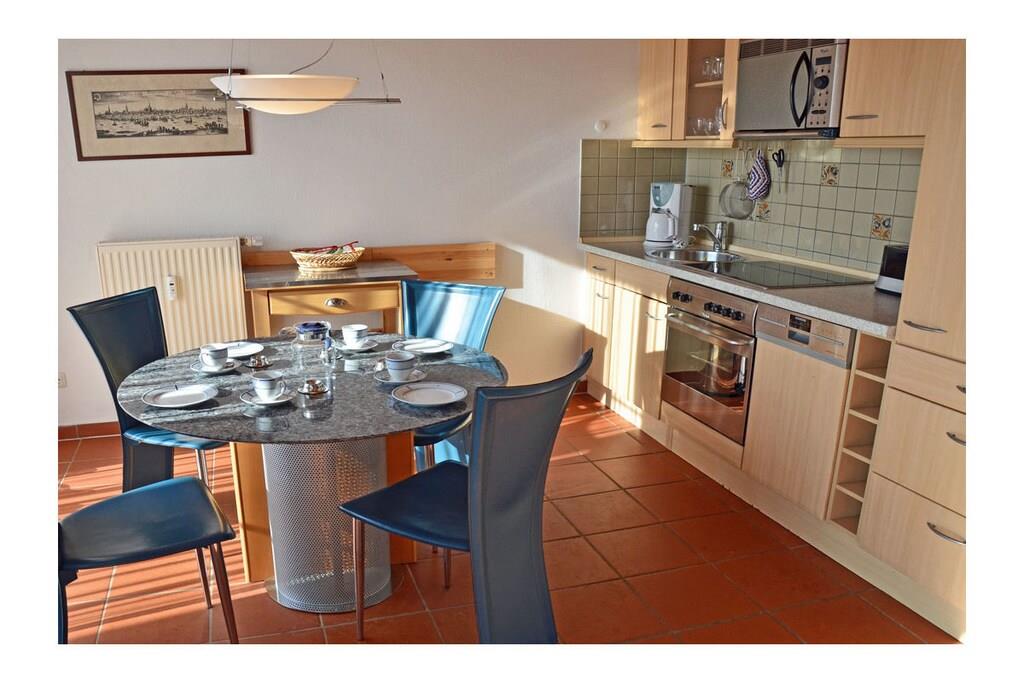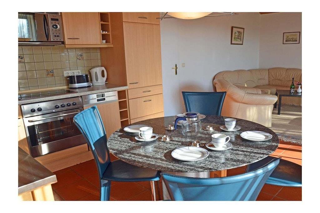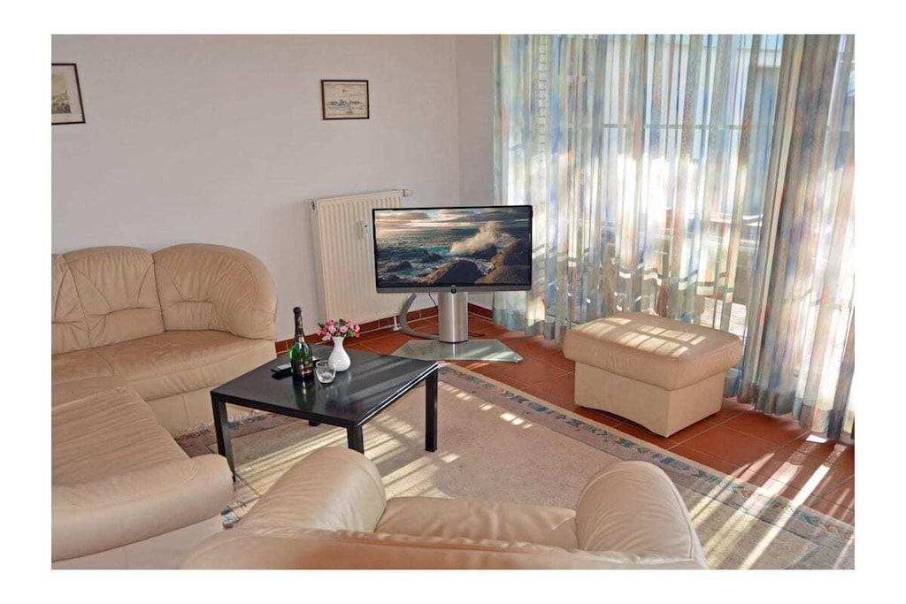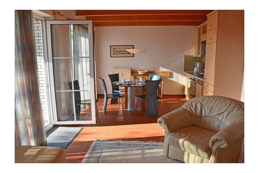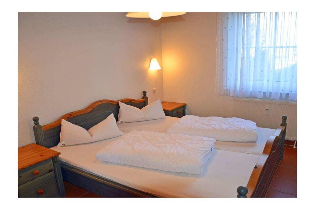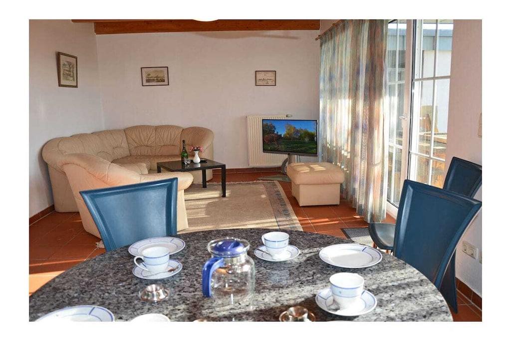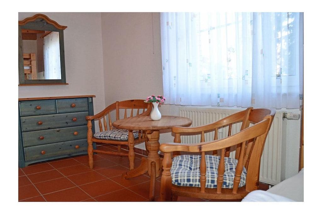 Rustic and cozy country-style holiday apartment with its own private garden (approx. 400 sq m), terrace with seating and sun loungers, and a second terrace with a barbecue fireplace. Living room with sofa area, TV/satellite (flat screen), free Wi-Fi, fully equipped fitted kitchen with various appliances, four-burner ceramic hob with oven, refrigerator with small freezer compartment, dishwasher, and microwave. First bedroom with a double bed (two 90 x 200 cm mattresses) and large wardrobe, second bedroom with a bunk bed (each 90 x 200 cm), sitting area, and mirrored dresser. Bathroom with walk-in shower. Parking space directly at the property. Bicycle storage on the fenced/lockable terrace (no shed). “Breege – the charming seaside resort” This holiday apartment is located in the north of Rügen in the fishing village of Breege, a recognized holiday destination since 1883. ) Together with the municipality of Juliusruh, Breege has formed a seaside resort since 1928. You will be staying in close proximity (approx. 10 minutes on foot) to the beautiful, fine sandy beach of the Schaabe, at 12 km the longest natural bathing bay on the island of Rügen. The harbor of Breege (approx. 5 minutes on foot) is a popular destination and the starting point for ferry trips to Hiddensee and Ralswiek for the Störtebeker Festival. Approximately 2 km away in Altenkirchen, you will find a Netto supermarket, the "Stolz" department store, an Edeka supermarket, and a beverage store. Restaurants and bicycle rentals are nearby. There are excellent cycling and hiking opportunities for exploring the island. Pets are welcome by prior arrangement (fee: EURO5 per pet per night).