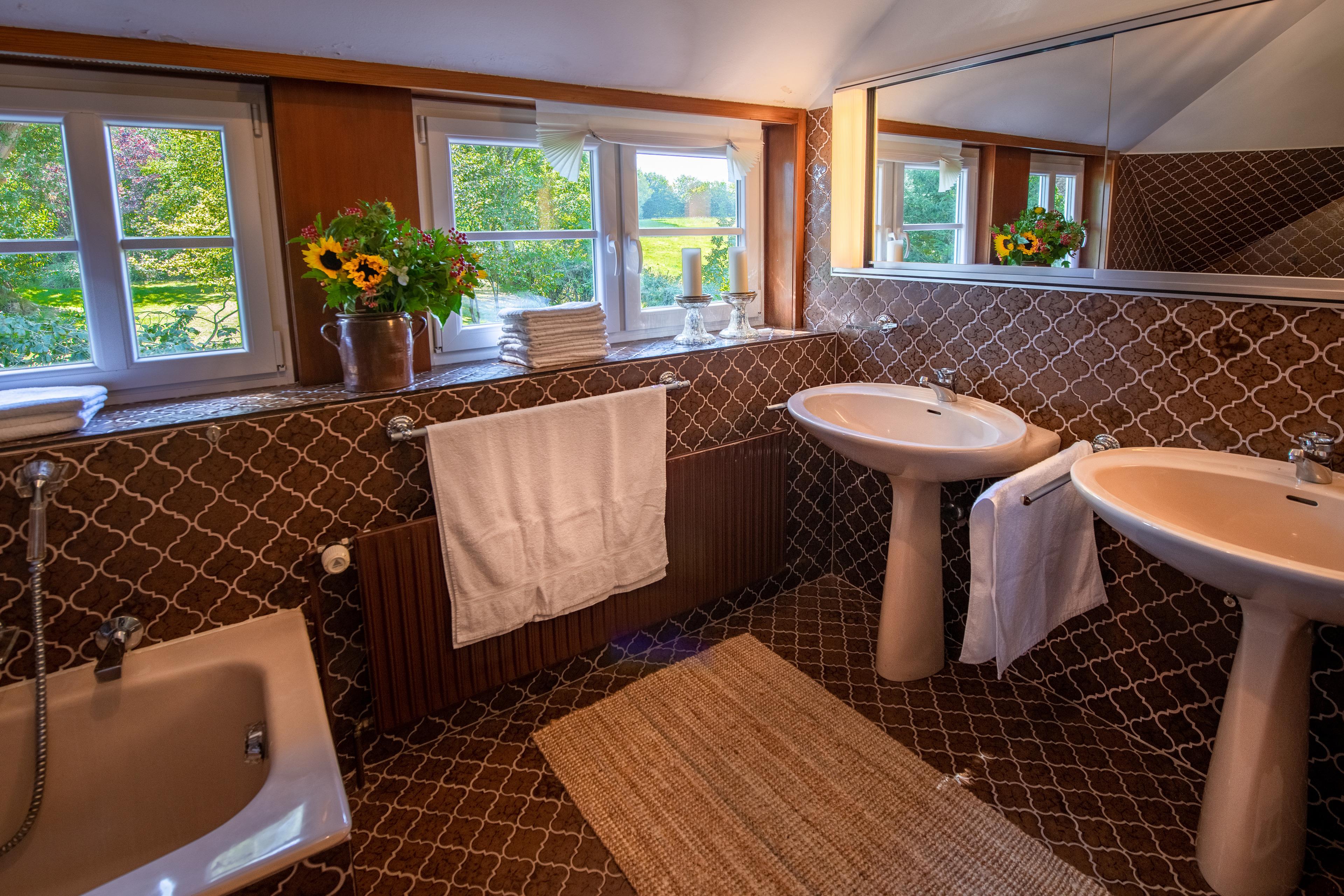 1 großes Bad mit Dusche, Badewanne & Doppelwaschbecken