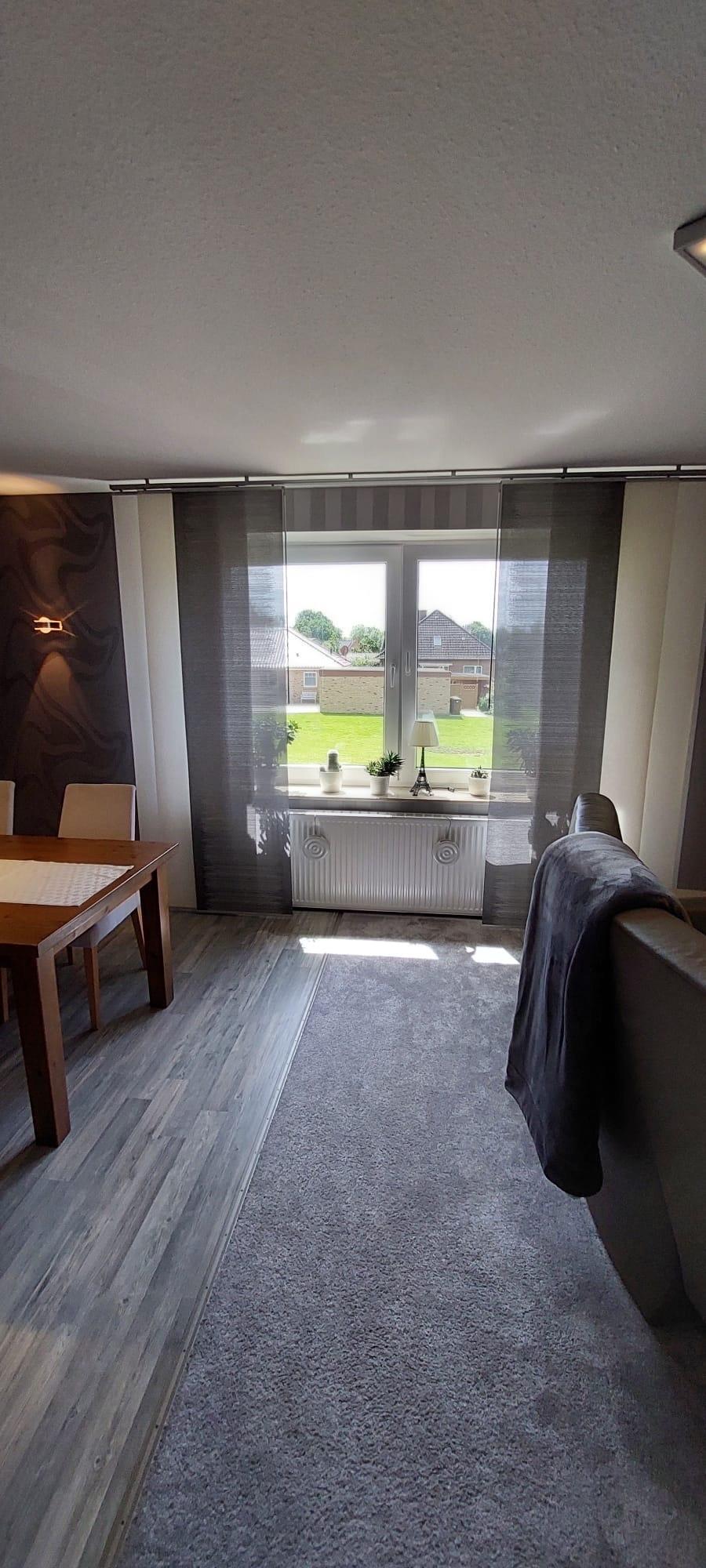Es erwartet Sie eine moderne, liebevoll eingerichtete Wohnung im Obergeschoss mit zwei Schlafzimmern, einer Küche mit kleinem Essplatz, einem geräumigen Wohnzimmer mit einem großen Essplatz, ein Duschbad mit Waschmaschine und ein kleiner Abstellraum.