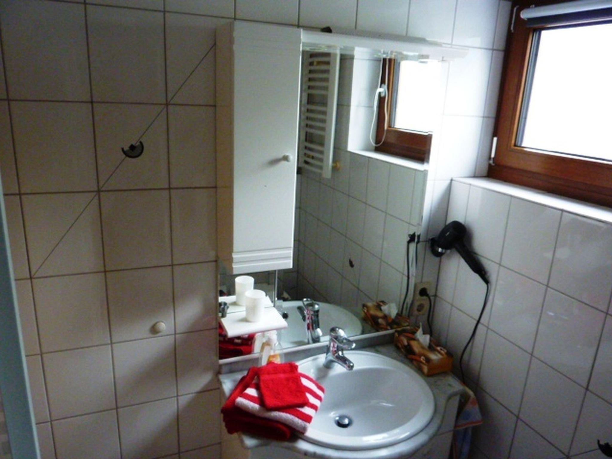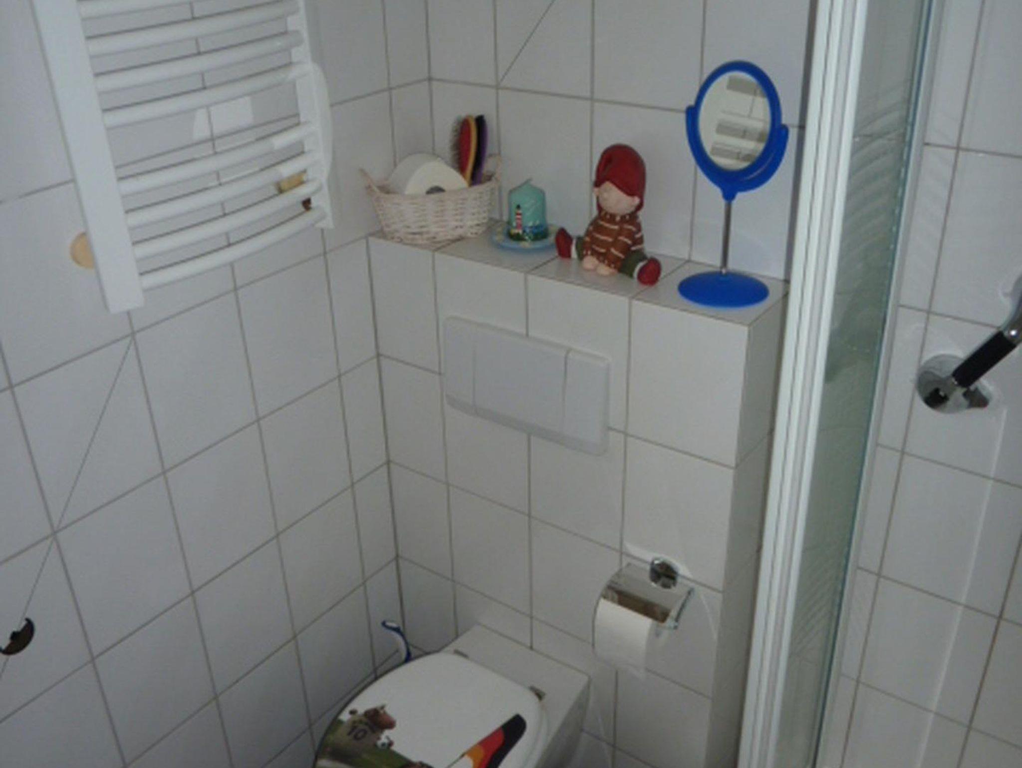 Das Bad ist ausgestattet mit Dusche, WC, Fön und Handtüchern.