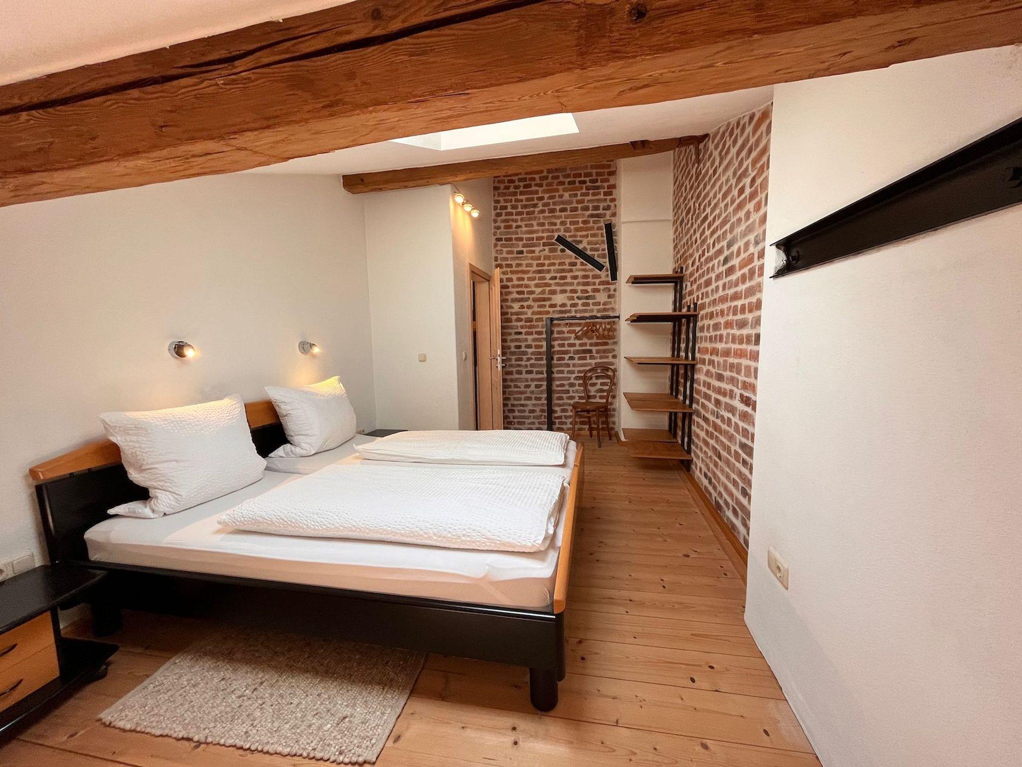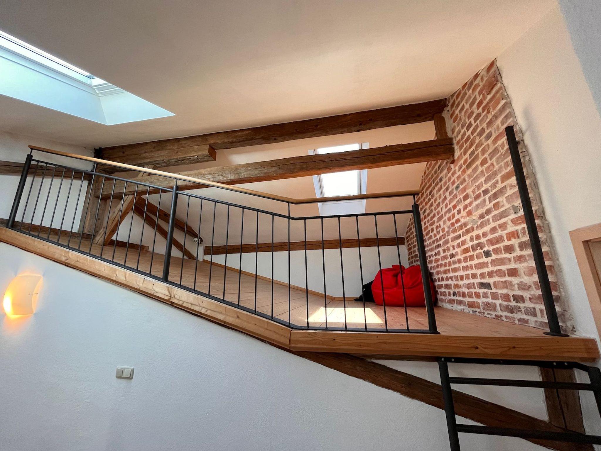Die Ferienwohnung Ludwig befindet sich im ersten Obergeschoss und erstreckt sich über 2 Etagen. Auf der ersten Etage befindet sich eine große, voll ausgestattete Wohnküche mit Spülmaschine, Essplatz und einer gemütlichen Couch, das Bad und ein Schlafzimmer mit Etagenbetten. Über eine offene Treppe gelangt man in das Obergeschoss mit zwei weiteren Schlafzimmer und einem Chillroom. Ein Gemeinschaftsbalkon ist im ersten Stock über den Hausgang zu erreichen.
