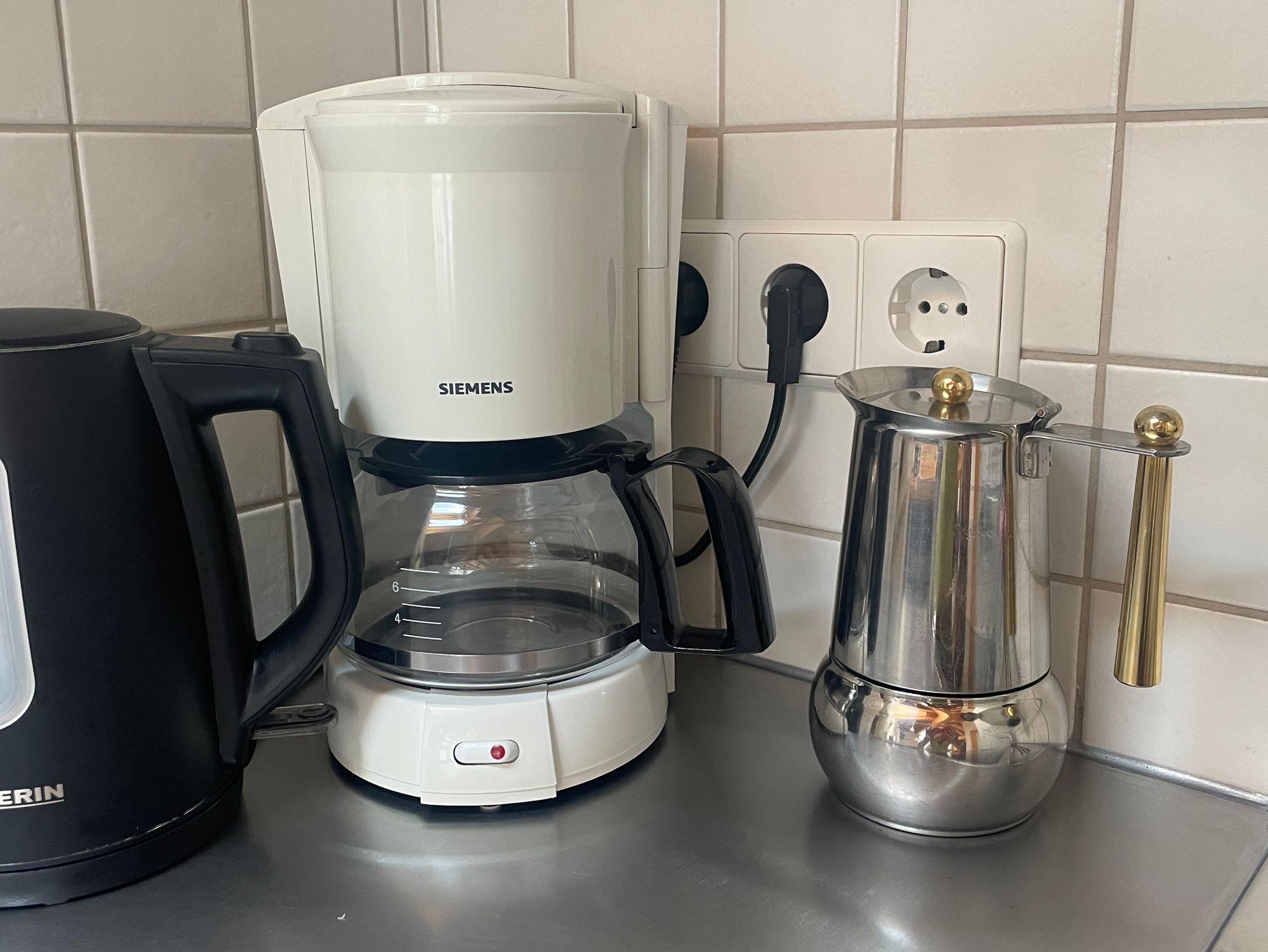 Küche mit Herd (2 Ceran-Elektroherdplatten und eine zusätzliche Induktionskochplatte), Dunstabzug, Einbaubackofen mit Mikrowelle, Spülmaschine, Kühlschrank mit Gefrierfach, Toaster, Kaffeemaschine, Espressokocher, Wasserkocher, Handmixer, Smoothiemaker/Standmixer, Salz, Pfeffer, Zucker und Mehl vorhanden;