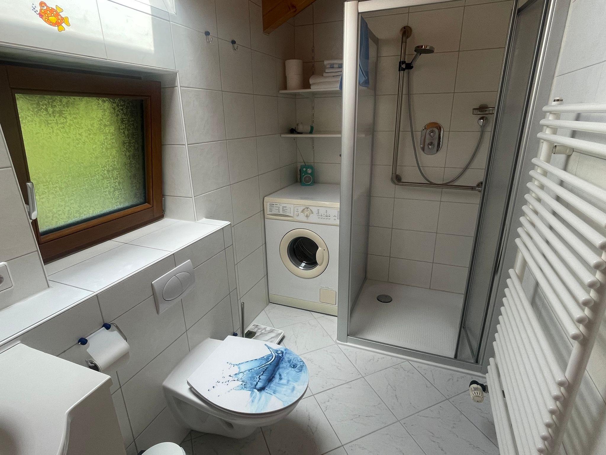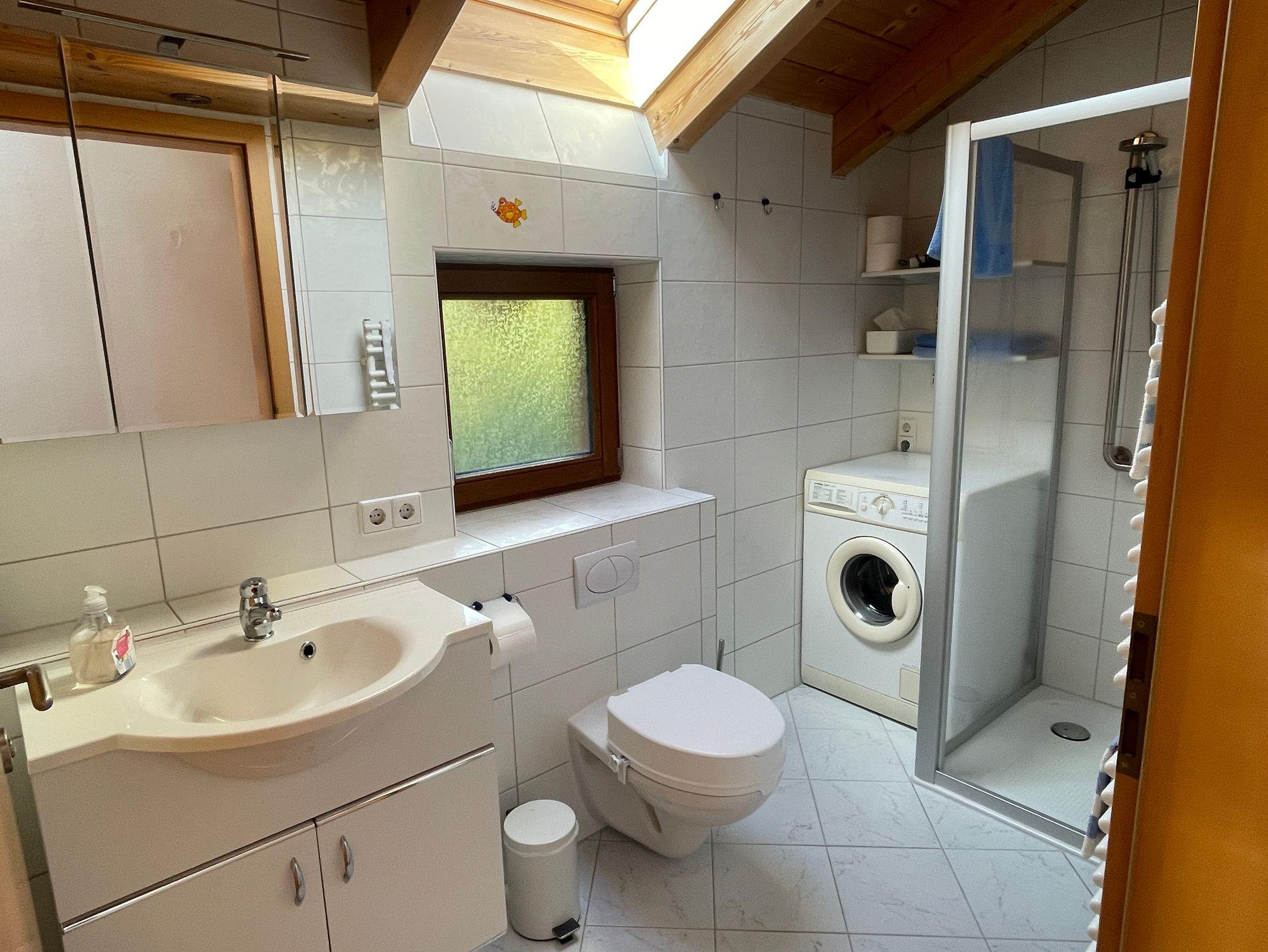 Bad (4,5qm) mit Fenster und Dachfenster, Spiegelschrank, Vergrößerungsspiegel, Dusche mit herabklappbarem Sitz und fester Haltestange, WC (Sitzerhöhung möglich), Waschmaschine + Waschmittel, Haartrockner, Handseife, Handtücher, Badetücher, Duschvorleger, Kosmetiktücher, Radio, Fliesenboden, individuell steuerbare Fußbodenheizung.